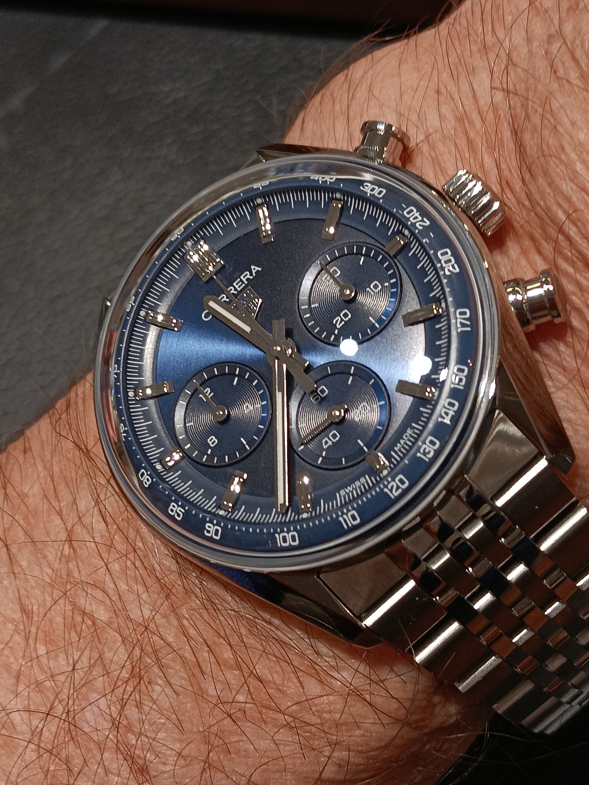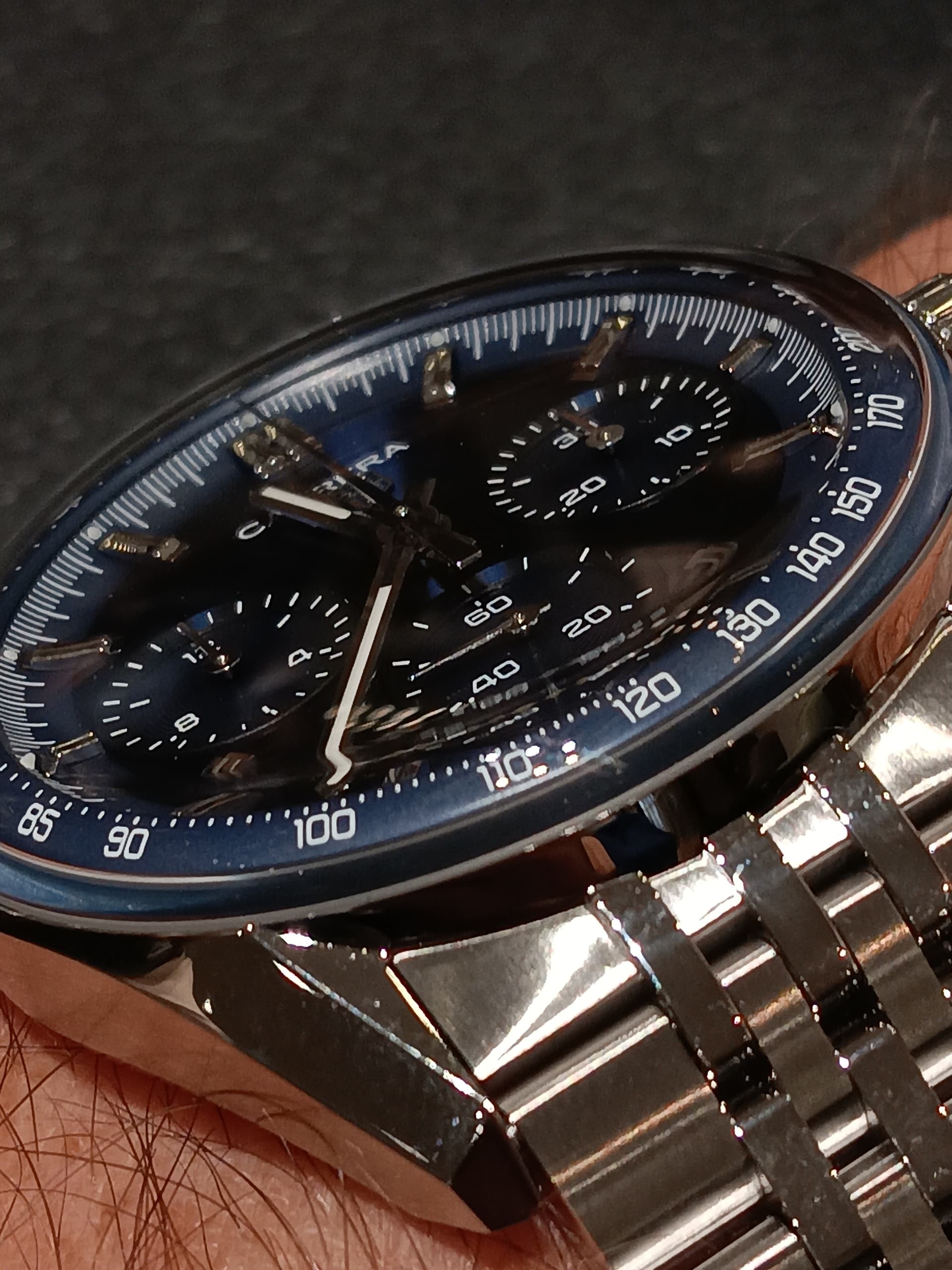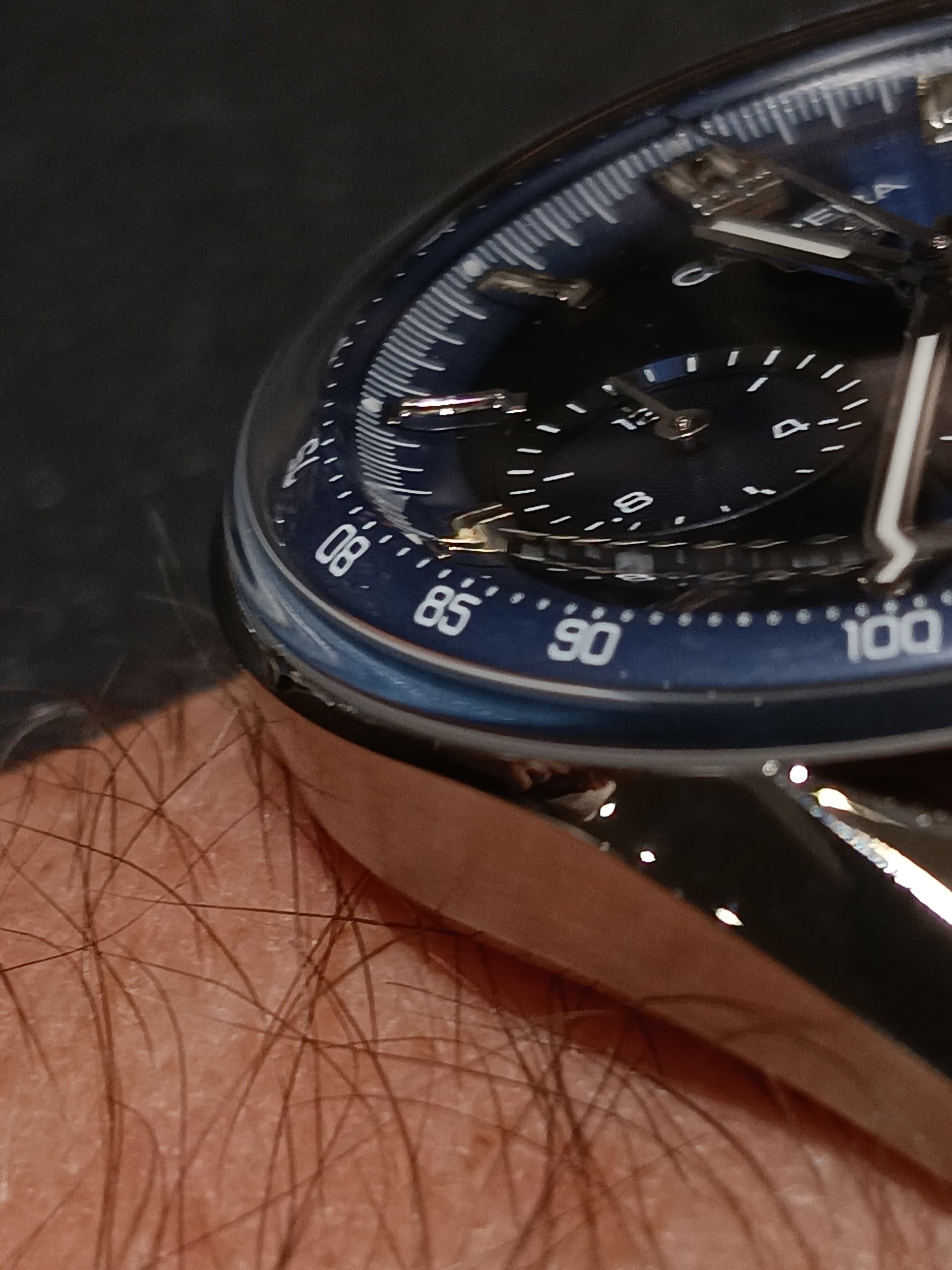 En de gebolde rand van het glas, met de gebolde wijzerplaat voor de tachymeterschaal is wat mij betreft het mooiste detail.