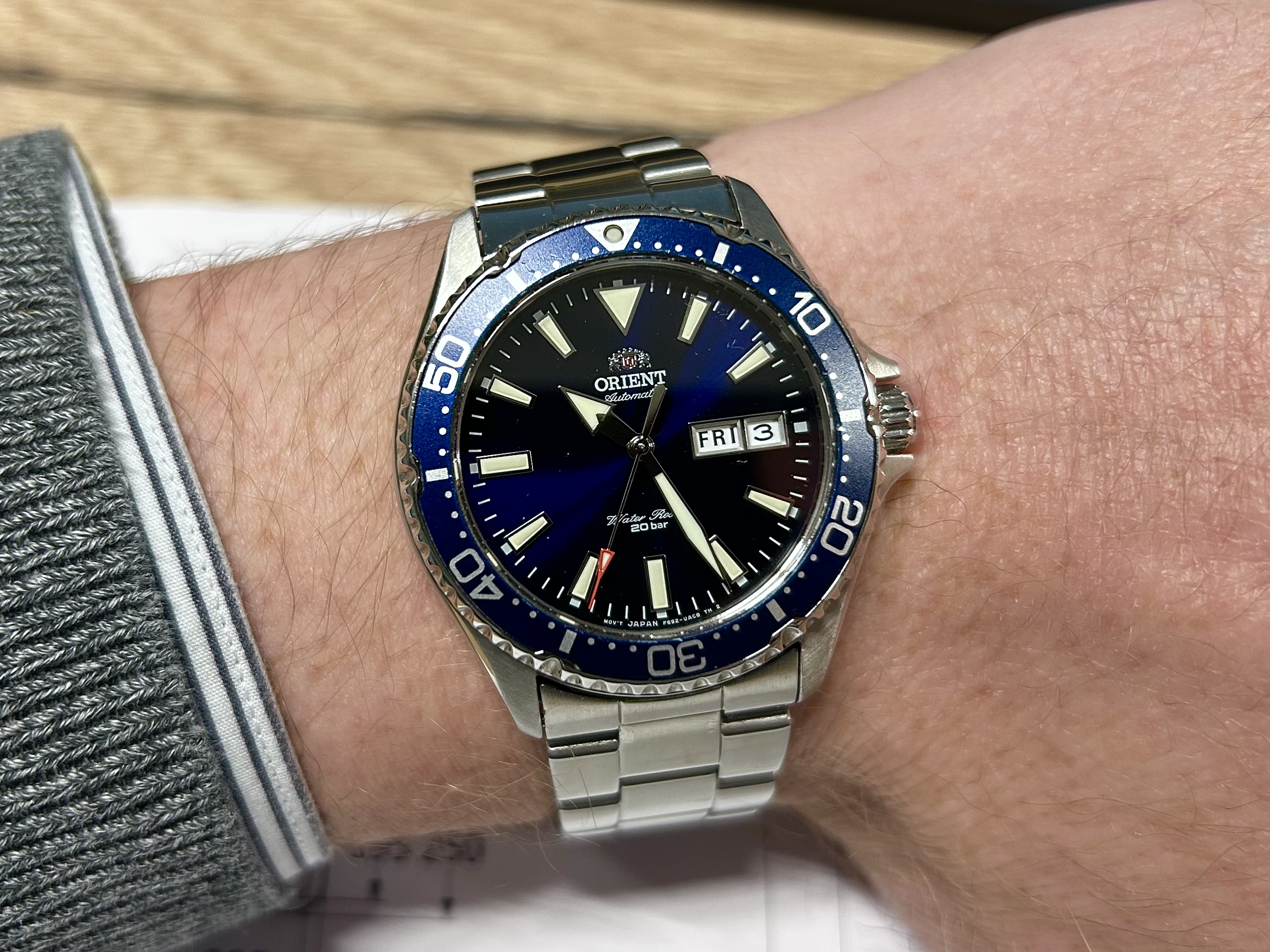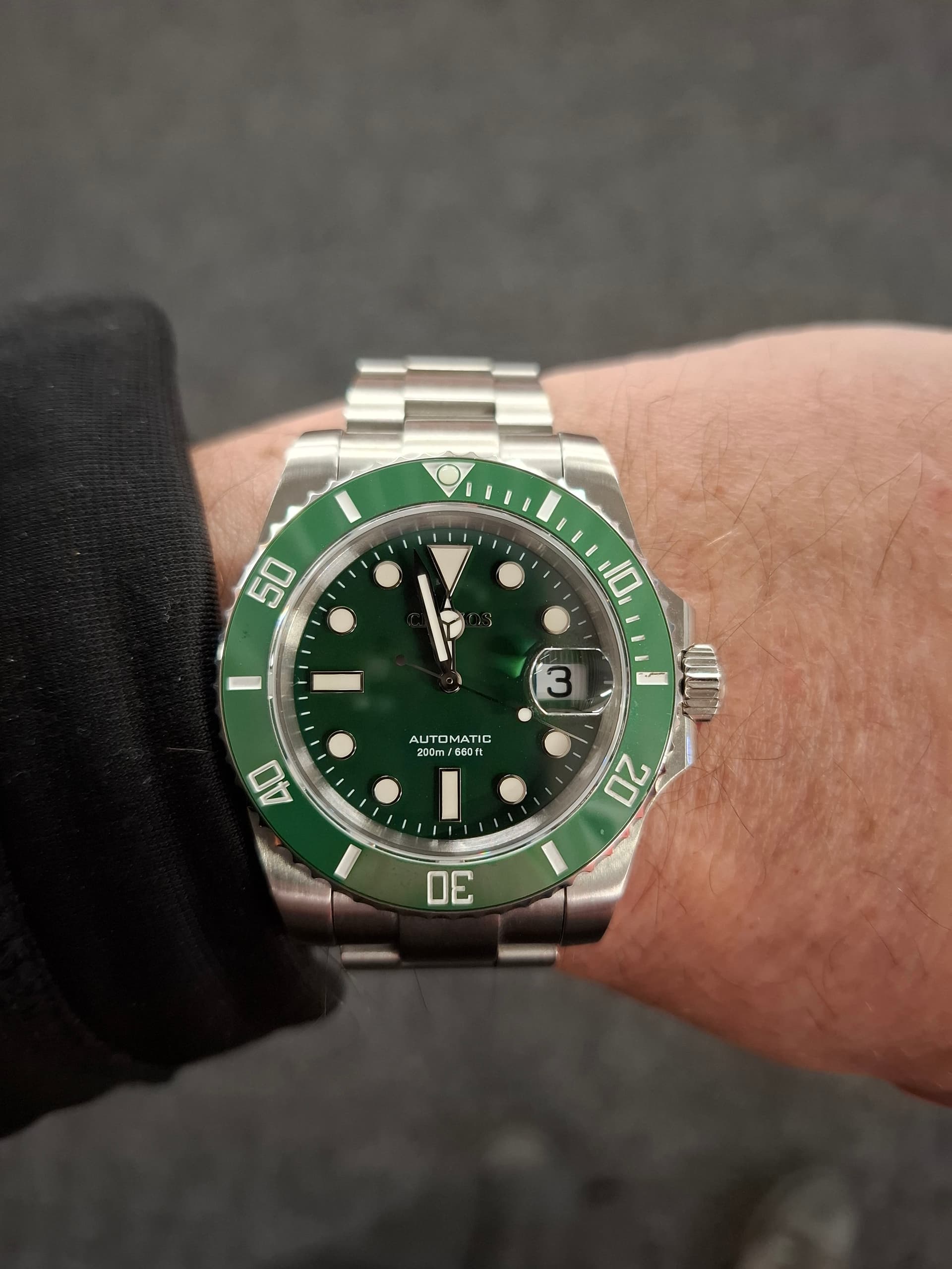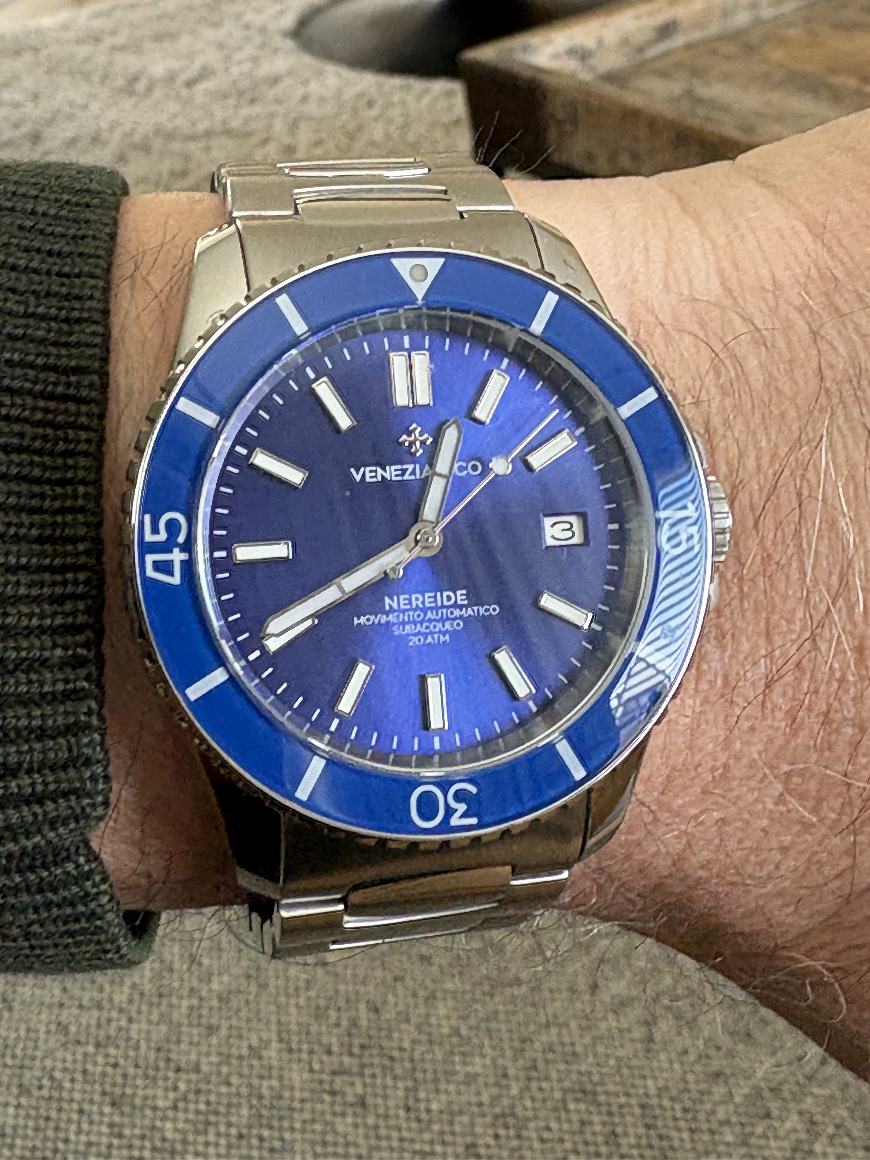 Ik vind het zeker een tof horloge. Deze is de 40mm SPB465, 46mm L2L. Zeer draagbaar op mijn 17cm pols. De plaat is grijs/groen/bruin door het patroon. Wijzers en indices zijn frosted wat een interessant effect geeft tov de donkere plaat. De band is zeer aangenaam met boonvormige links en hidden butterfly sluiting. Ze zijn met deze lijn voor understated gegaan en dat zint mij wel.