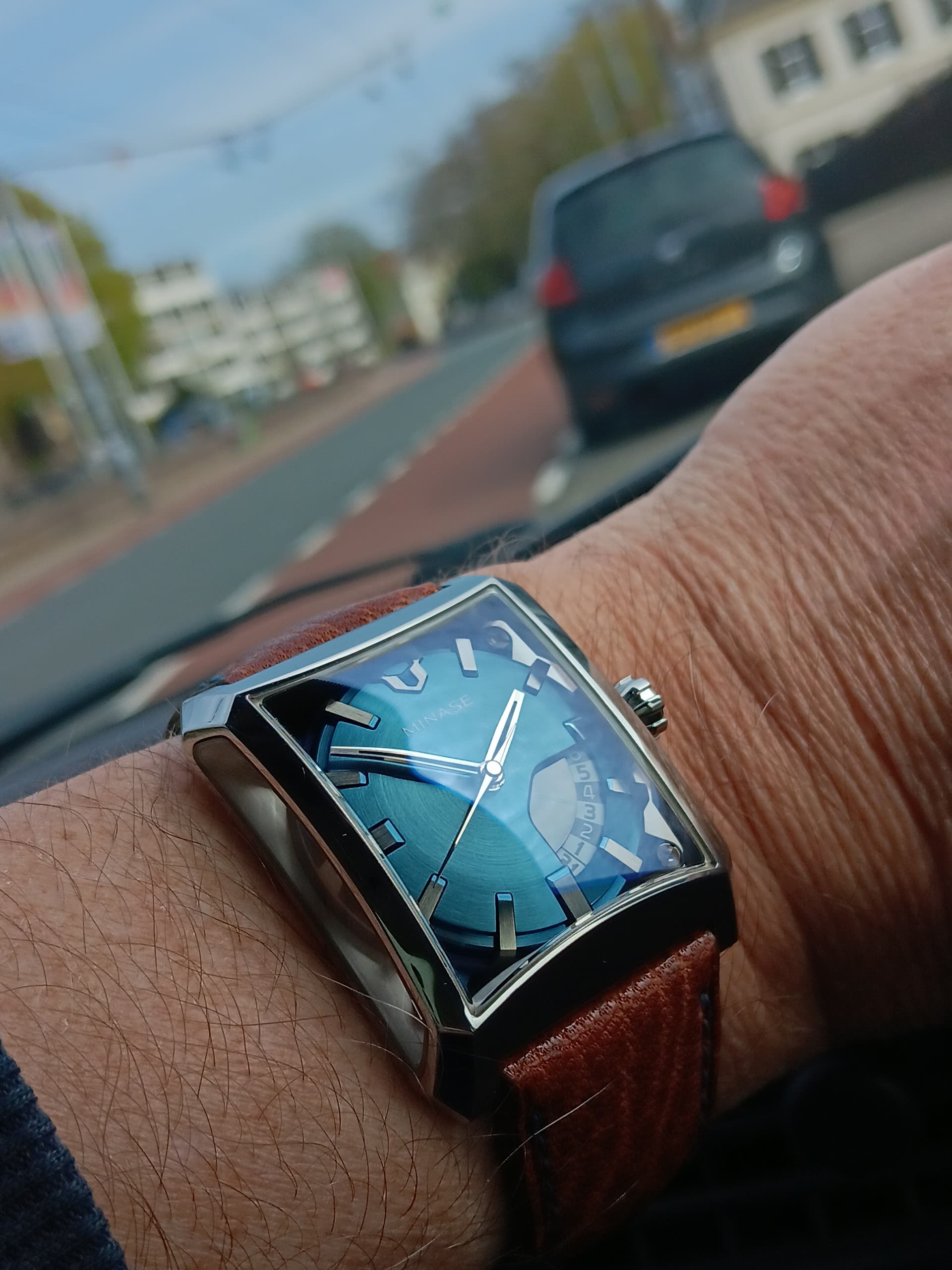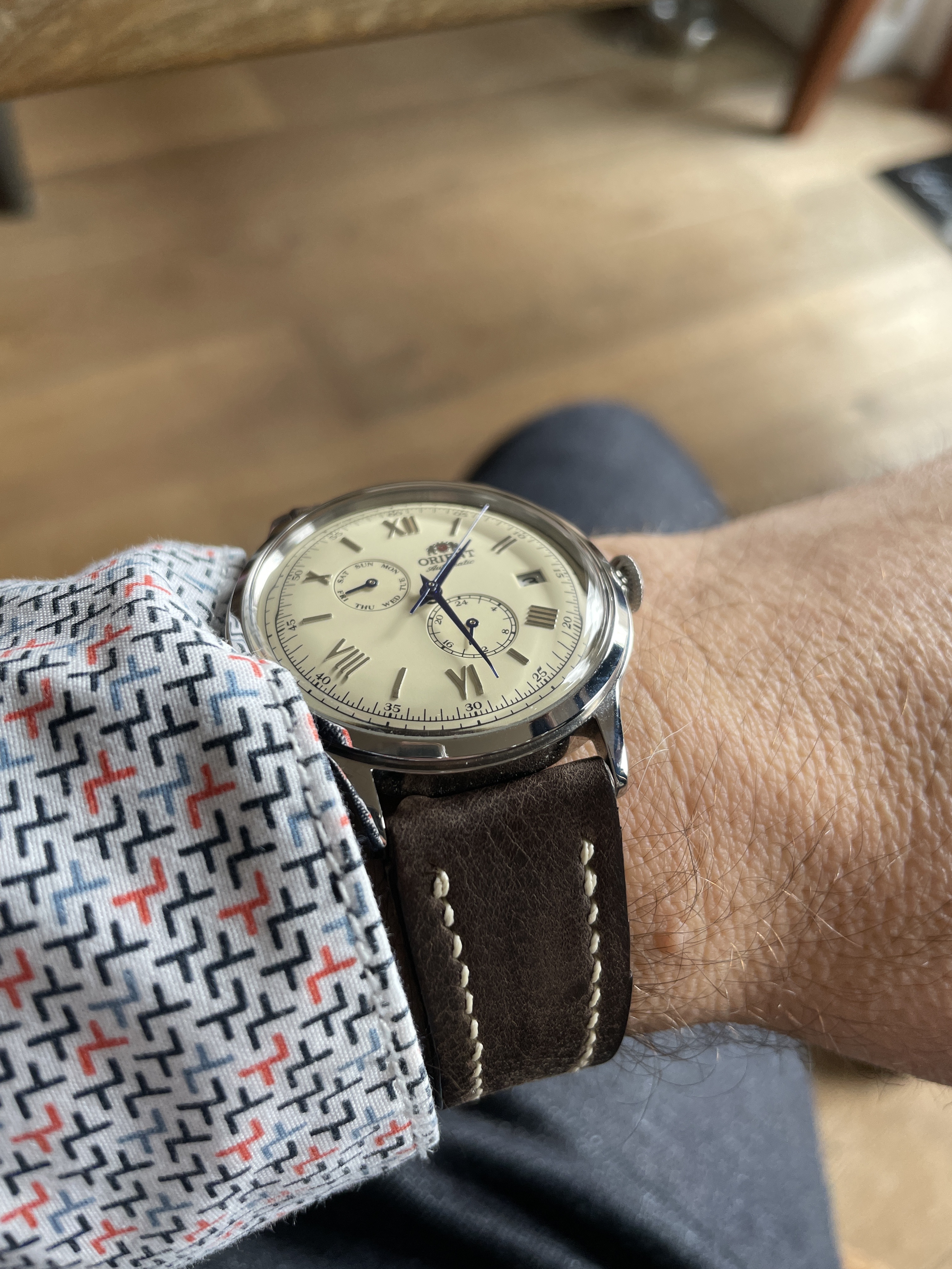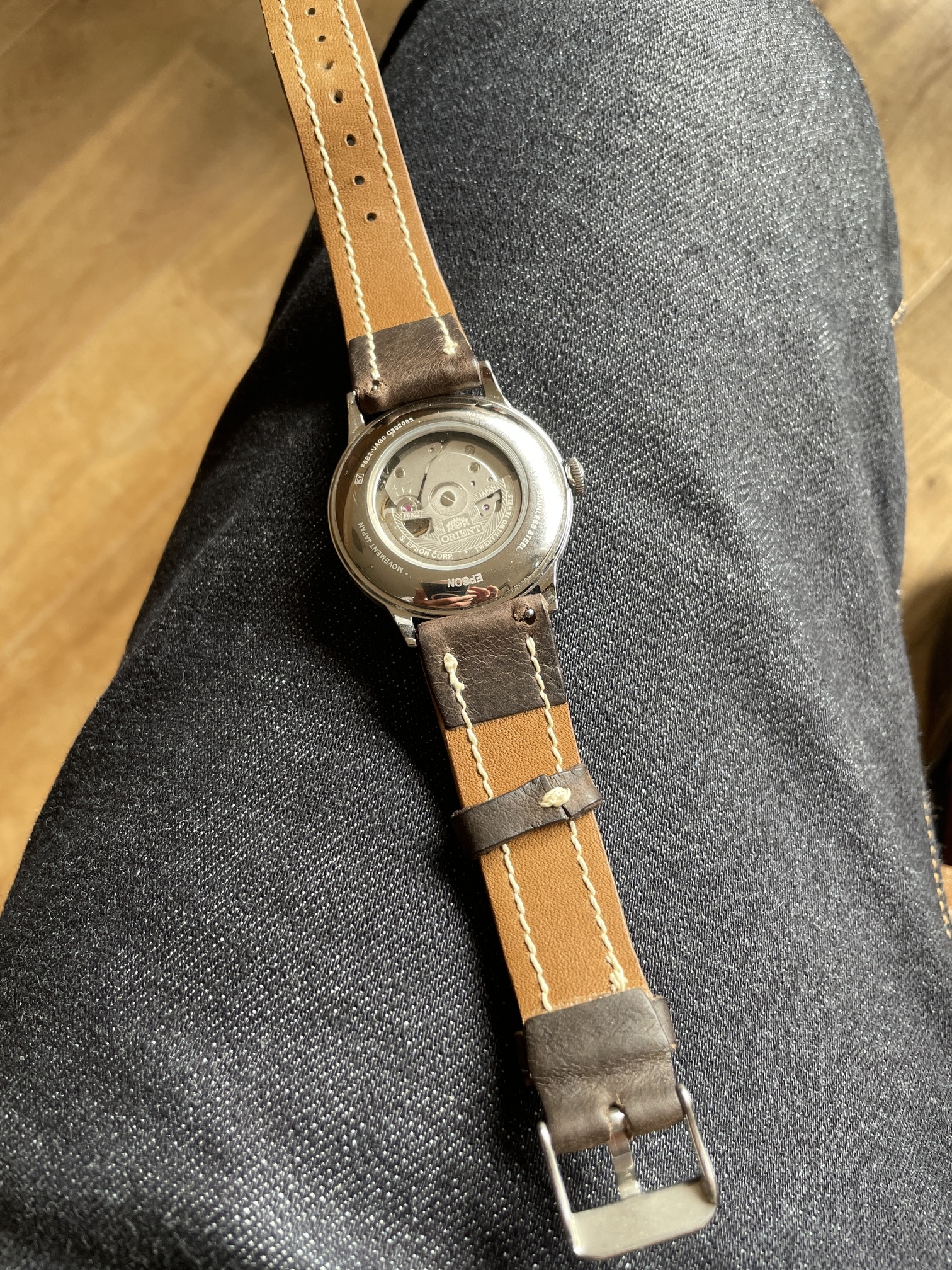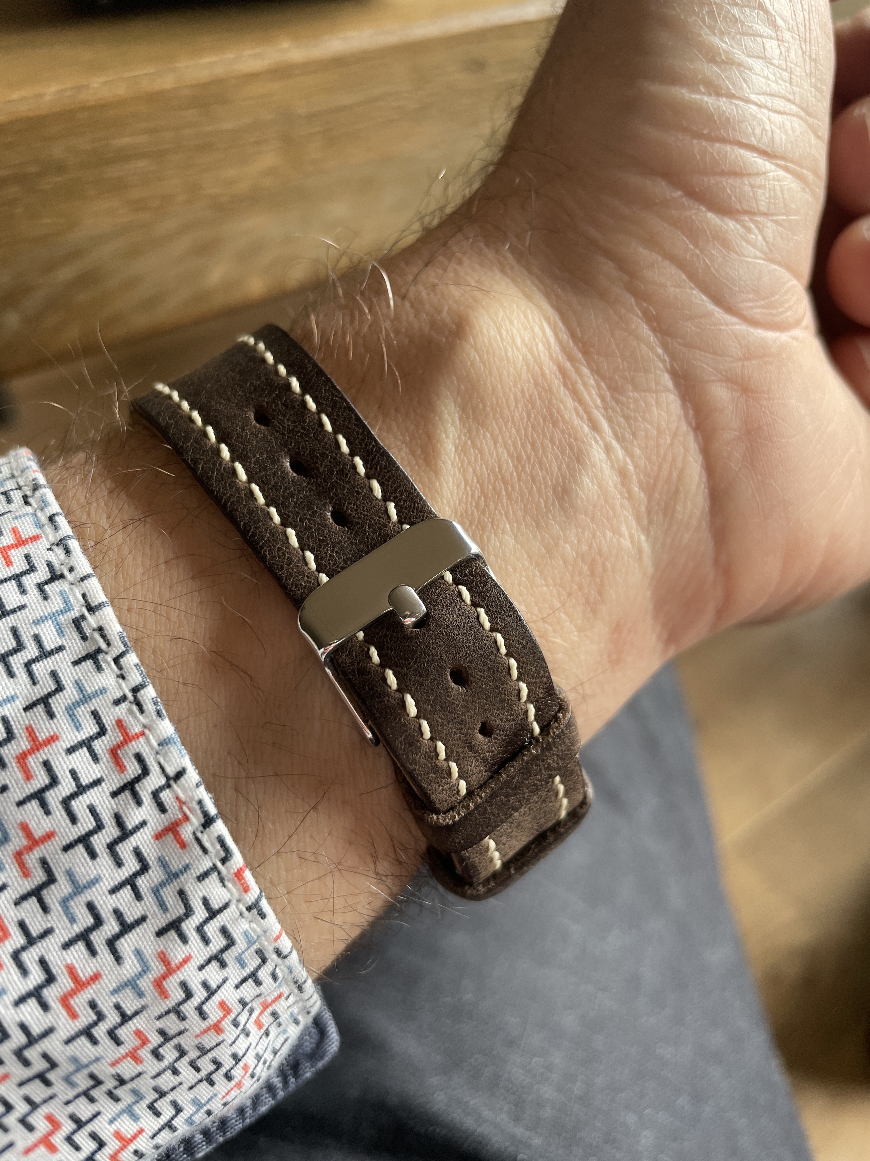 Mn Bambino weer een keer om, op zelfgemaakte horlogeband van leer. Handgestikt met de (denk ik) wel bekende zadelsteek. En quick-release pins. Erg makkelijk verwisselen.![]()