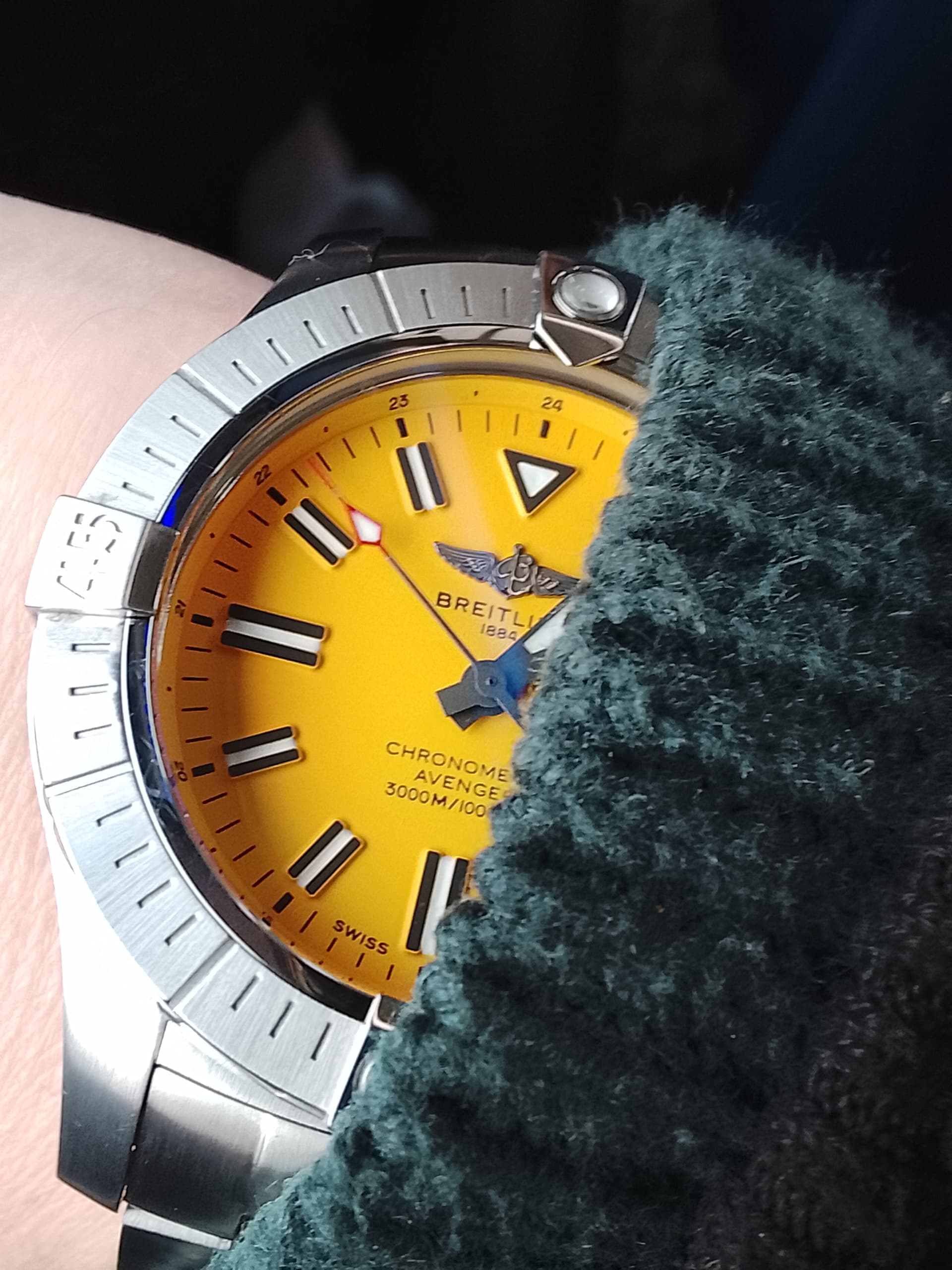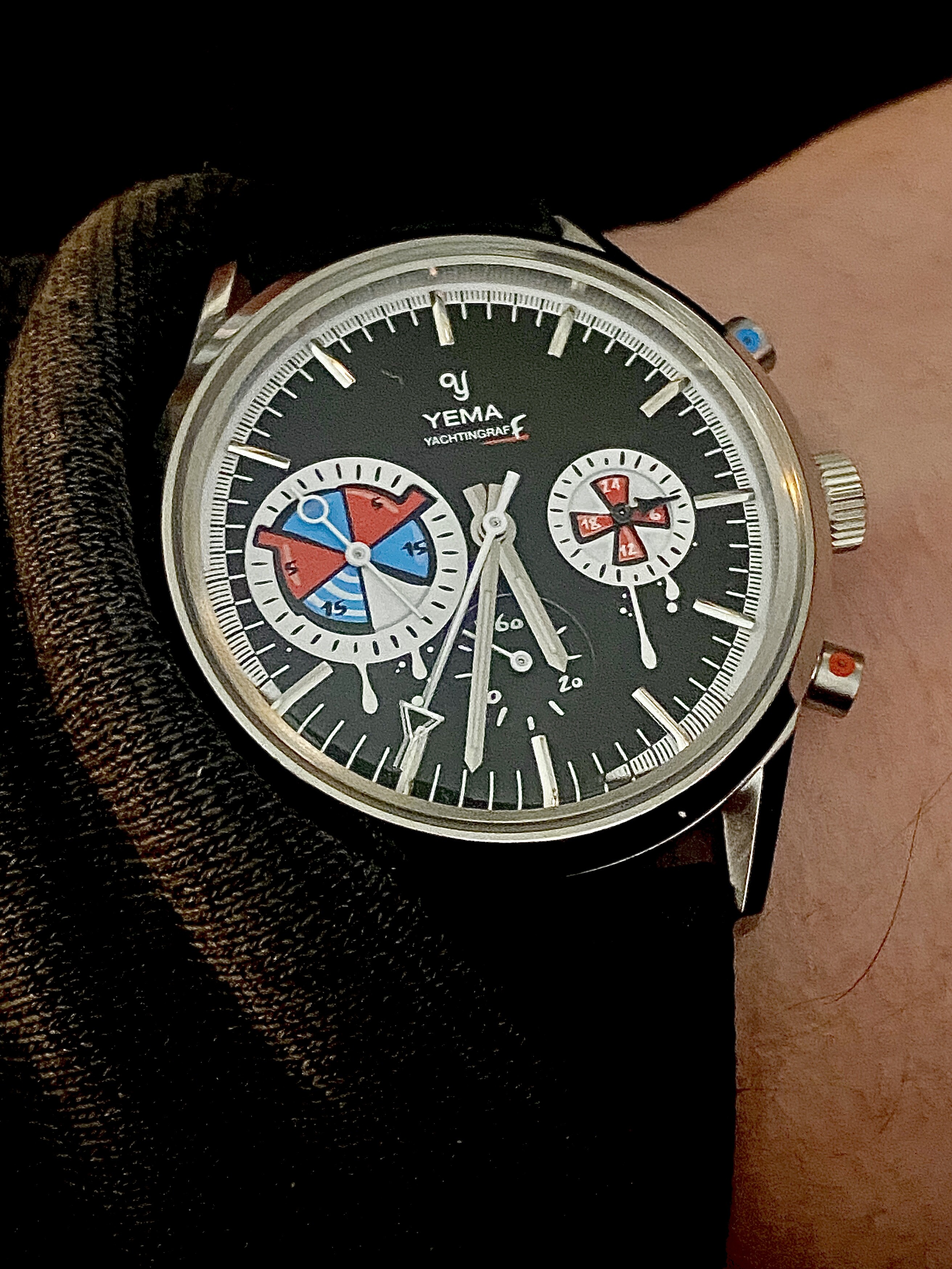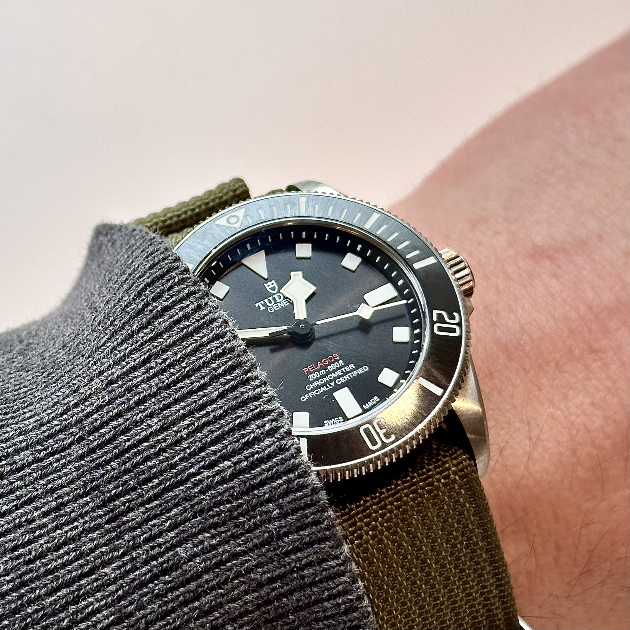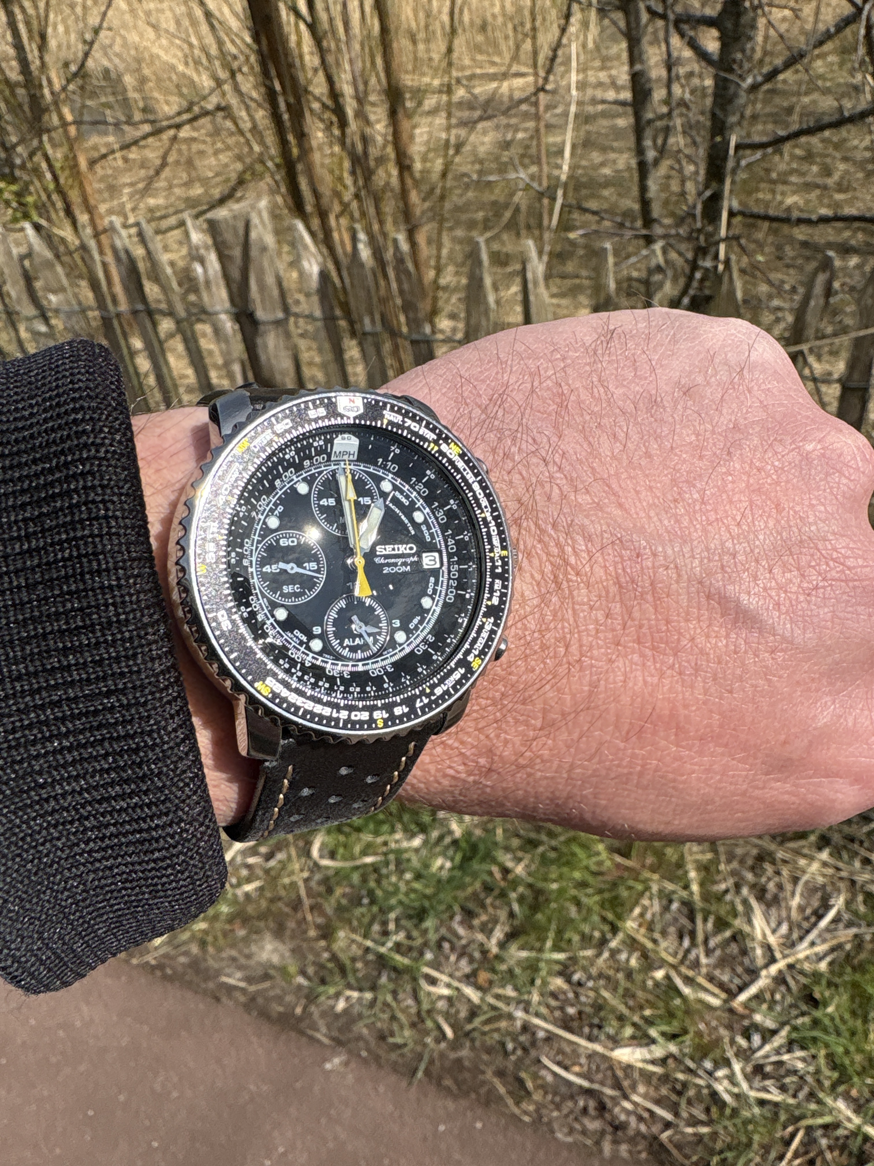 Mn Bambino weer een keer om, op zelfgemaakte horlogeband van leer. Handgestikt met de (denk ik) wel bekende zadelsteek. En quick-release pins. Erg makkelijk verwisselen.![]()