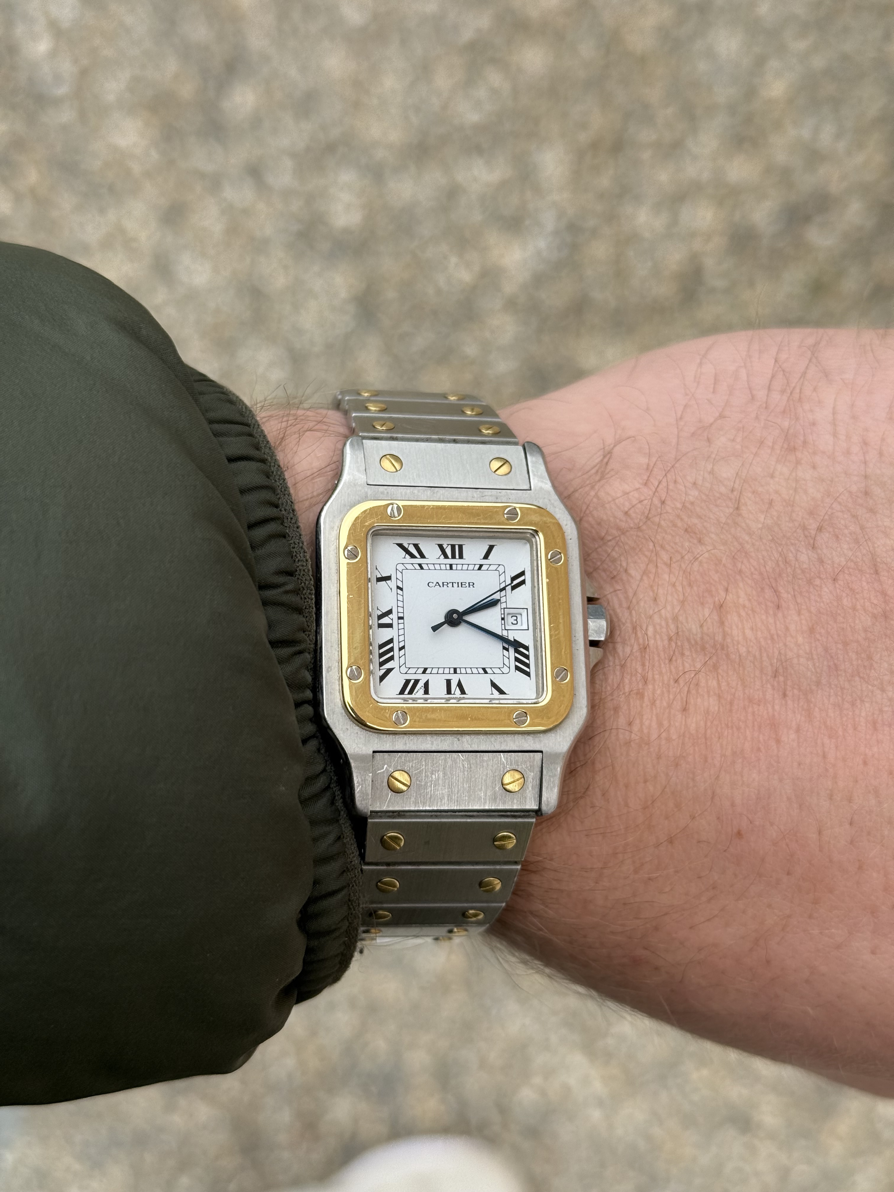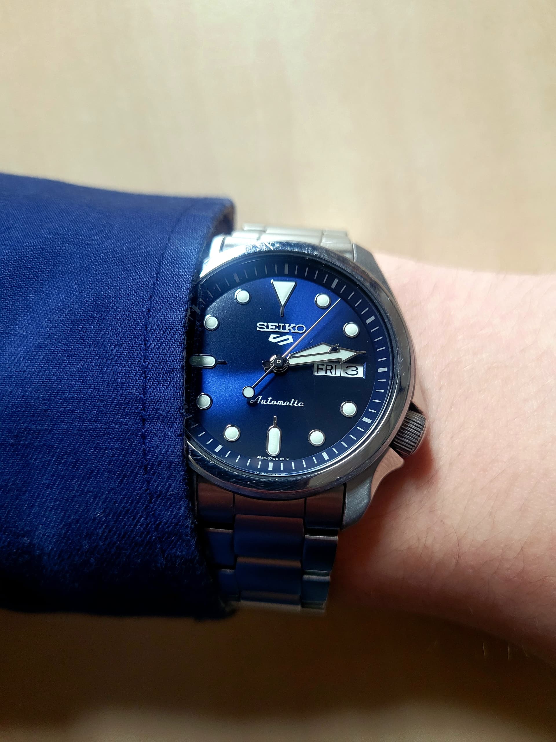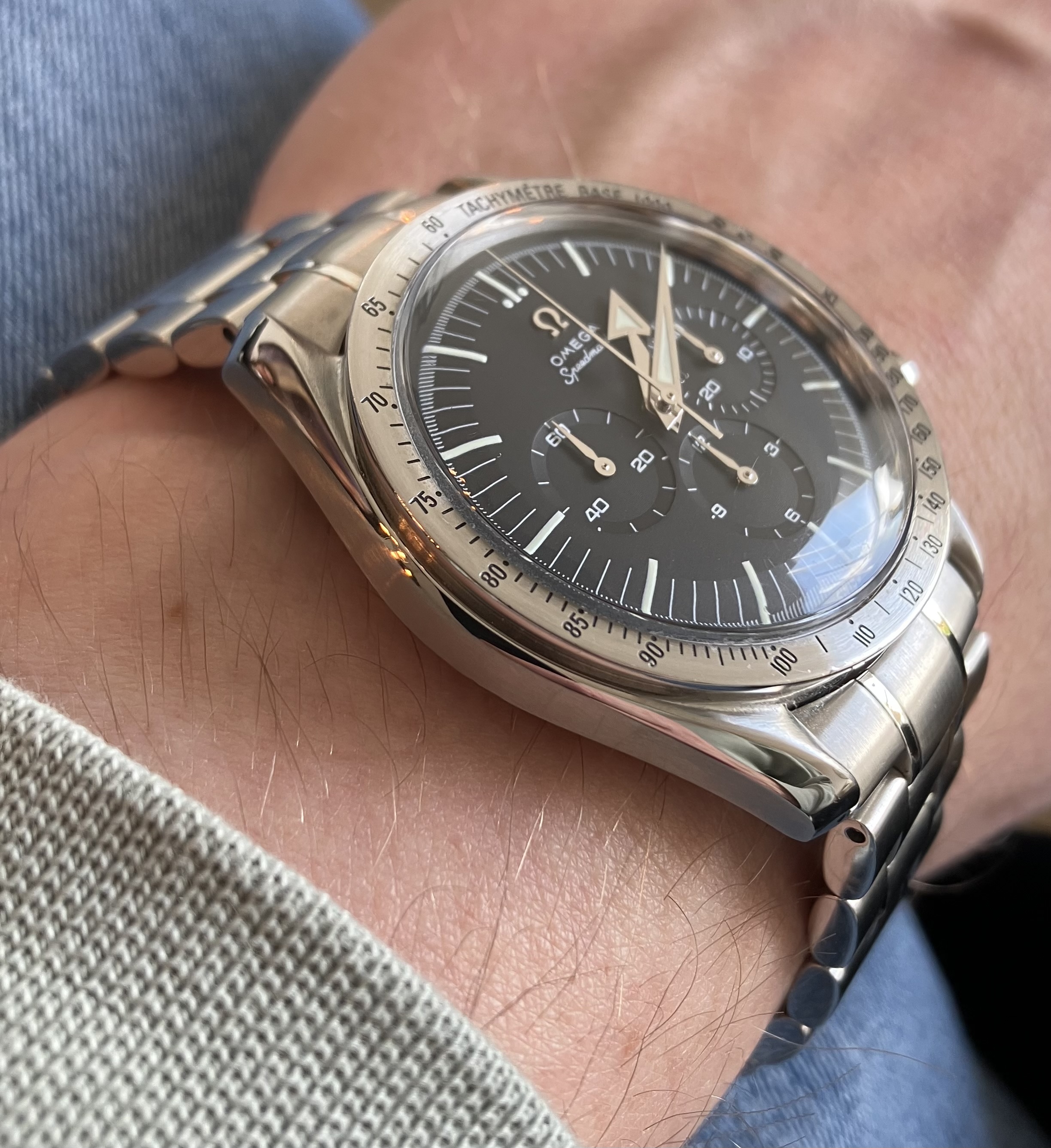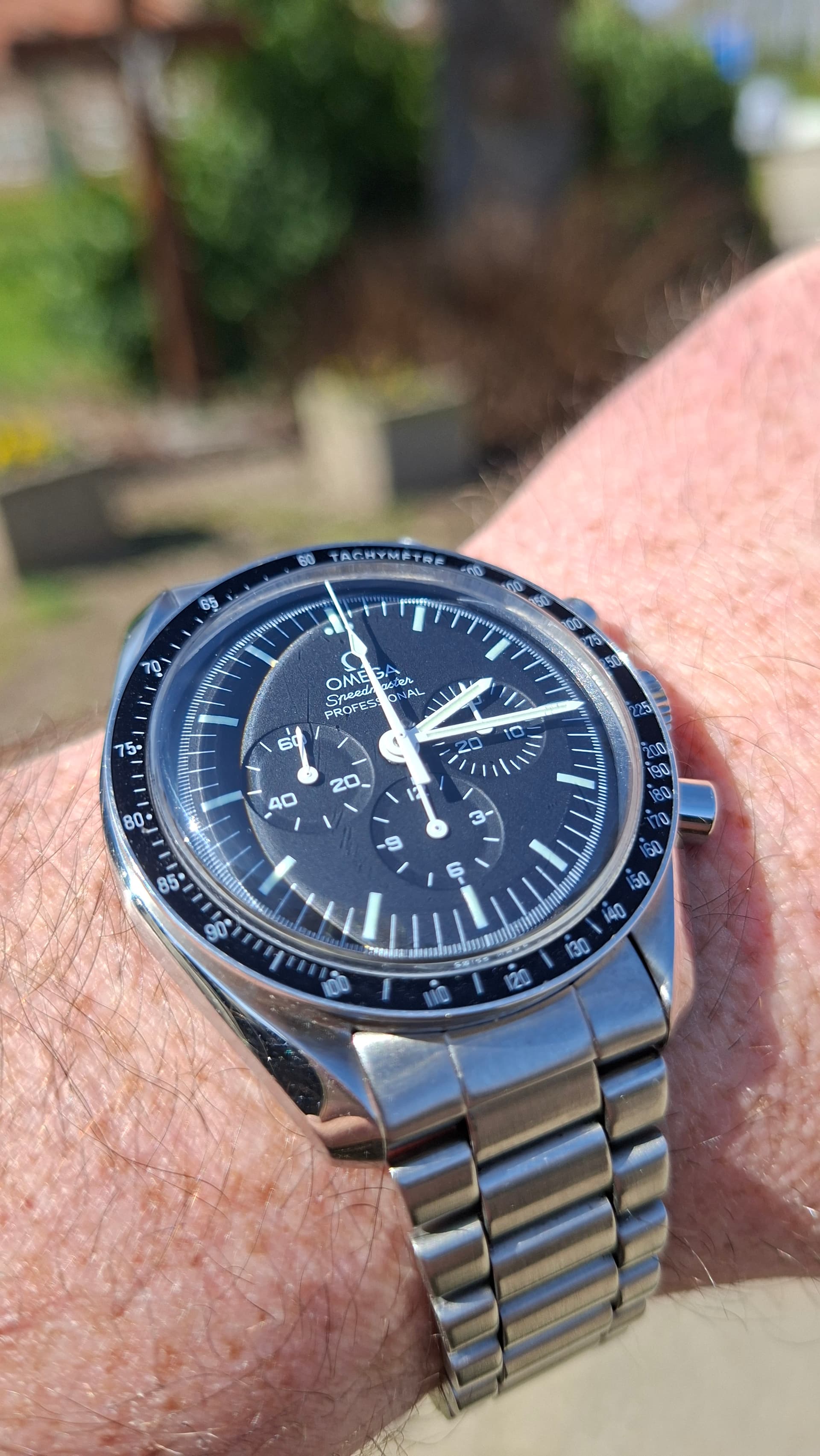 Mn Bambino weer een keer om, op zelfgemaakte horlogeband van leer. Handgestikt met de (denk ik) wel bekende zadelsteek. En quick-release pins. Erg makkelijk verwisselen.![]()