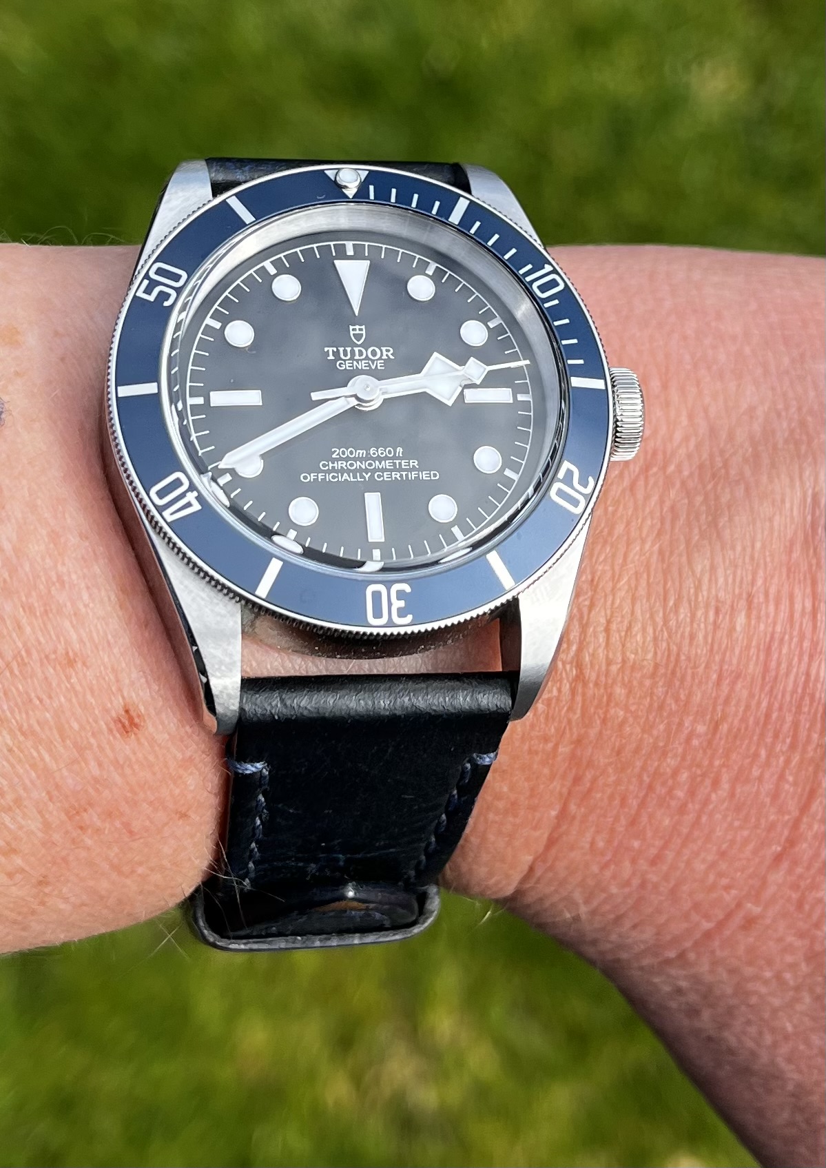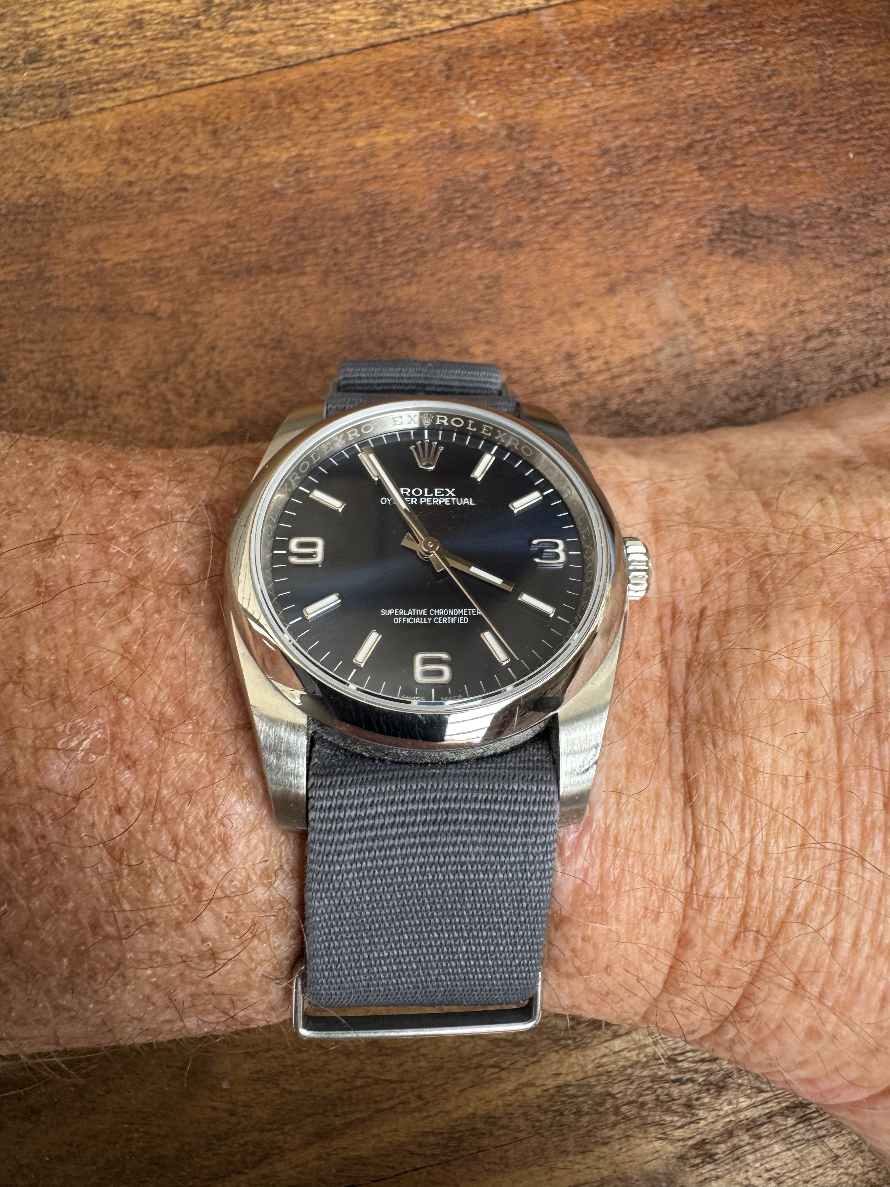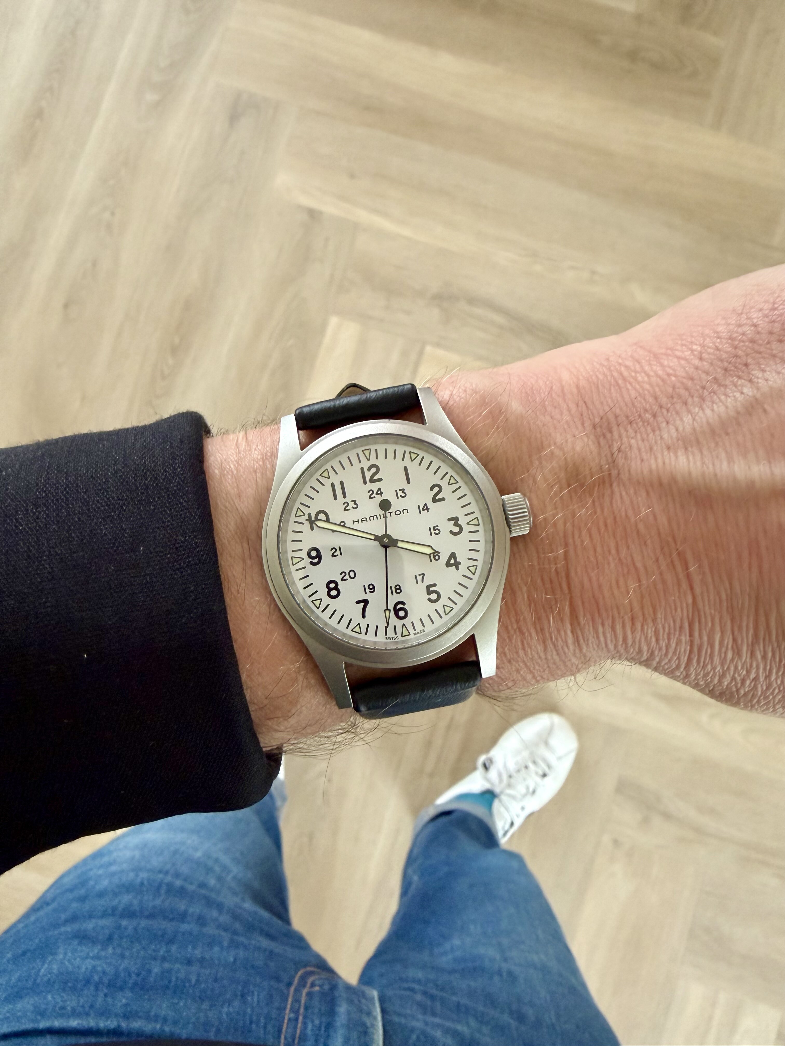 Bij binnenkomst op een basic zwarte Hirsch Toronto band gezet aangezien een OE NATO hem wat “bulky” maakt naar mijn mening.