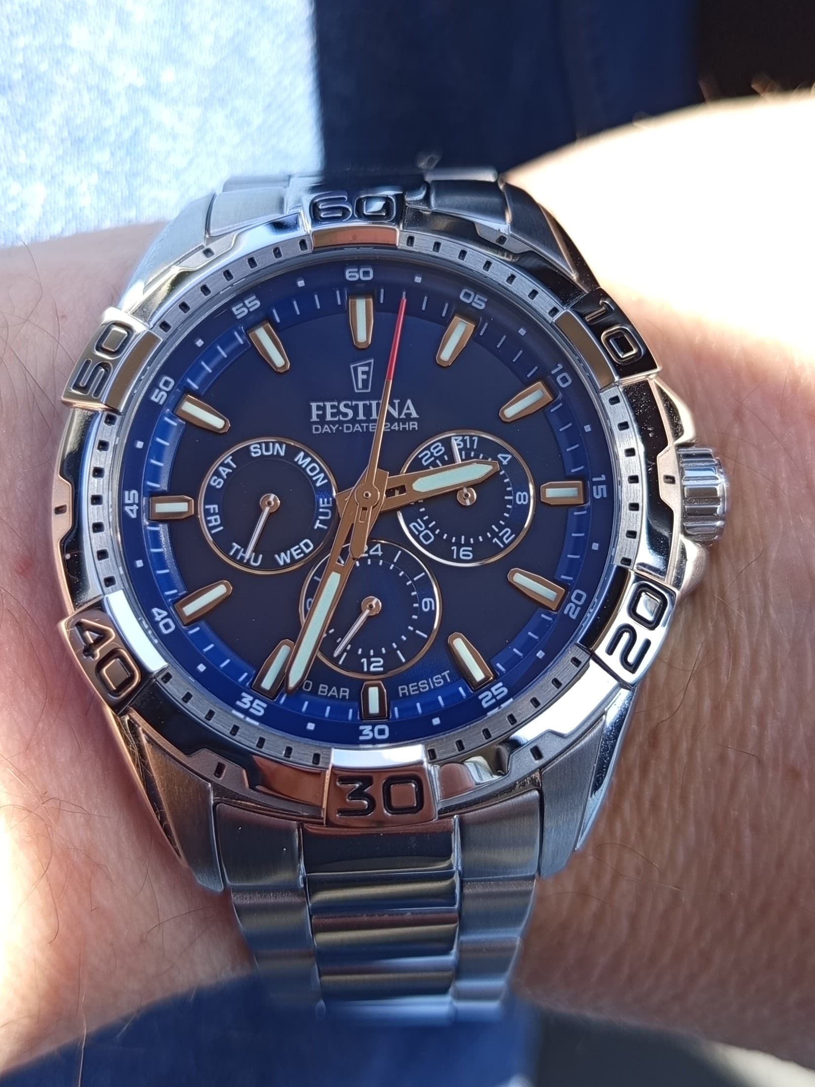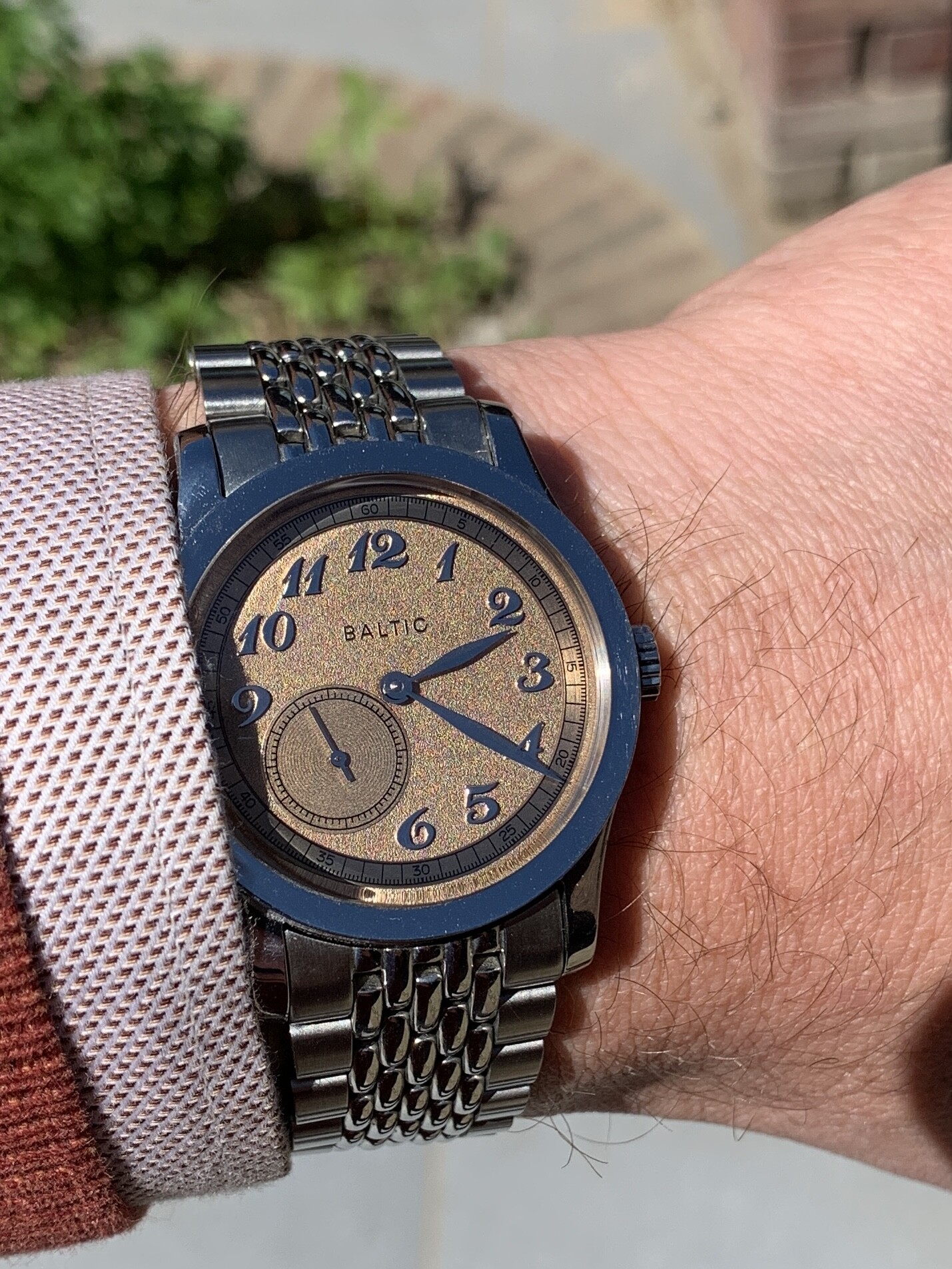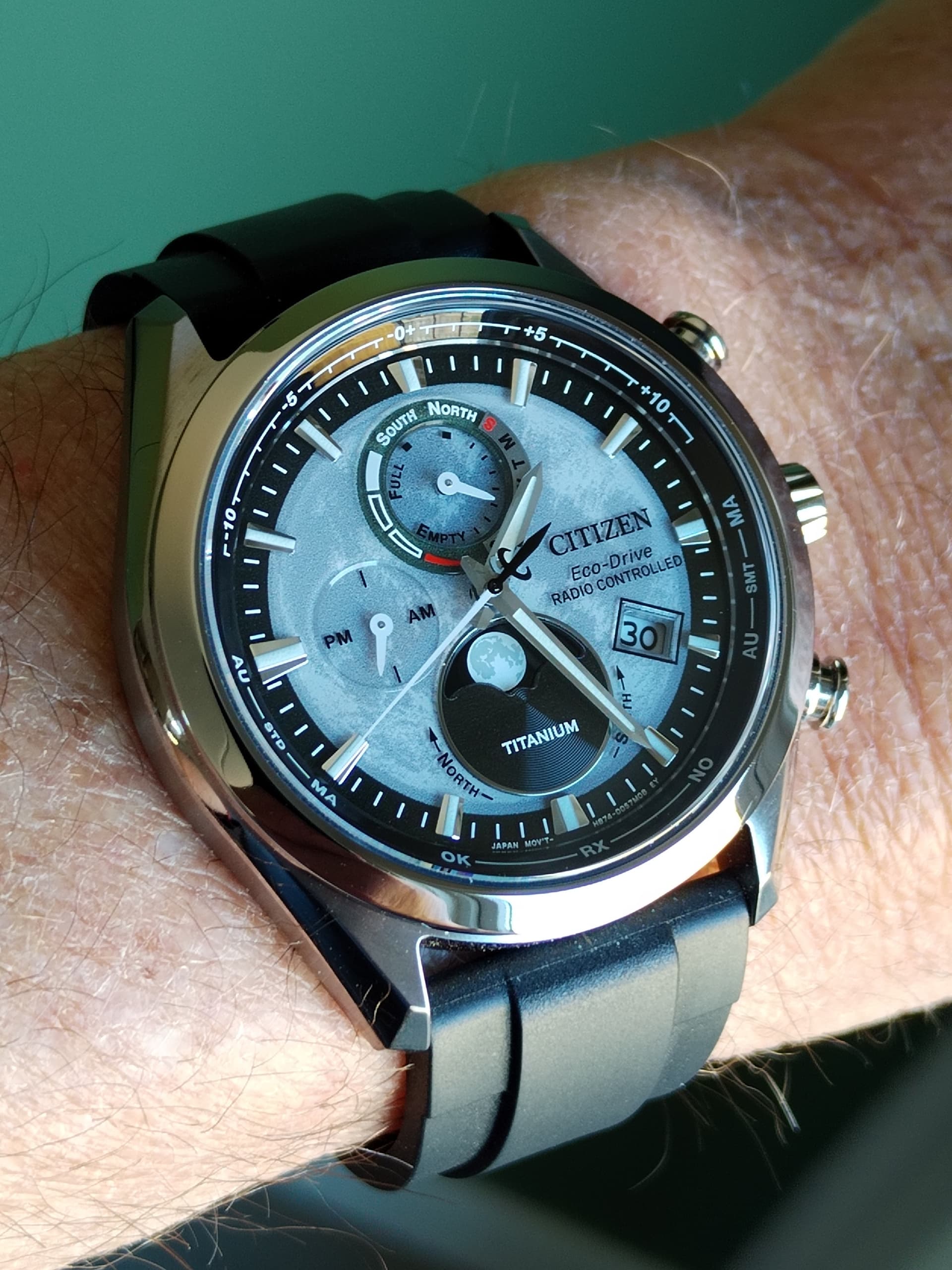 Naargelang de lichtinval is het center van de plaat donkerder of lichter dan de minutenschaal.