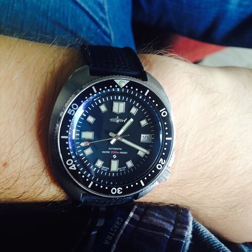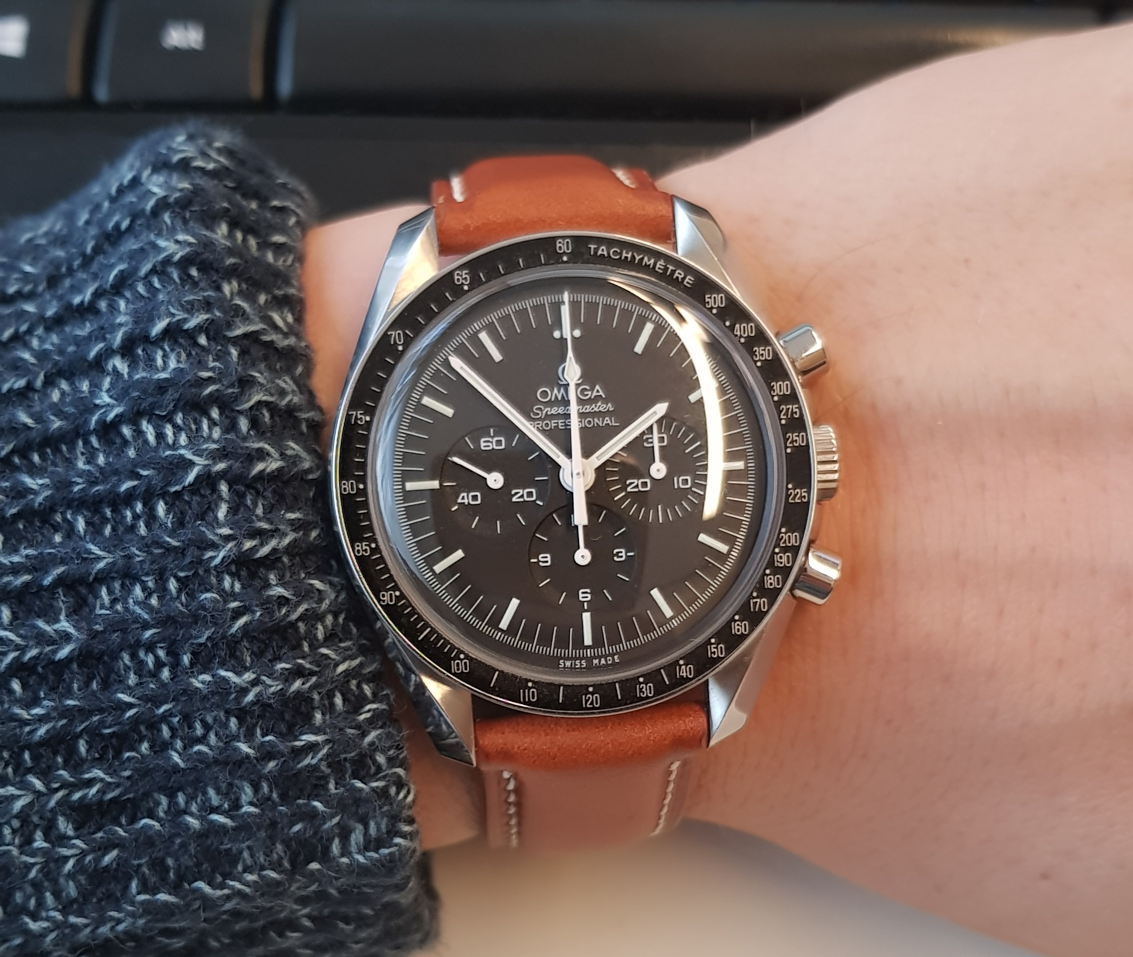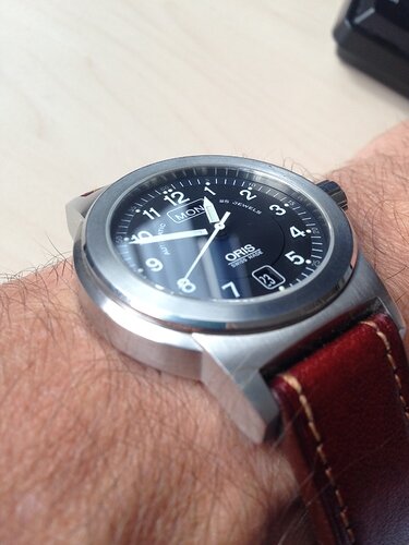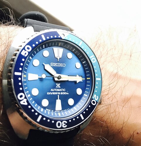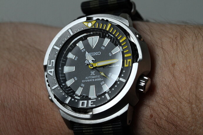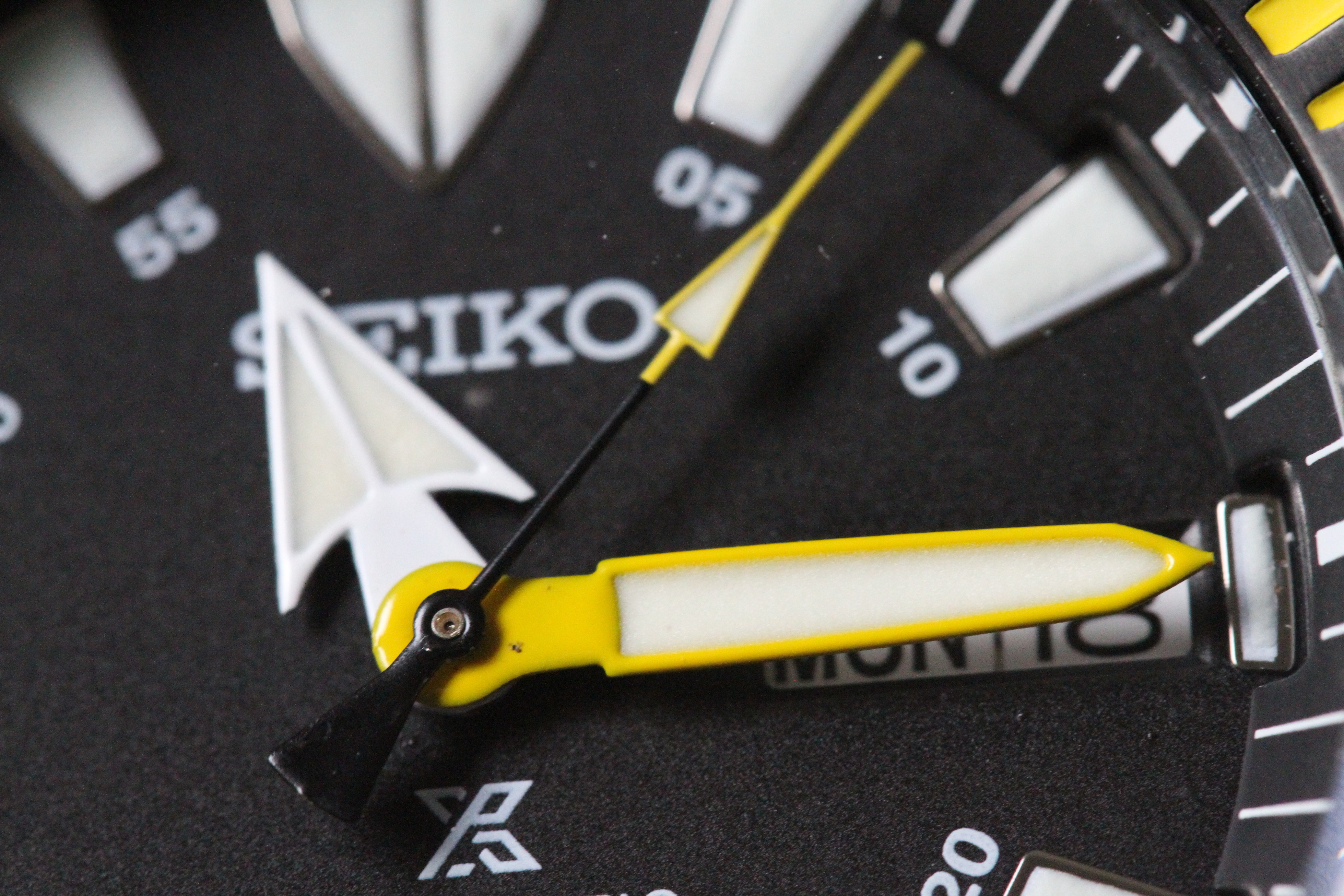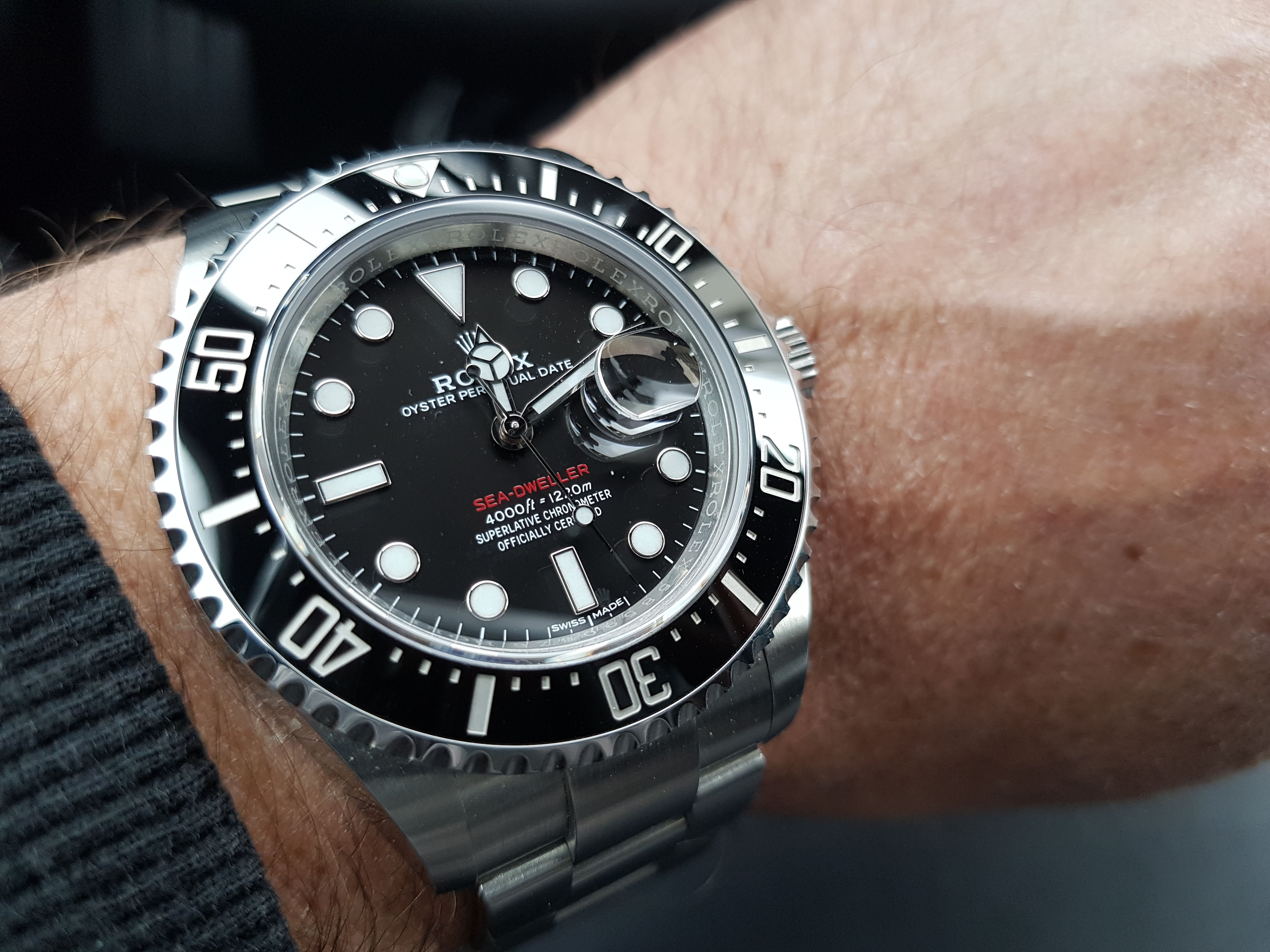 Er is nog een pikje waterschade te zien op de wijzer. Ook begint de zwarte PVD rand van de bezel al krasjes te vertonen.