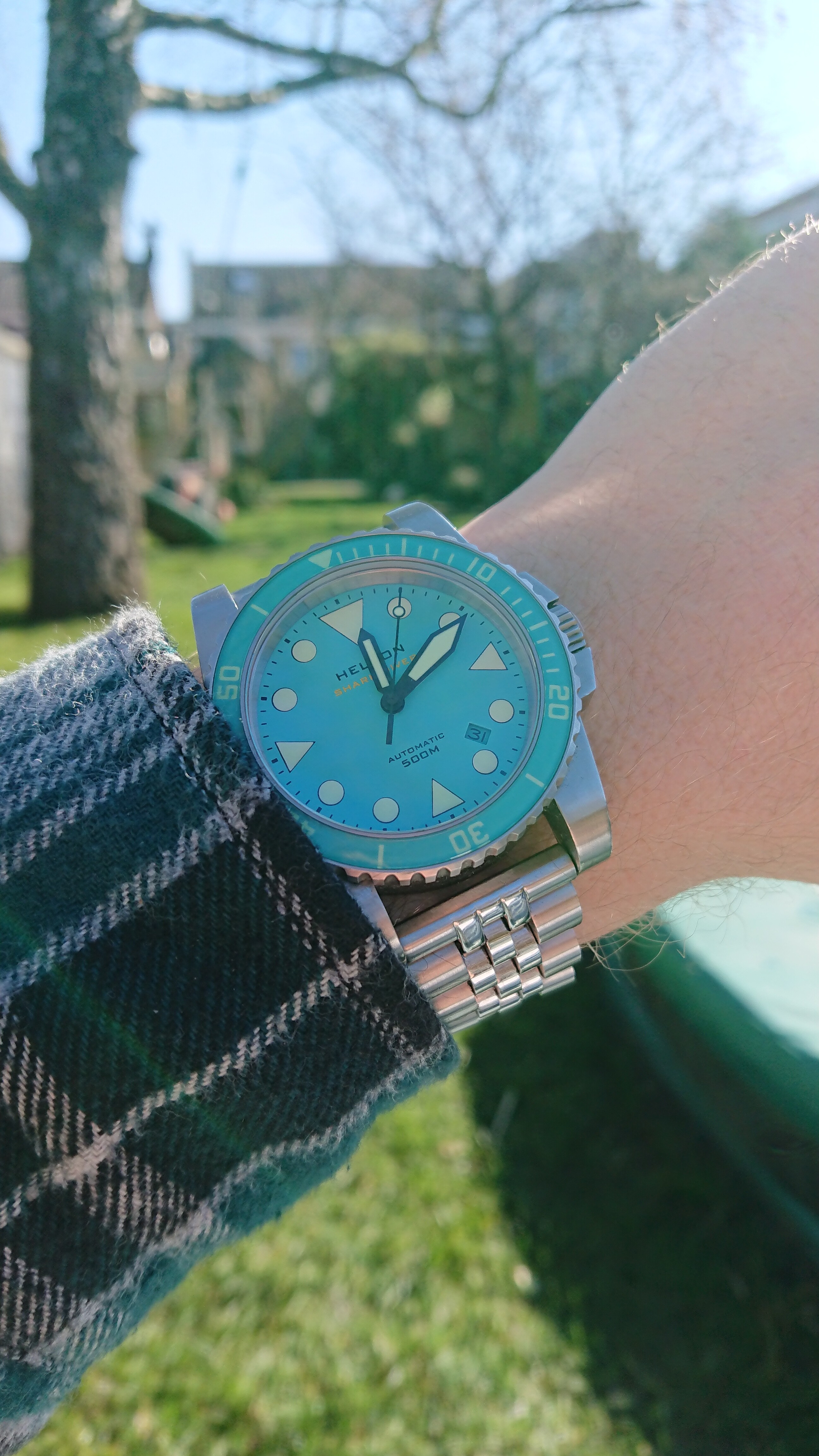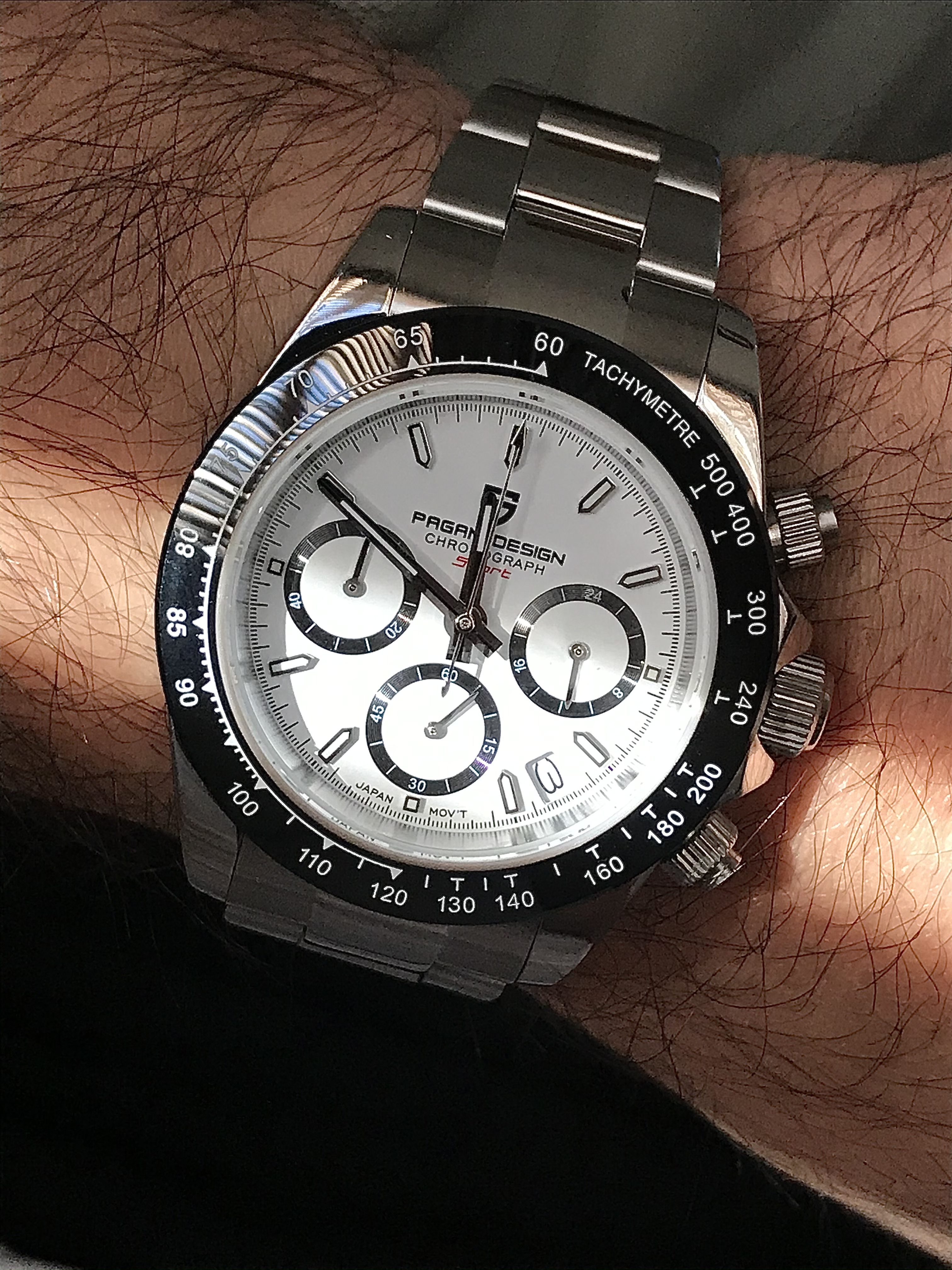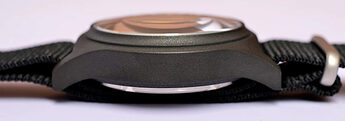 In een YouTube filmpje werd deze MWC homage met DLC coating getoond. Wekte mijn interesse omdat zwarte horloges met PVD coating wel heel snel beschadigen en ‘lelijk’ worden. Voor 1/3 van de prijs van de MWC kon ik het niet laten eentje te bestellen.