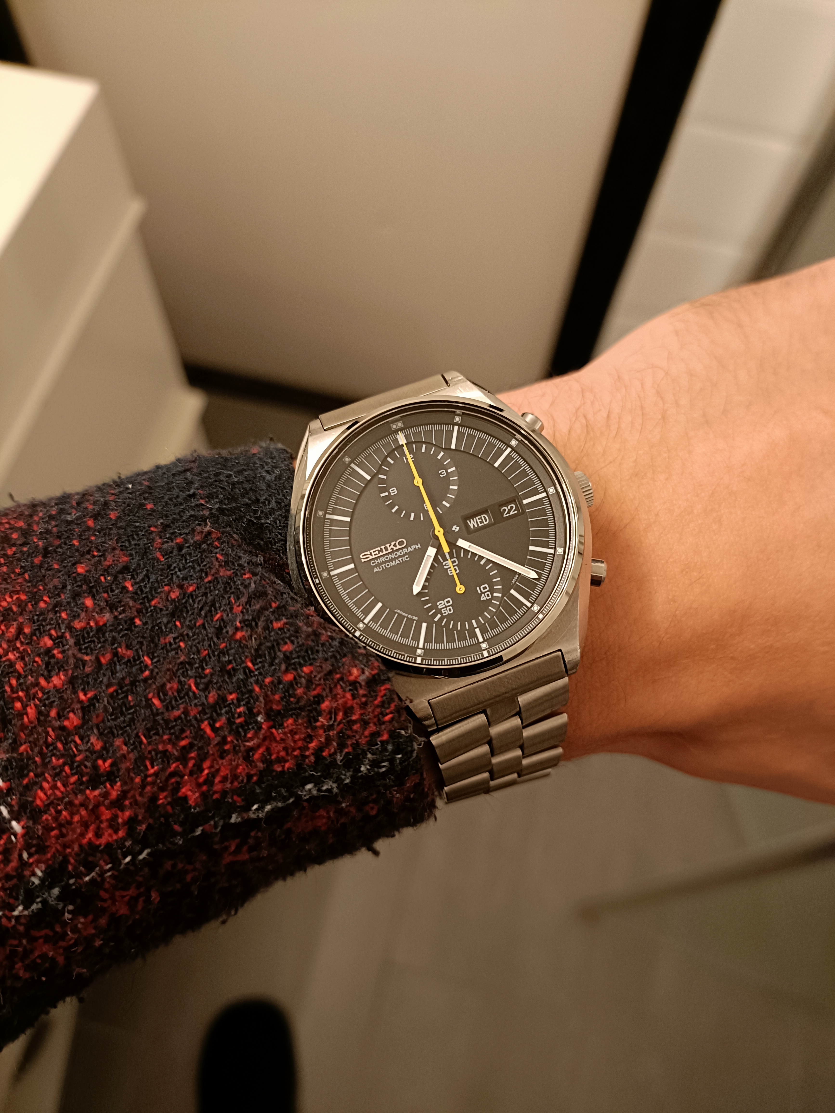 Is een Seiko mod Ferry, gelaserde titanium wijzerplaat in een Seiko SNZG07K1. De plaat is gemaakt naar de schildering Great wave off Kanagawa van Hokusai. Ik was altijd al een groot bewonderaar van het werk van Hokusai en toen ik deze door @Cihanski aangeboden zag hen ik gelijk toegegrepen