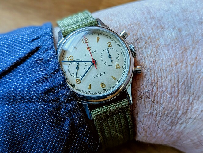 Nee toevallig op de kop kunnen tikken in Japan, was een zogenaamd ‘incompleet’ horloge. Heeft ook de nodige tikken gehad rondom maar hij liep nog goed en met een leuke Nato leek het me wel een leuke beater.