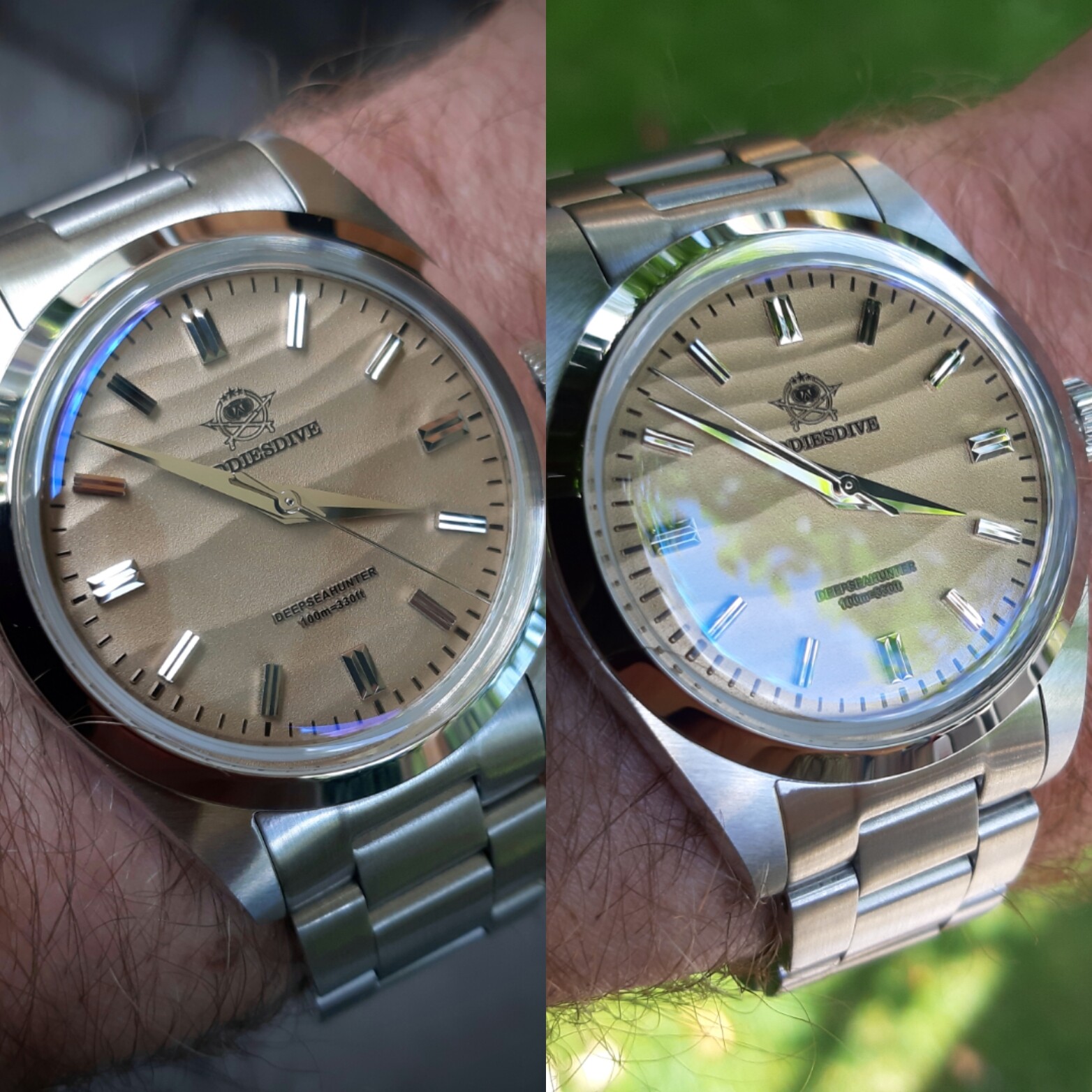 Dankje! Deze heeft een zandkleur, maar speelt inderdaad heel mooi met lichtinval. Erg leuke dial!