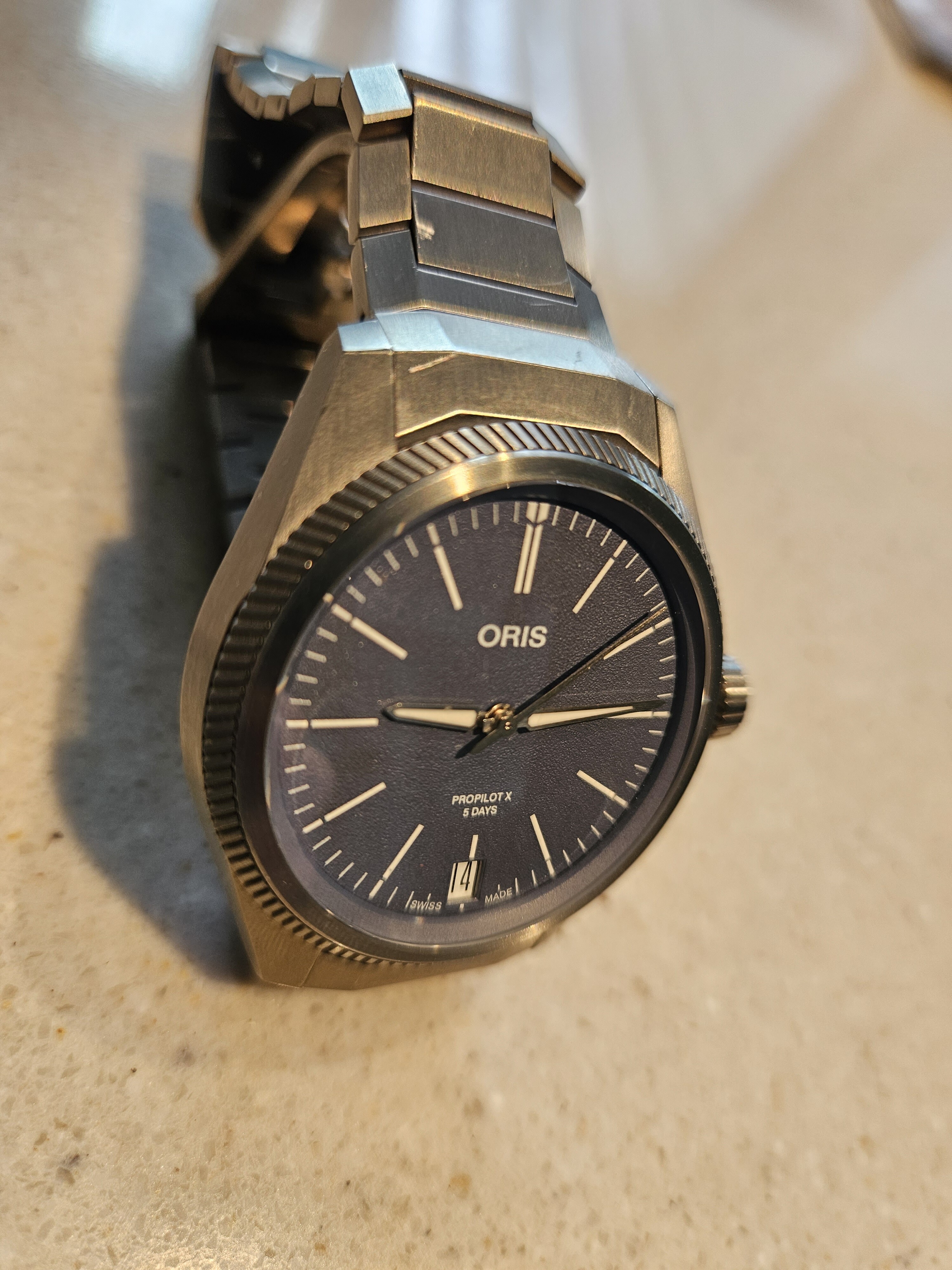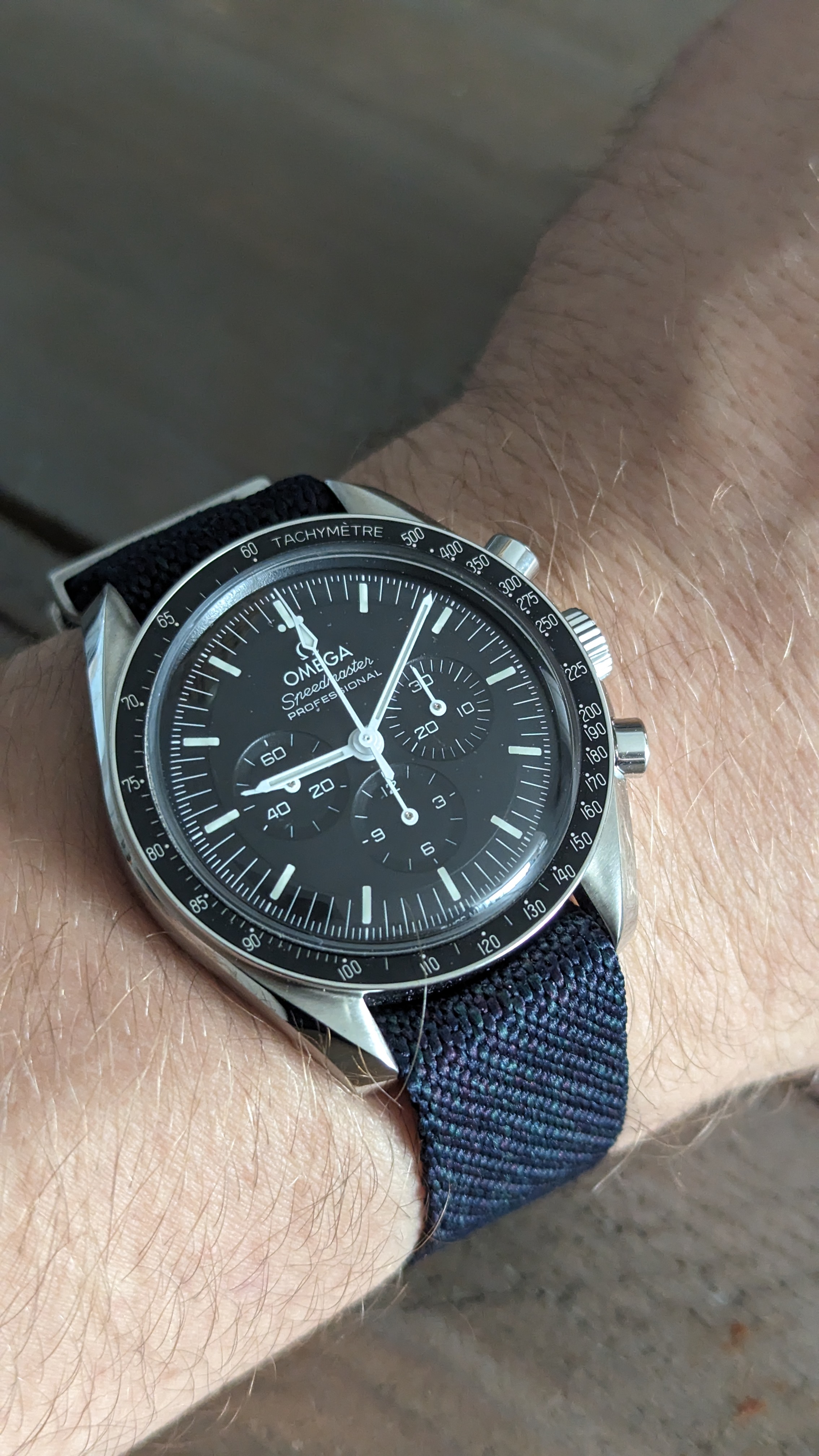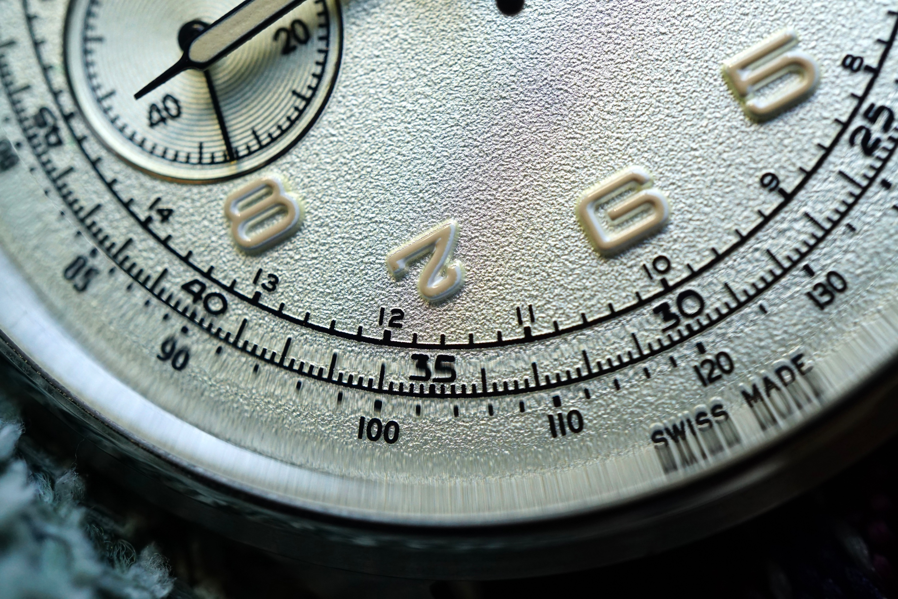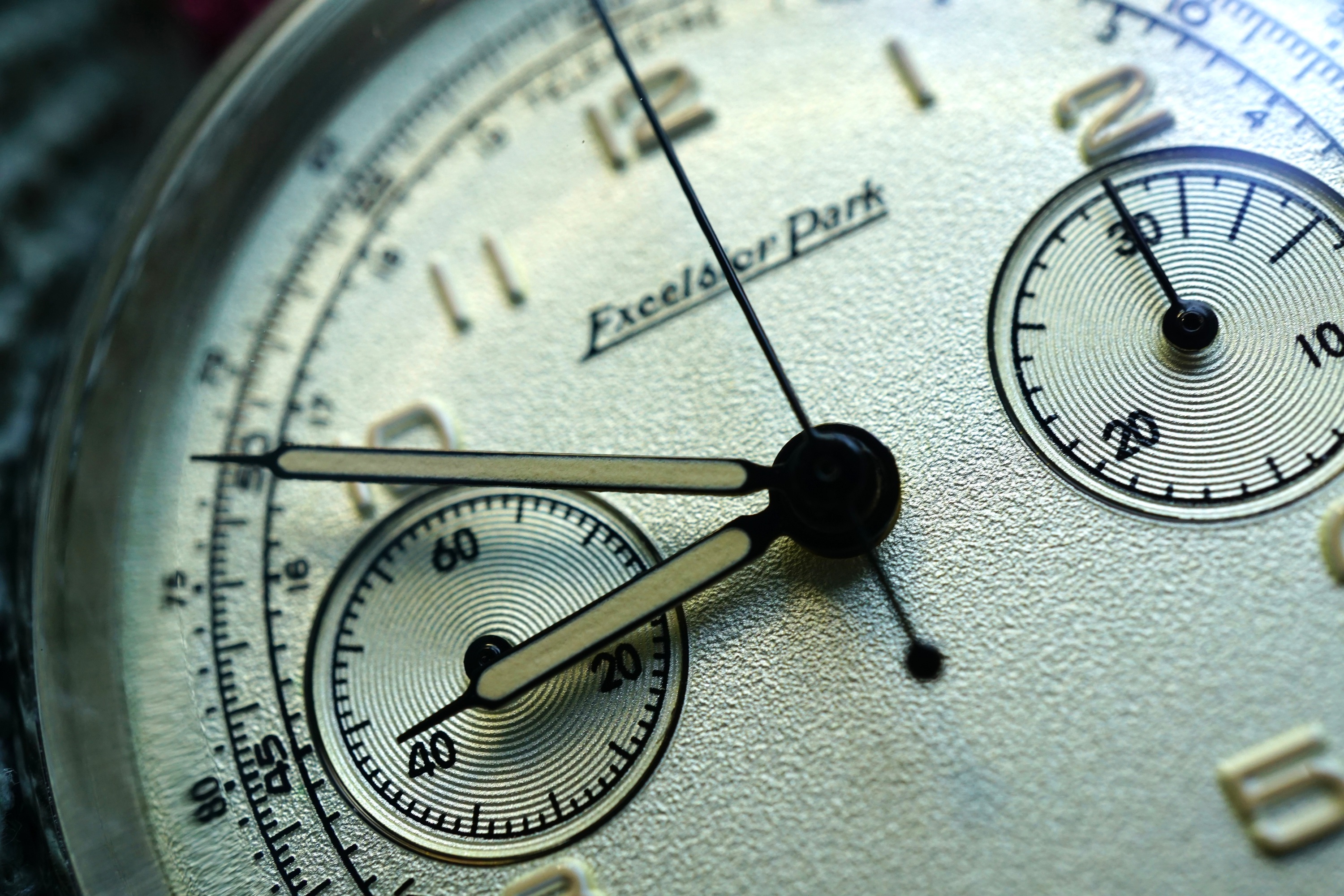 Vandaag de Excelsior Park. Ik blijf het een geweldig horloge vinden, met z’n klassieke kleerhanger 7. De camera heeft moeite met de manier waarop de korrel van de wijzerplaat licht reflecteert. Ik krijg steeds paarse wazen bij macro’s.