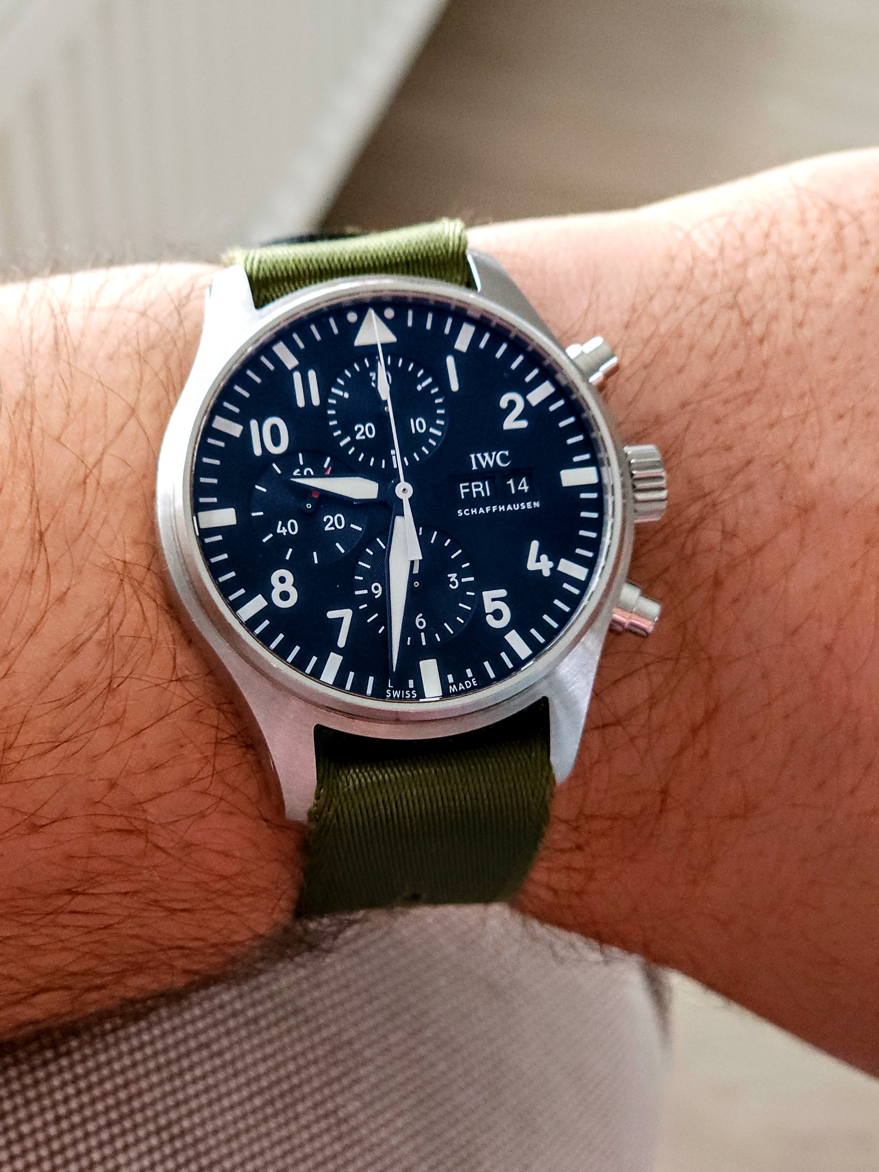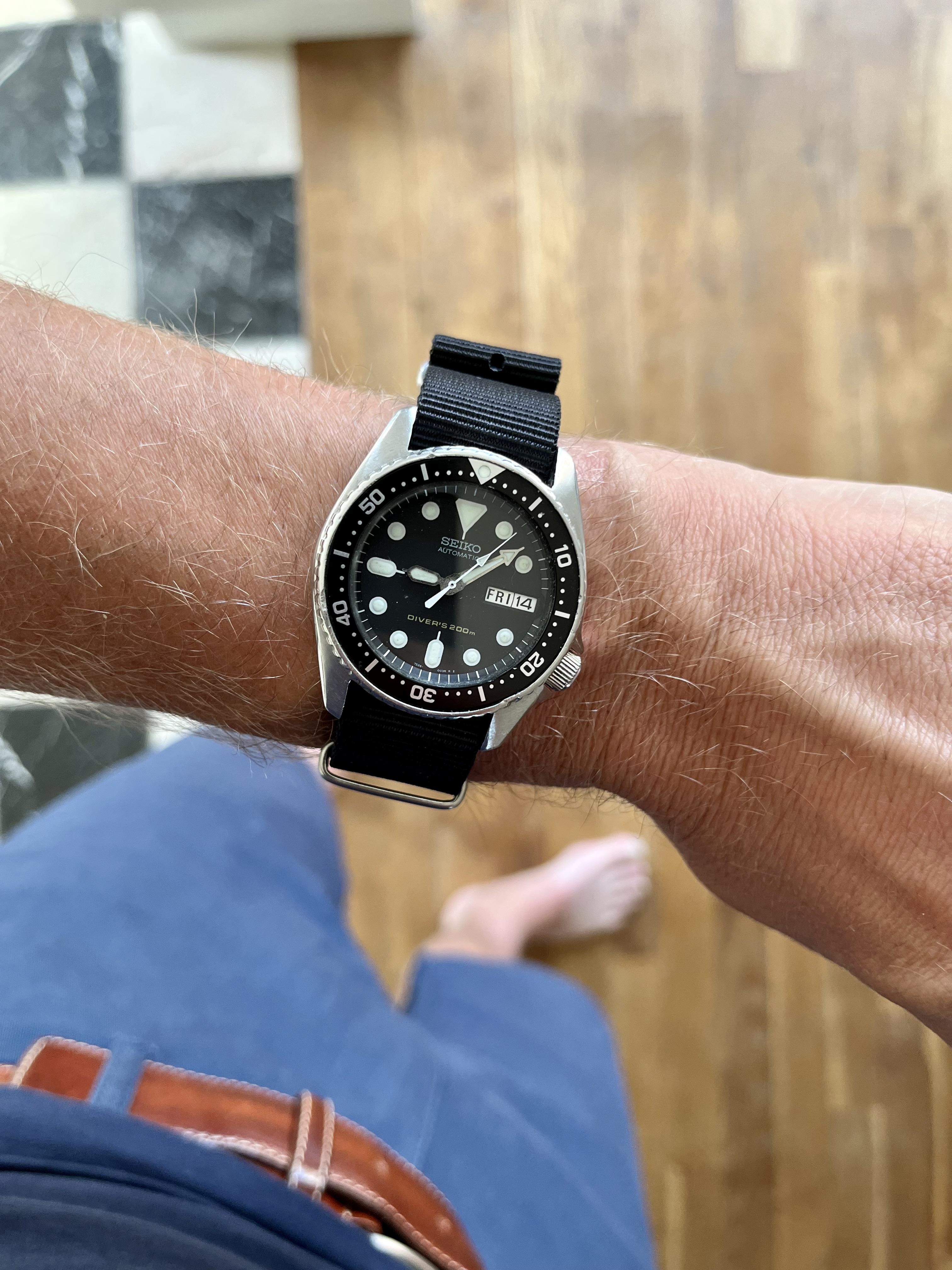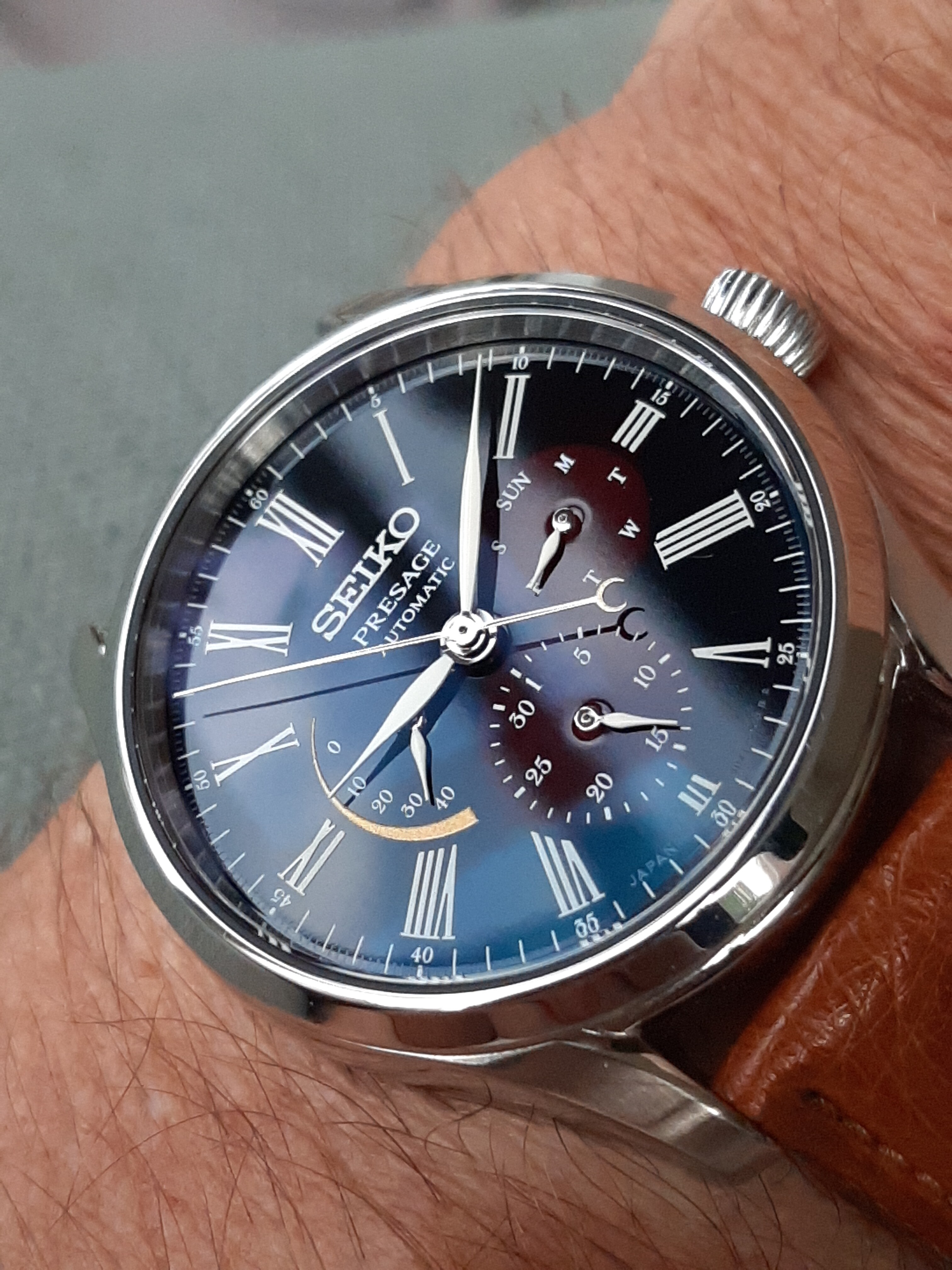 Vandaag de Excelsior Park. Ik blijf het een geweldig horloge vinden, met z’n klassieke kleerhanger 7. De camera heeft moeite met de manier waarop de korrel van de wijzerplaat licht reflecteert. Ik krijg steeds paarse wazen bij macro’s.