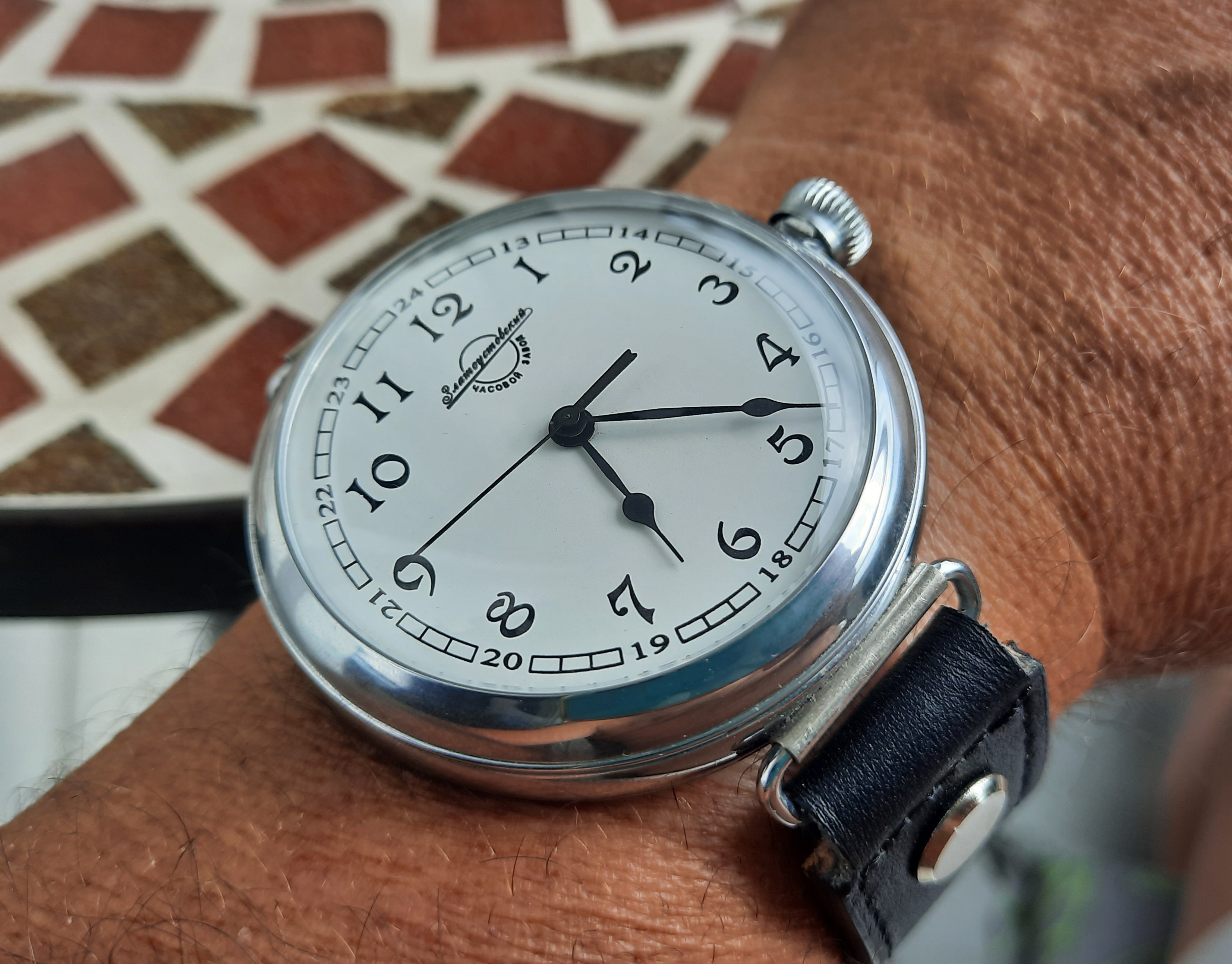 Reissue van een jaren 40 zakhorloge wat destijds is omgebouwd tot polshorloge door er beugels aan te lassen.