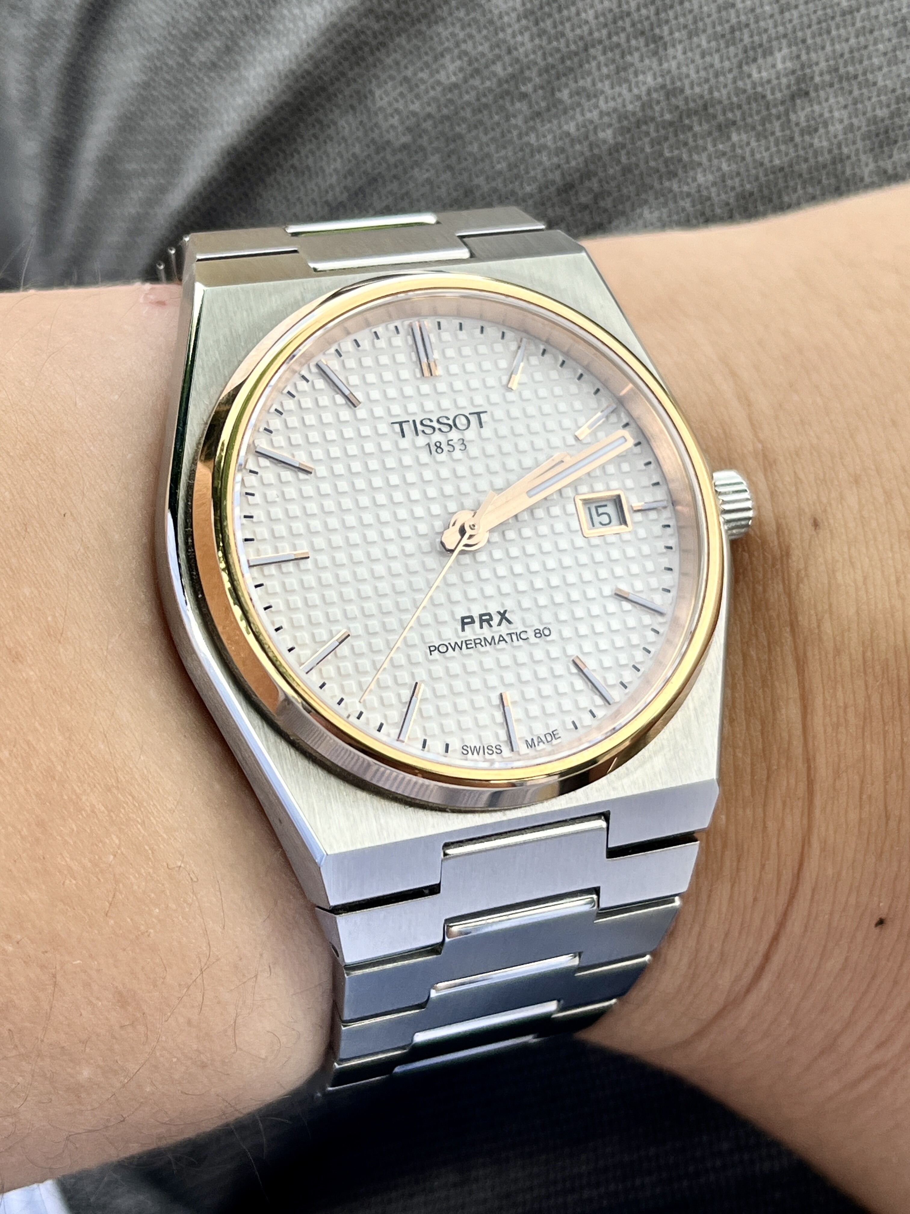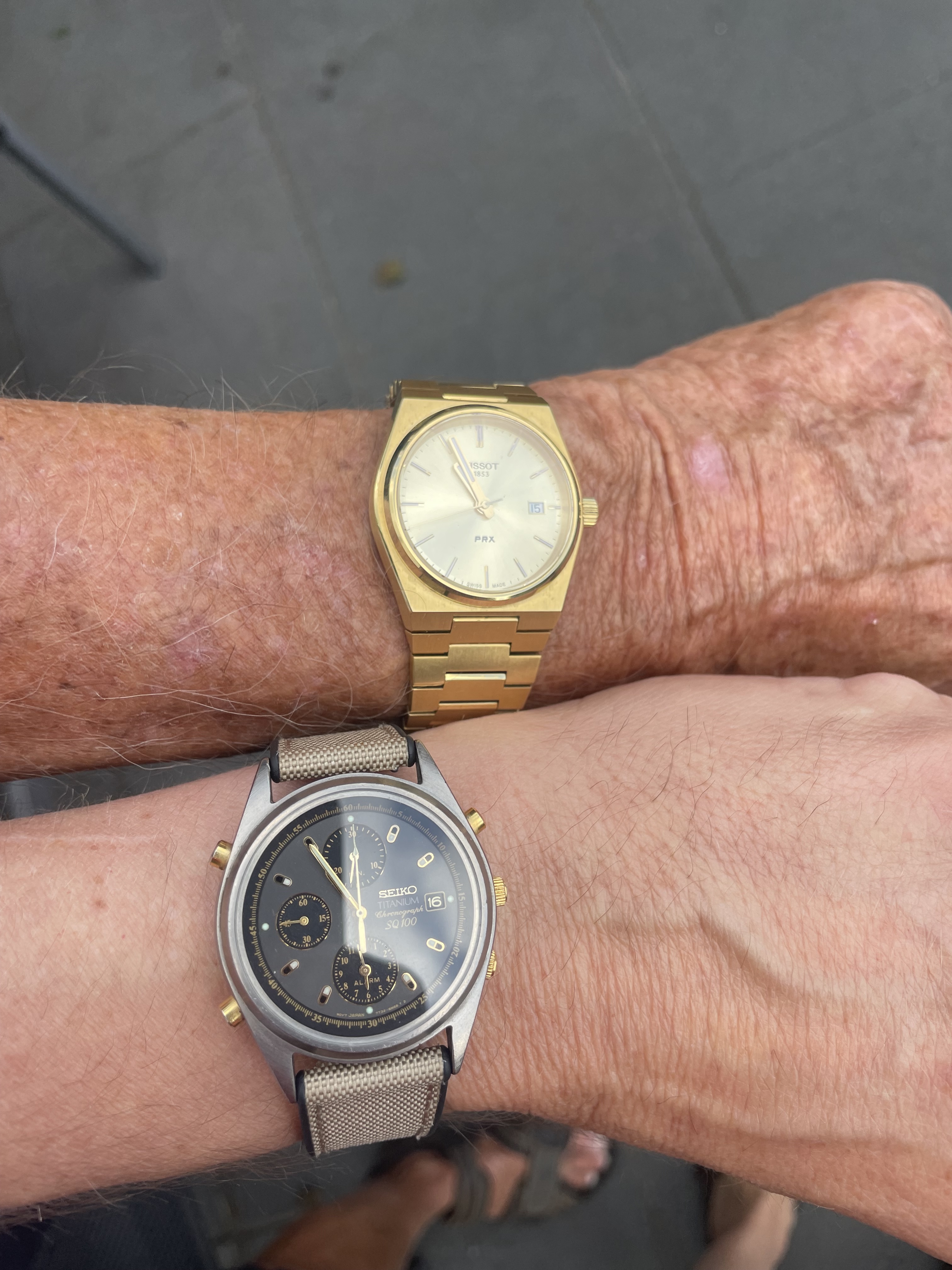Ik de Seiko die ik van m’n ouders kreeg toen ik m’n Havo diploma behaalde. Papa de PRX die ik hem onlangs voor zijn 75e verjaardag kado heb gedaan. Wat hebben we toch een mooie hobby.