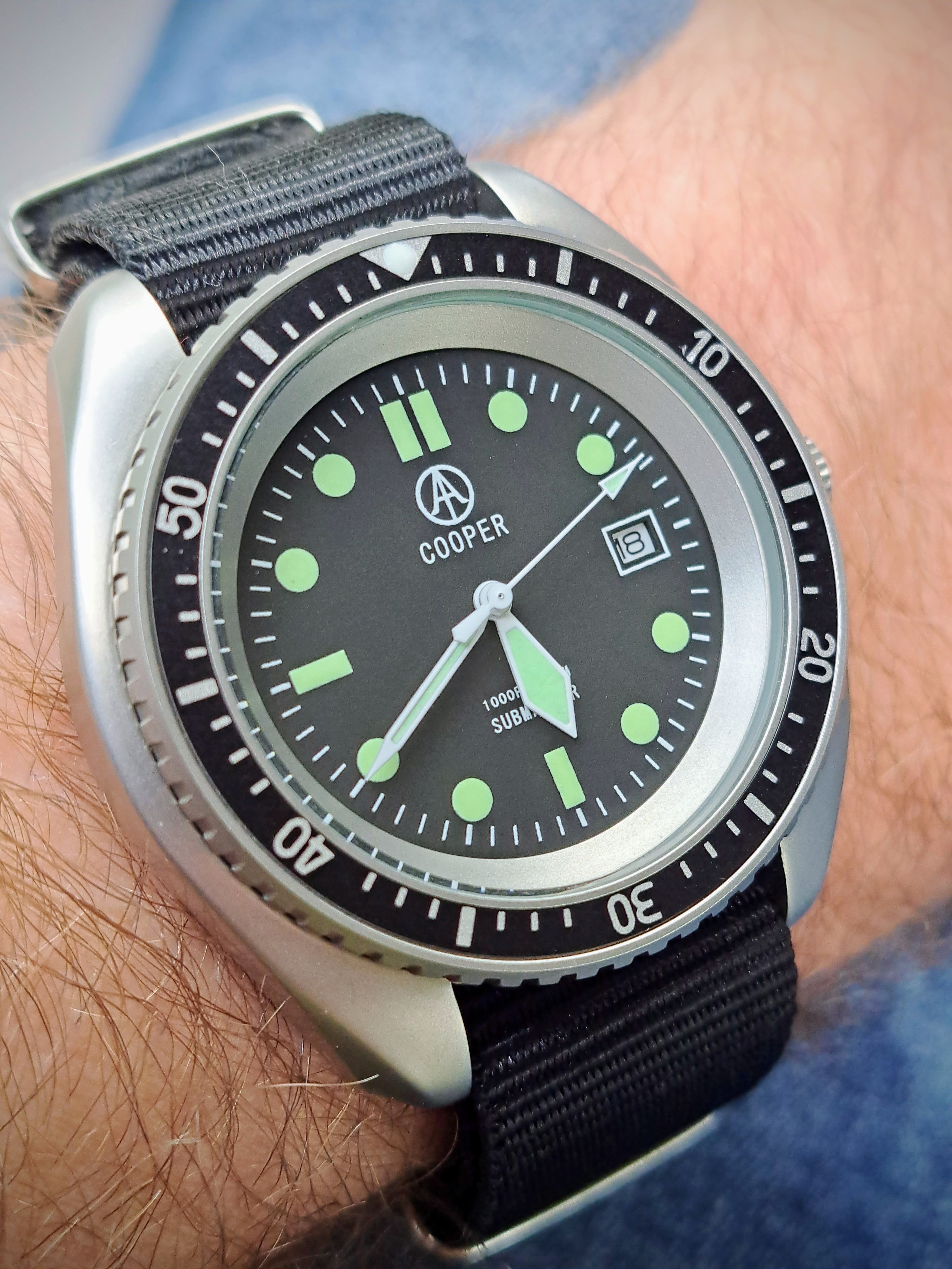 Cooper Submaster voor vanavond, valt mooi klein voor een 42mm. Als ie blijft bevallen mogelijk omruilen naar een Seiko Mini Turtle.