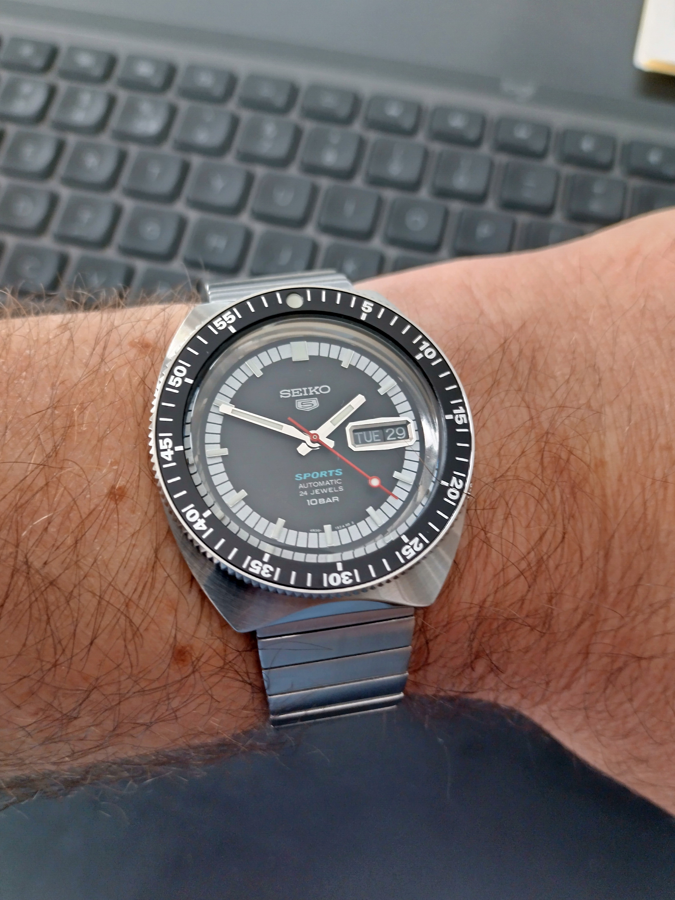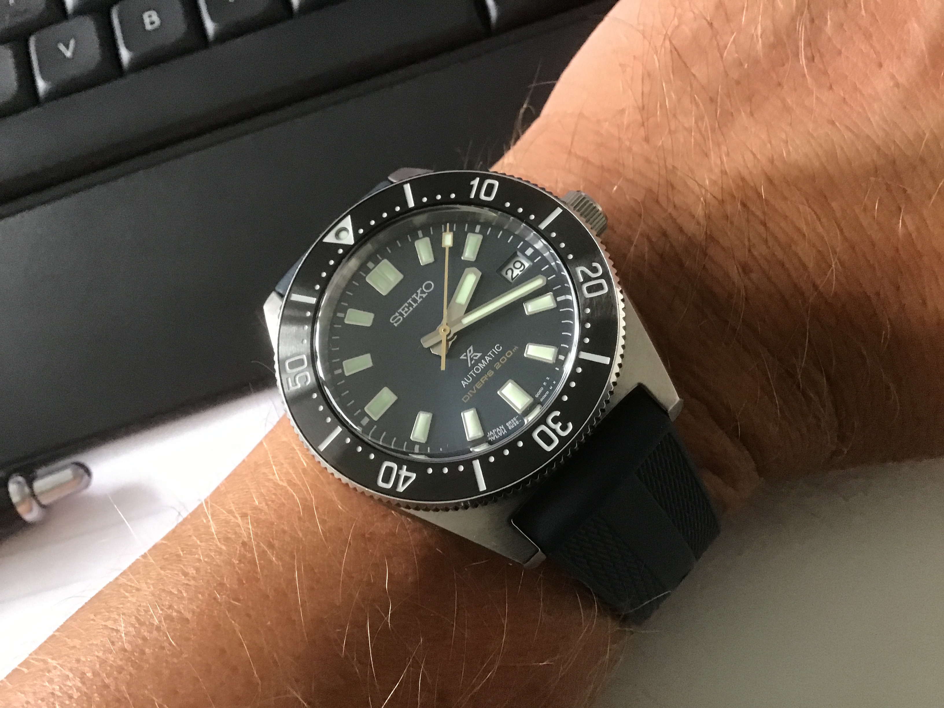 Omdat de AD waar ik het horloge in bestelling heb niet reageert op mijn mails liep ik in mijn zoektocht naar soortgelijke ervaringen hier op het forum tegen de advertentie van @Ray1 aan. Het moest zo zijn, en heb er dan ook niet lang over nagedacht. Direct contact gelegd en gisteren op de fiets het horloge afgehaald. Na een leuke horloge babbel en het bewonderen van zijn collectie superblij weer huiswaarts gefietst. Vanochtend de band van de nieuwe aankoop op maat gemaakt en het horloge om de pols geslingerd.