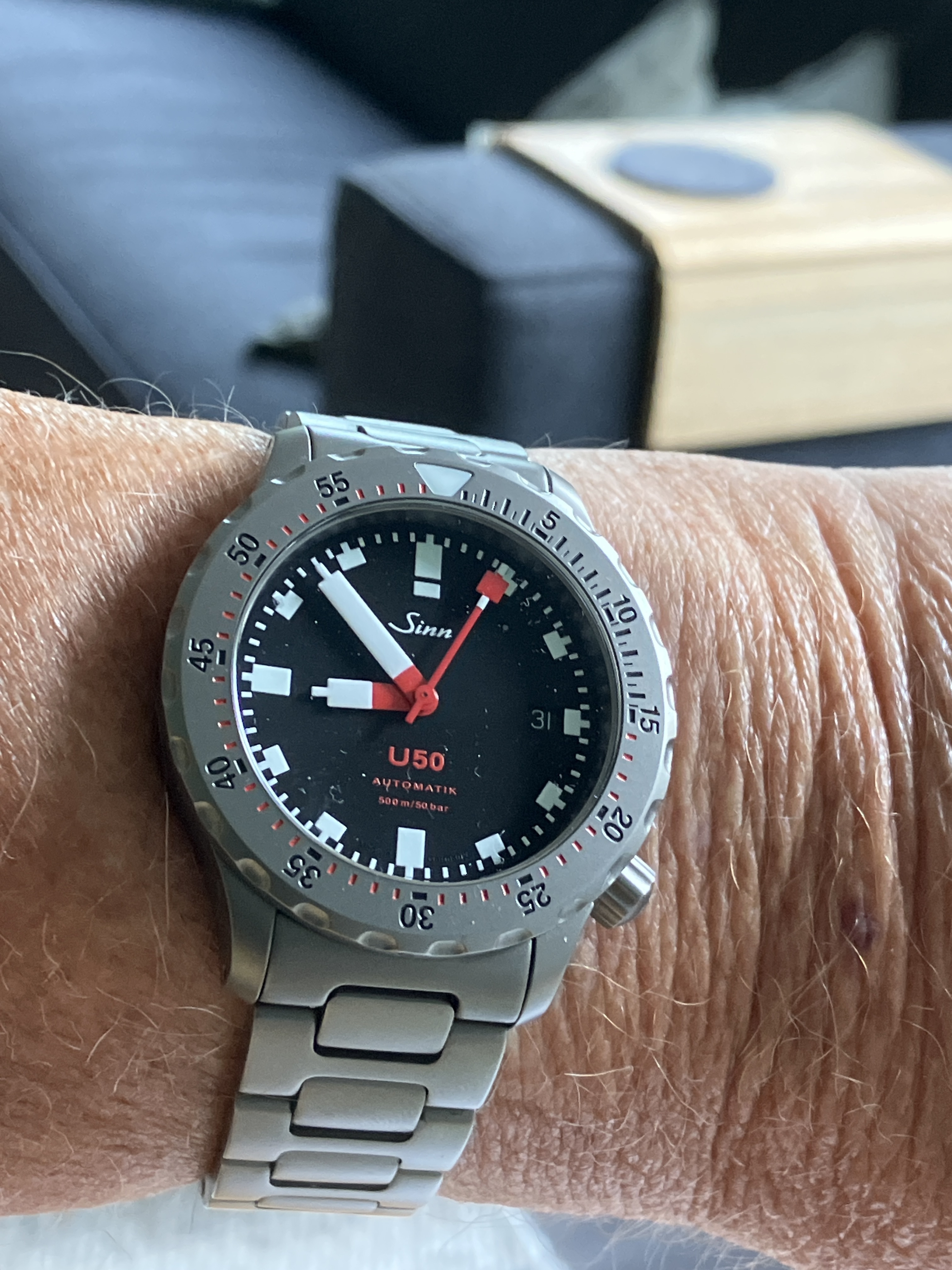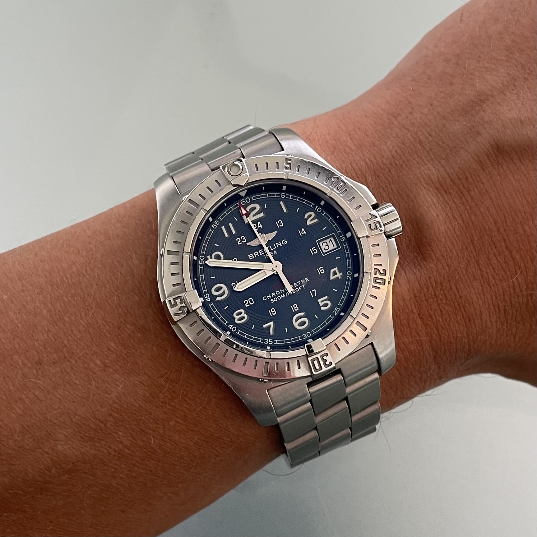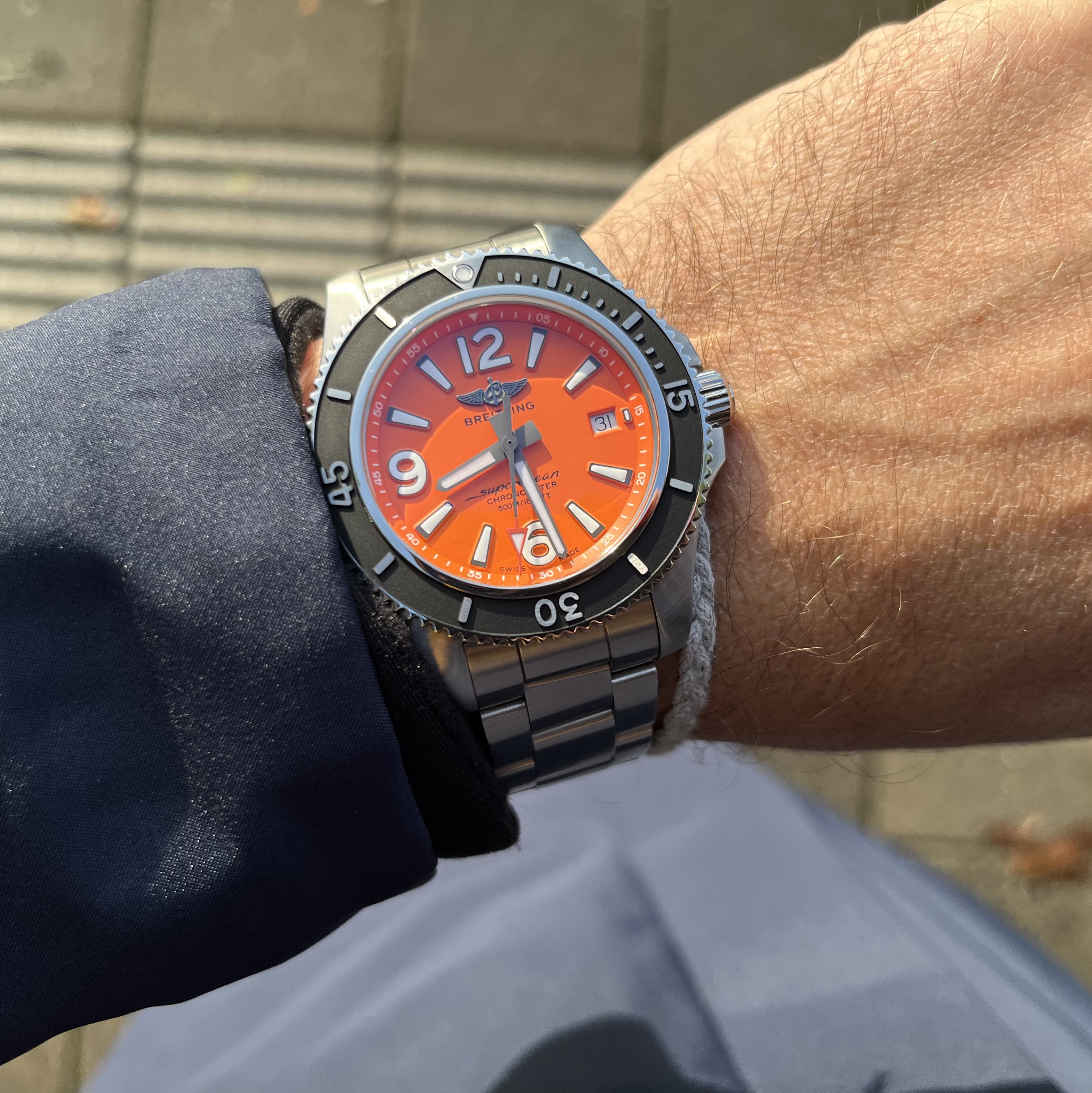NA vandaag. Tudor er uit en Breitling er in. Heb altijd al een keer deze met de oranje plaat willen hebben. Toch een soort van ultieme duiker zo. Speciaal voor het deskdiven.