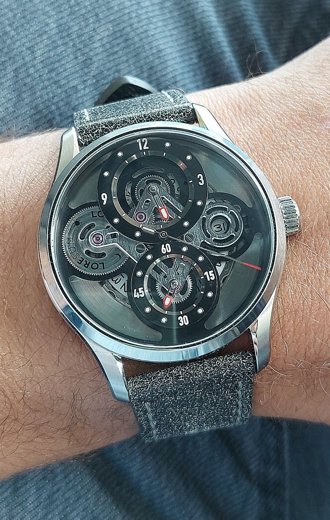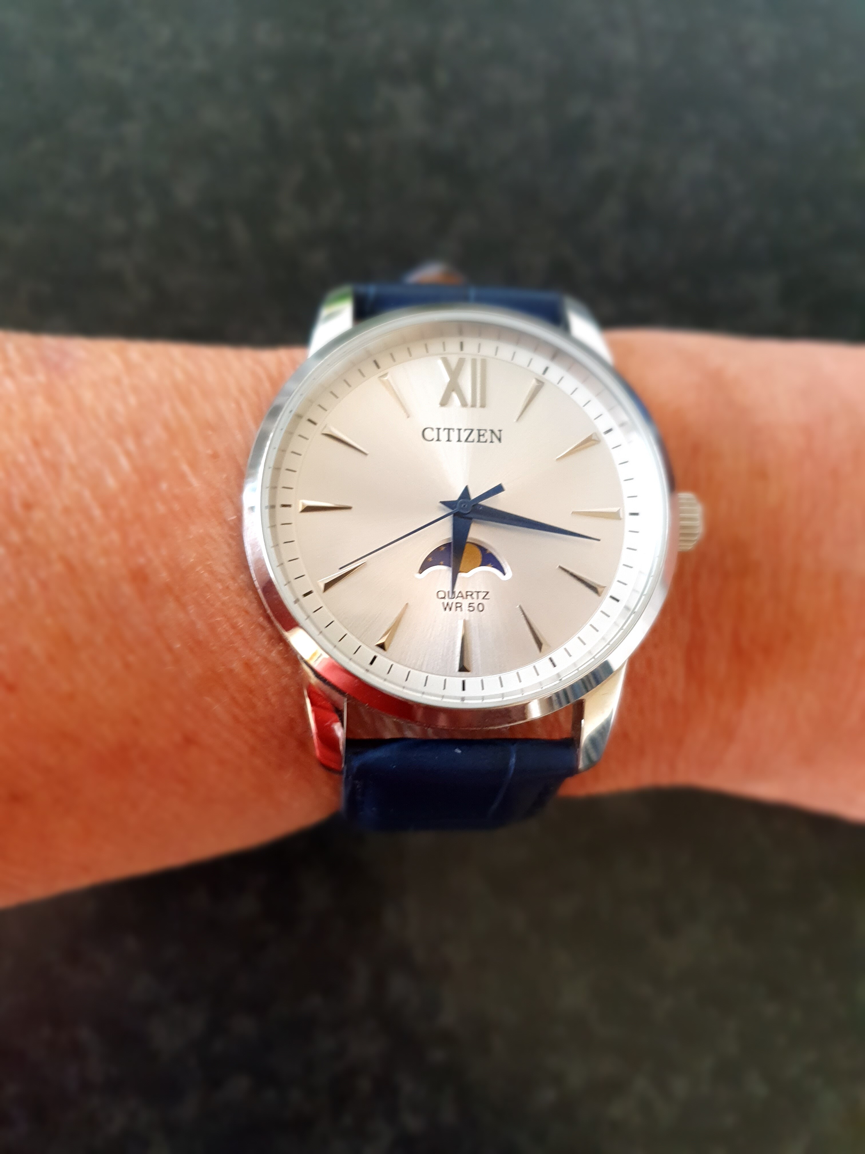 vind het doordacht design om de minutenteller flink groter te integreren in de fijn contrasterende blauwe wijzerplaat.