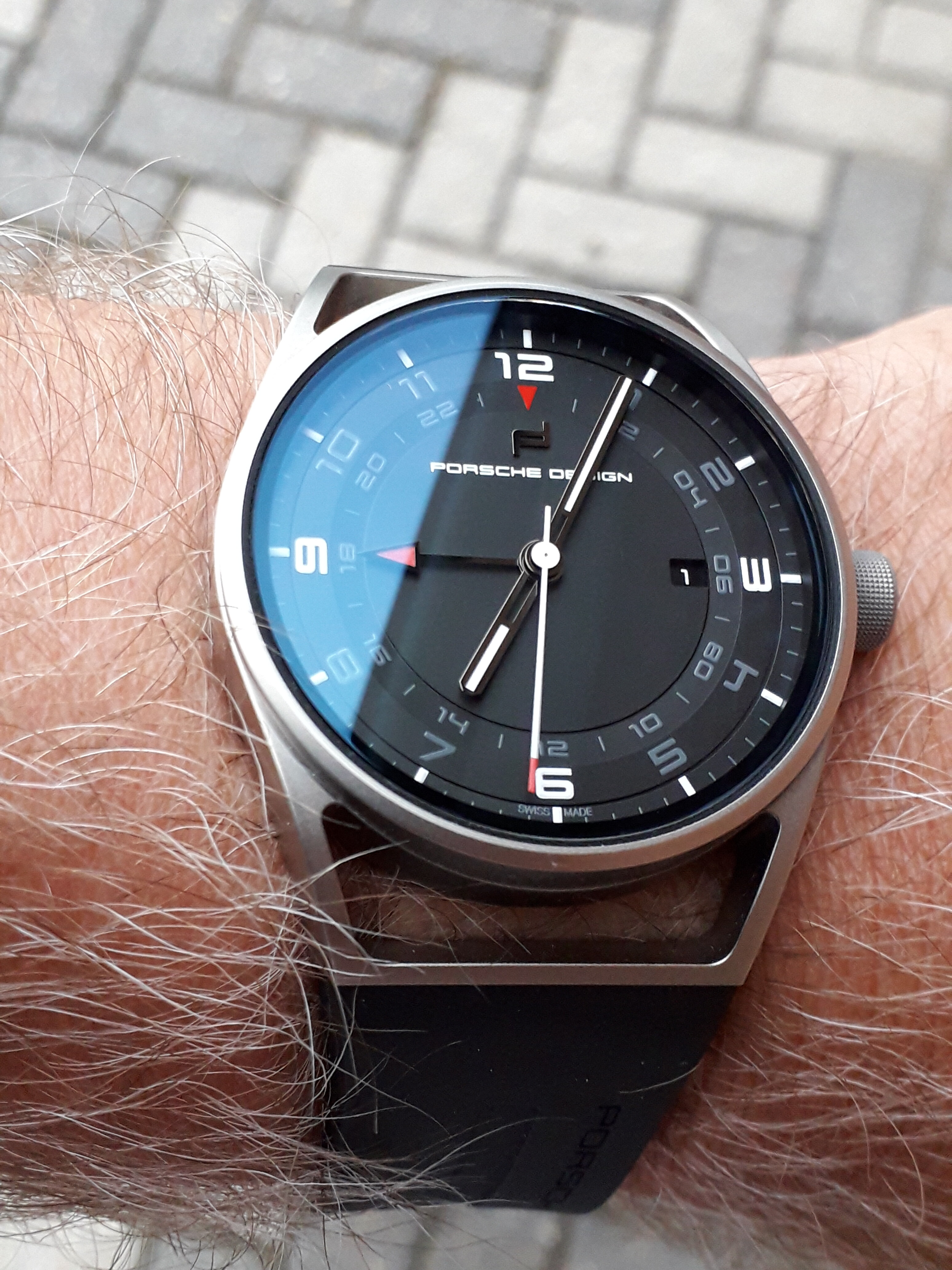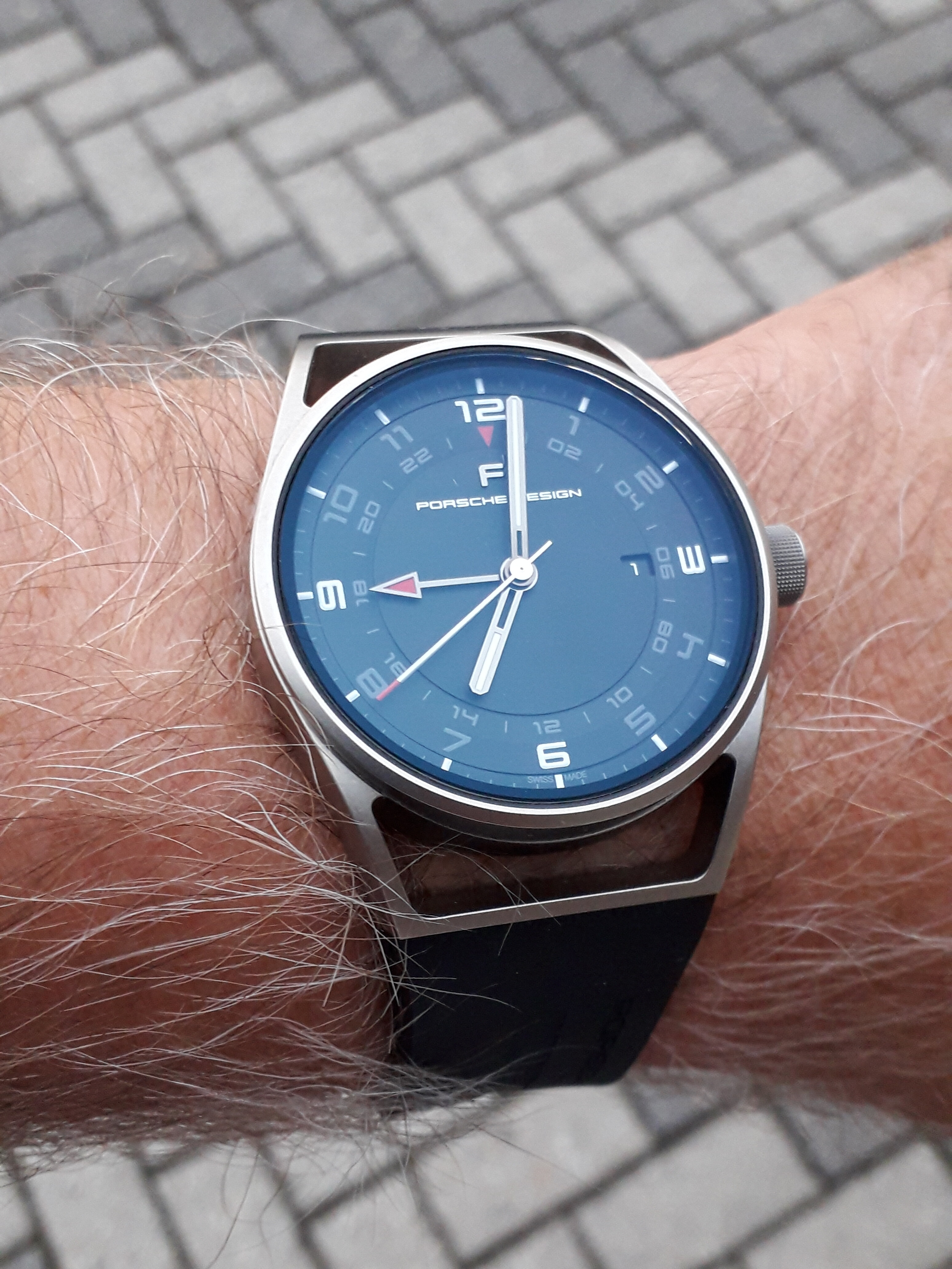 Titanium, 42mm, soepel rubber, saffier en een vouwsluiting.