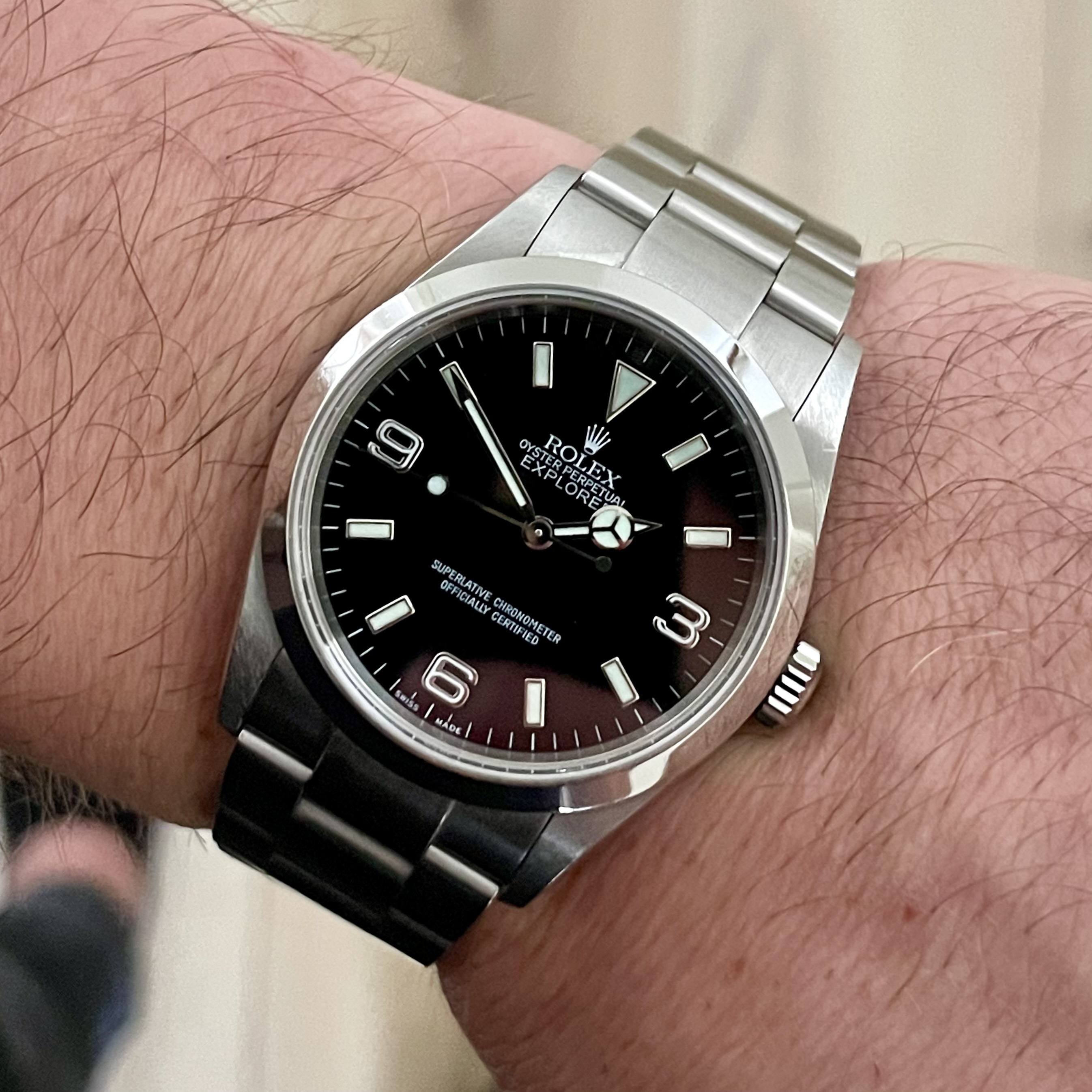 De NA Traska Summiteer 38mm. Kenmerkend stof(?)plekje op de wijzerplaat. 3D-geprinte lume markers, leuke mix van Explorer en Pelagos. Ben er enorm blij mee, maar moet nog even bedenken of ik de imperfectie als idiosyncratisch accepteer of ‘m terugstuur.