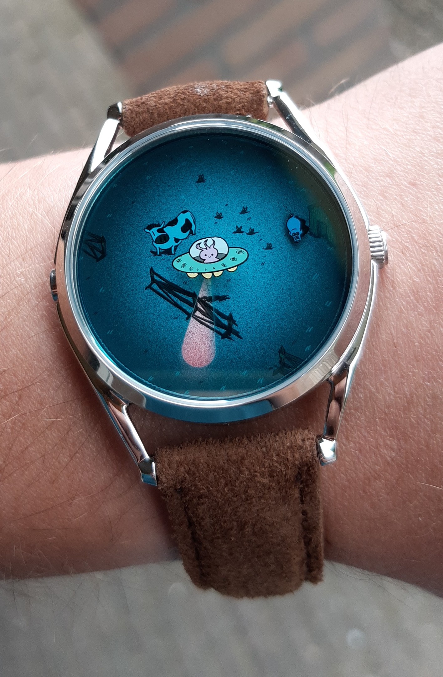 Het grappige is dat de ufo beam de minuten aangeeft en het biggetje de uren, je ziet het biggetje ook mooi tussen de hekken heen rennen. Echt een geniale manier van tijdsweergave.