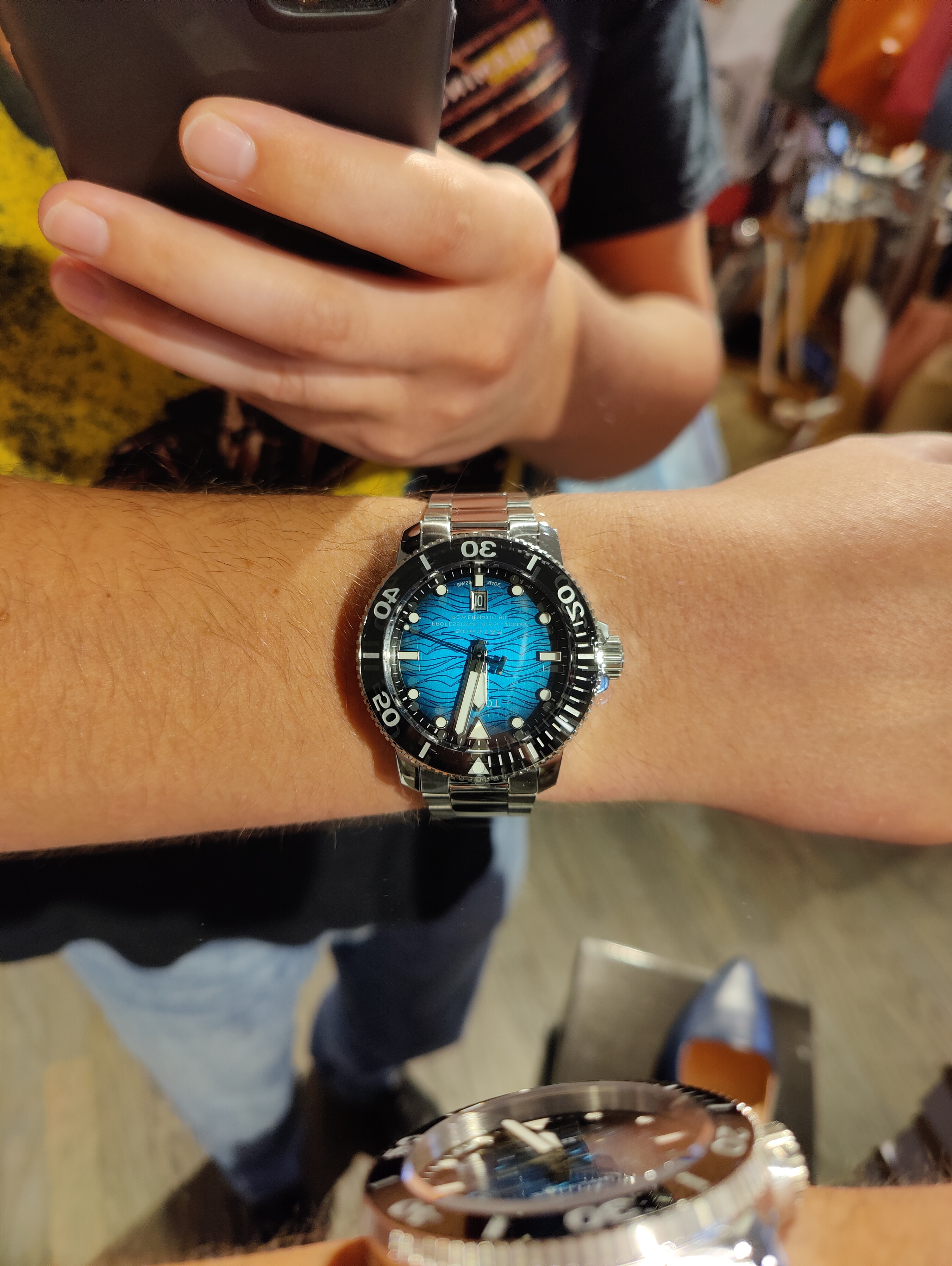 Wil je na weken zon, zee en strand vrolijk naar je werk in een nat en koud NL? Koop dan een Oris Aquis, glimlach gegarandeerd!! Wat een mooierd, met die wijzerplaat die van mintgroen naar grijs loopt… Dikke blij!