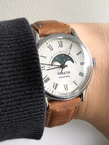 Een van de meer creatieve fonts uit de seventies en eighties, zeker op een Russische wijzerplaat