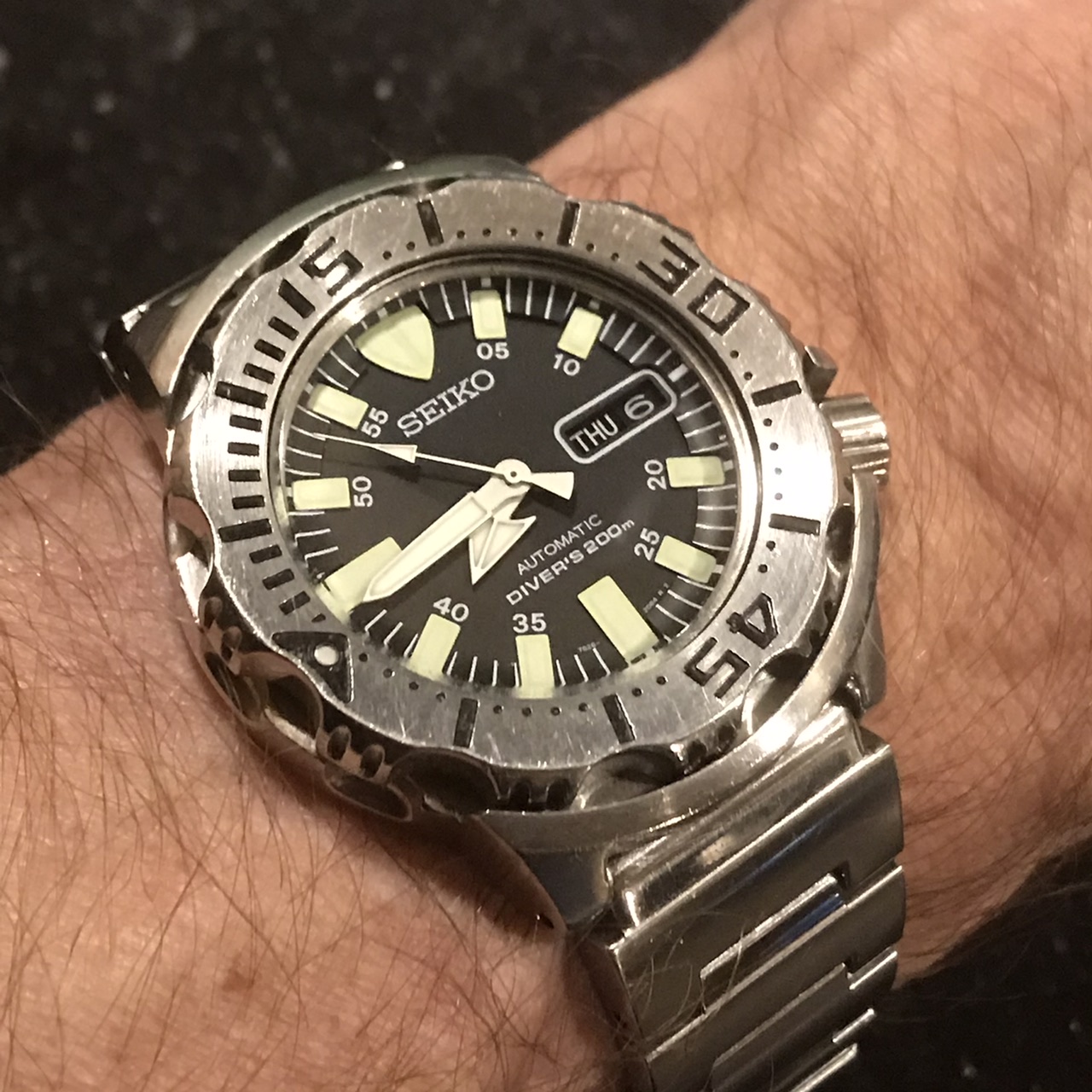 Met de band op mijn polsmaat 266 gram en incl. alle overige schakels 278 gram… de SD43 die ik had ( net als die van @JohnWick ) was 181 gram. Best wel een zwaar gewichtje dus