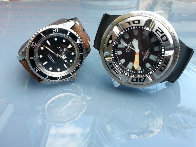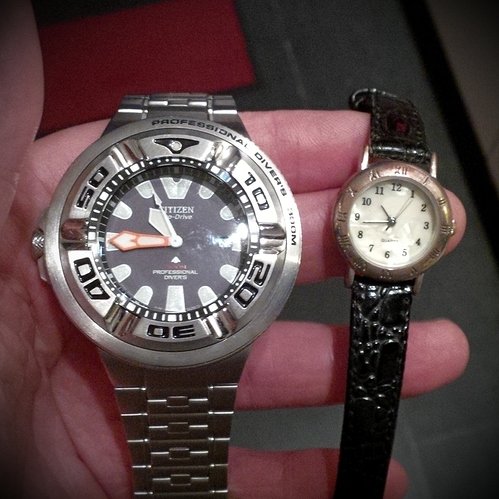 Zojuist heb ik een nieuw batterijtje in het horloge van mijn oma gefriemeld. En friemelen was het, met een diameter van slechts 24mm. Voor de gein even naast mijn grootste horloge gehouden, een 48mm Ecozilla. Wat een verschil!