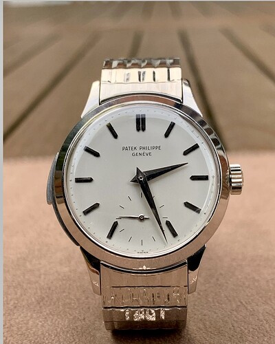 Is een originele witgouden patek bracelet die ook origineel op dit platina horloge is geleverd. Dit horloge + band was wel een specifieke order en niet regulier te bestellen. Sterker nog, zowel de band als deze referentie in platinum waren op dit moment uniek. Later is nog 1 exemplaar in platinum geproduceerd op leren band