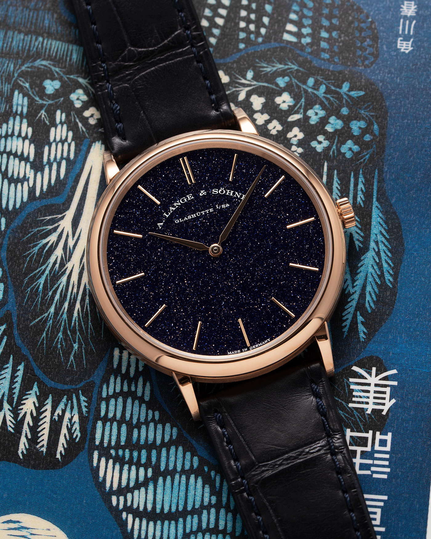 Reminiscent of so-called aventurine glass dials that can be found in many watches these days, A. Lange & Söhne does things its own way. The base for the dial is solid-silver and is then coated with a thin layer of blue gold flux. Thousands of tiny copper oxide crystals are embedded in the material, revealing copper-coloured speckles that shine depending on the ambient light. Combined with the dark blue background, this creates the effect of a starry sky. The process of producing gold flux has its roots in 17th-century Venice.