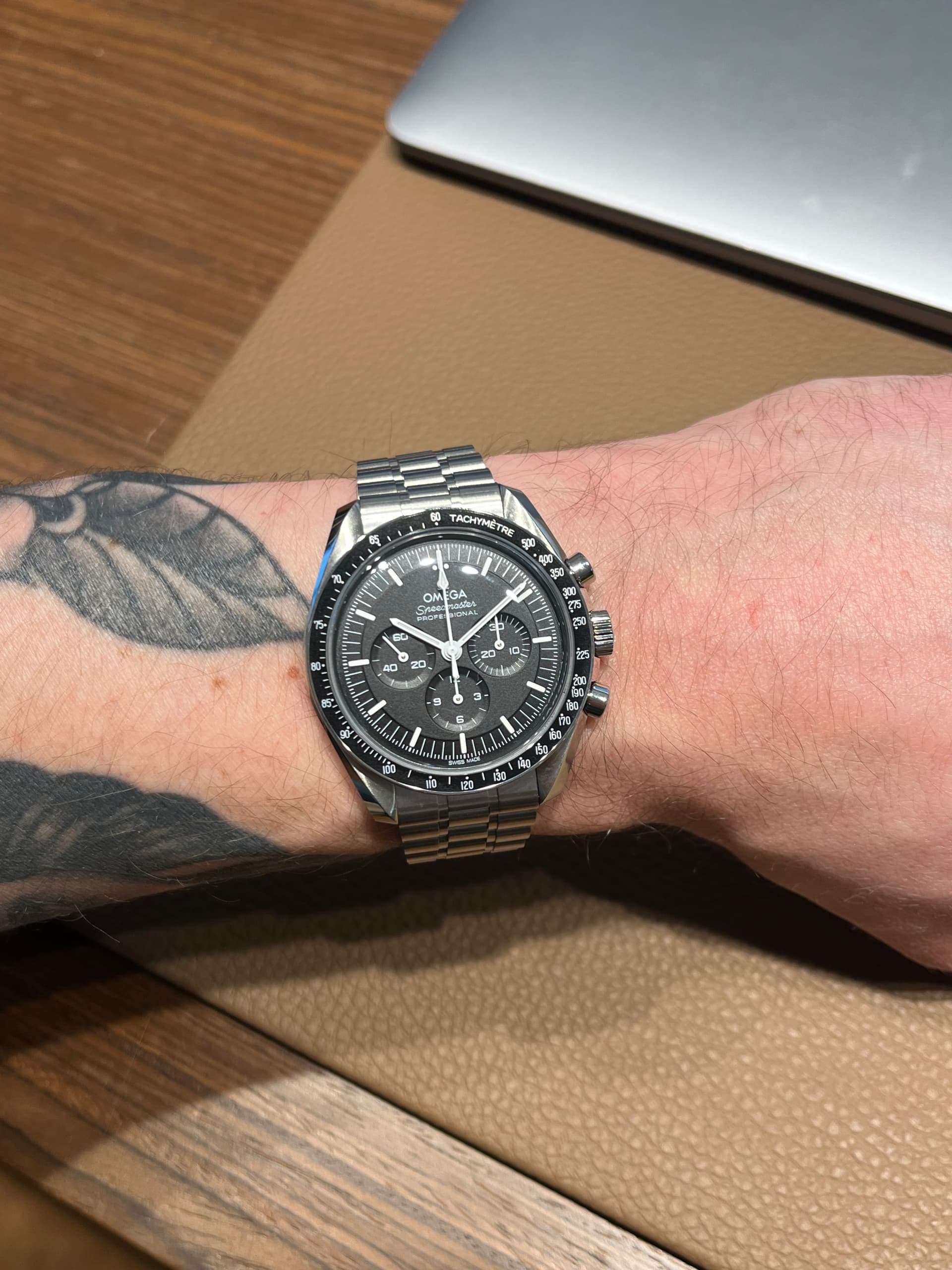 Weet niet of je de “Speedy” dan niet lekker vindt dragen maar hij misstaat absoluut niet op je pols vind ik. Deze is standaard natuurlijk wat groter, anders is het geen echte moonwatch. ![]()