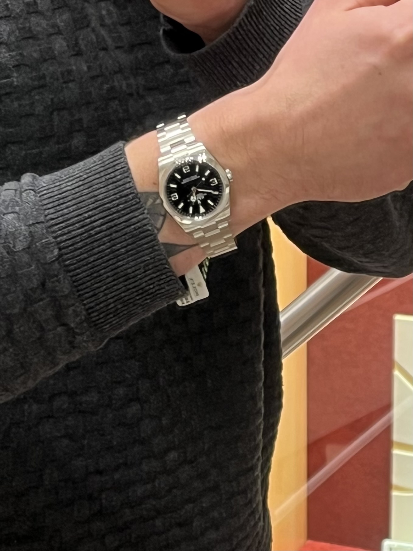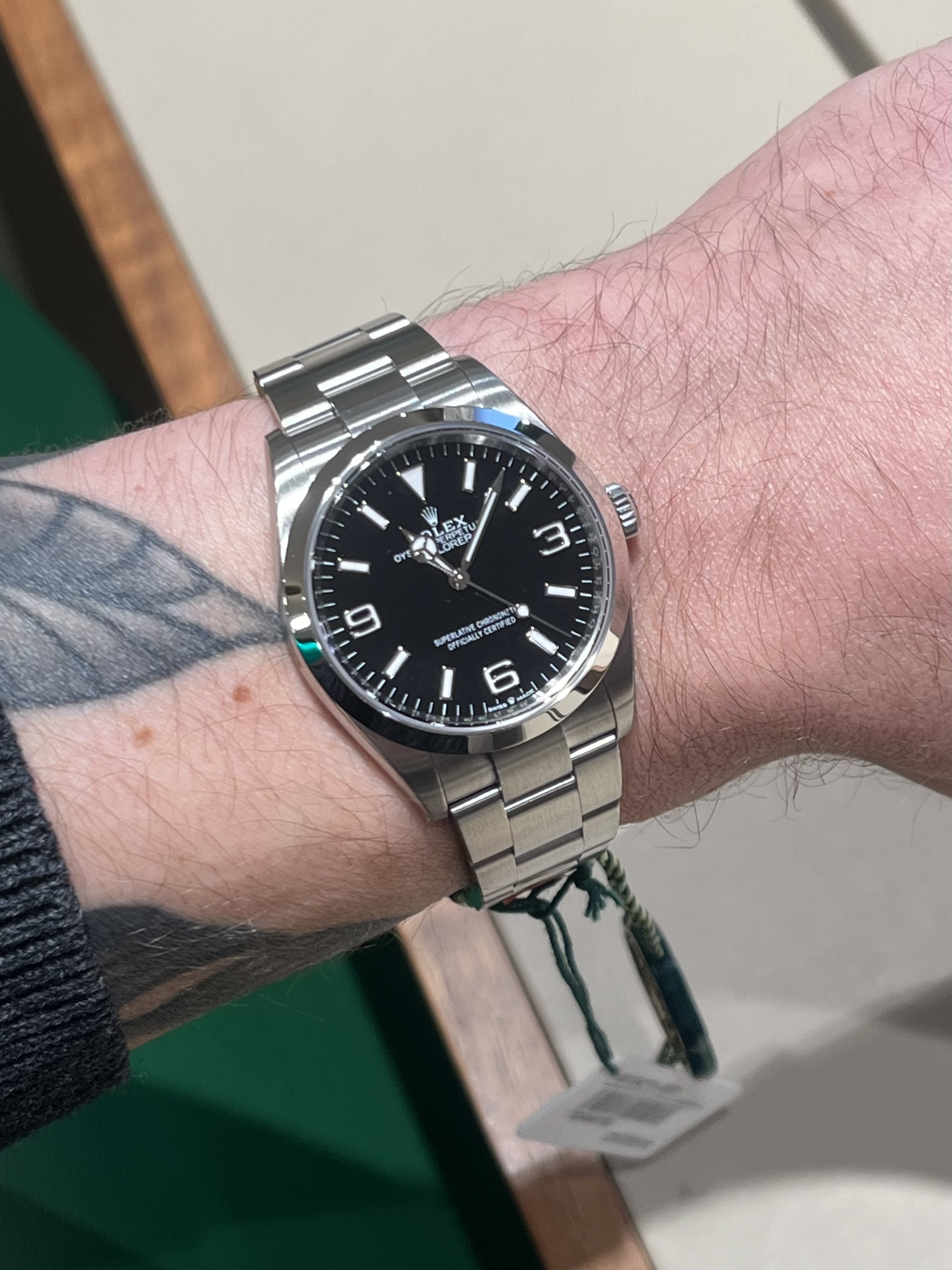 Toen naar S&C en daar 't horloge gepast wat bovenaan de wish list staat, de Explorer I in 36 mm. Benieuwd of 't formaat me zou bevallen en de band die toch wel flink tapered. Maar ik was aangenaam verrast. Zodra ik 'm om had kon ik m’n ogen er niet vanaf houden