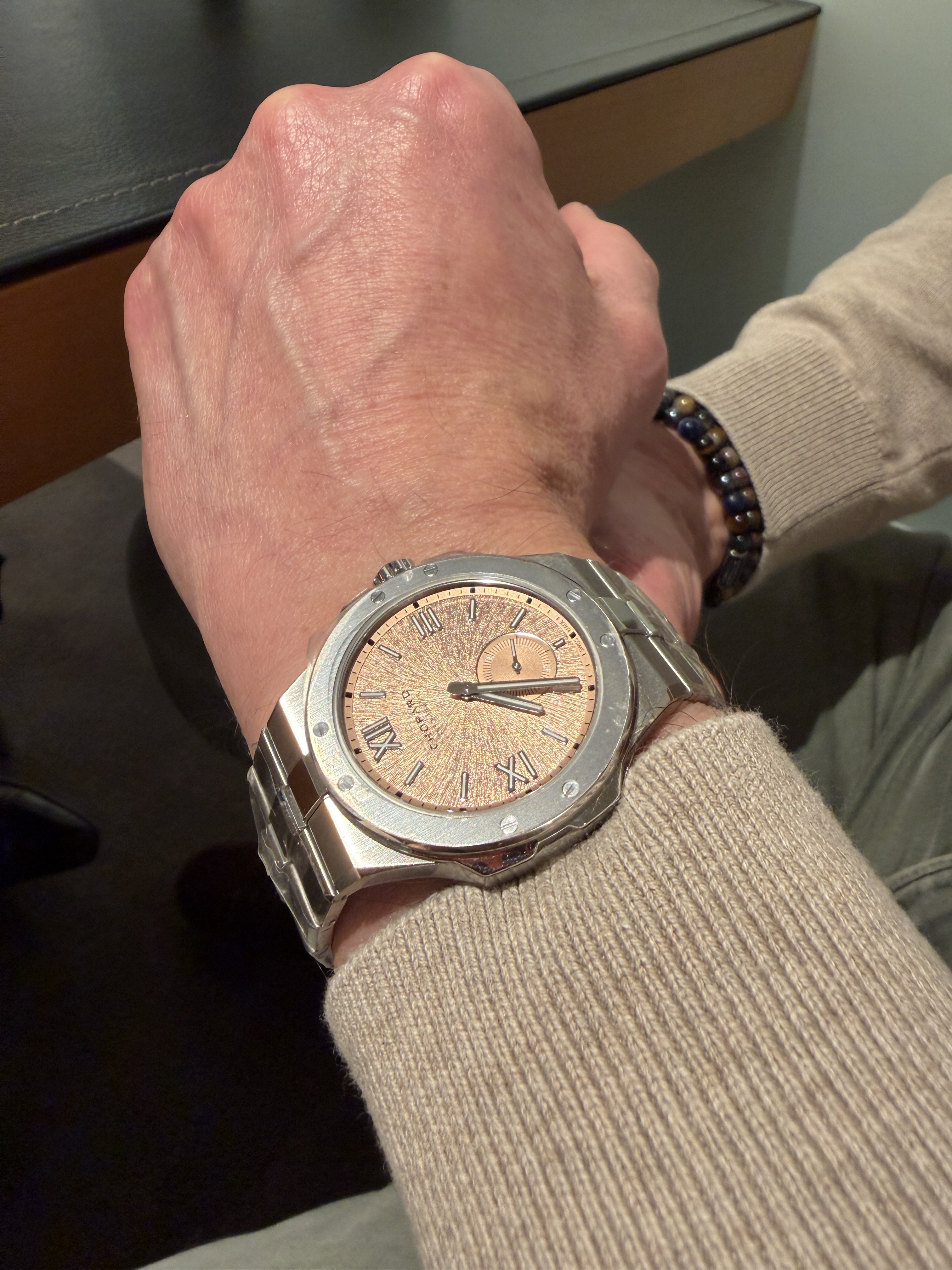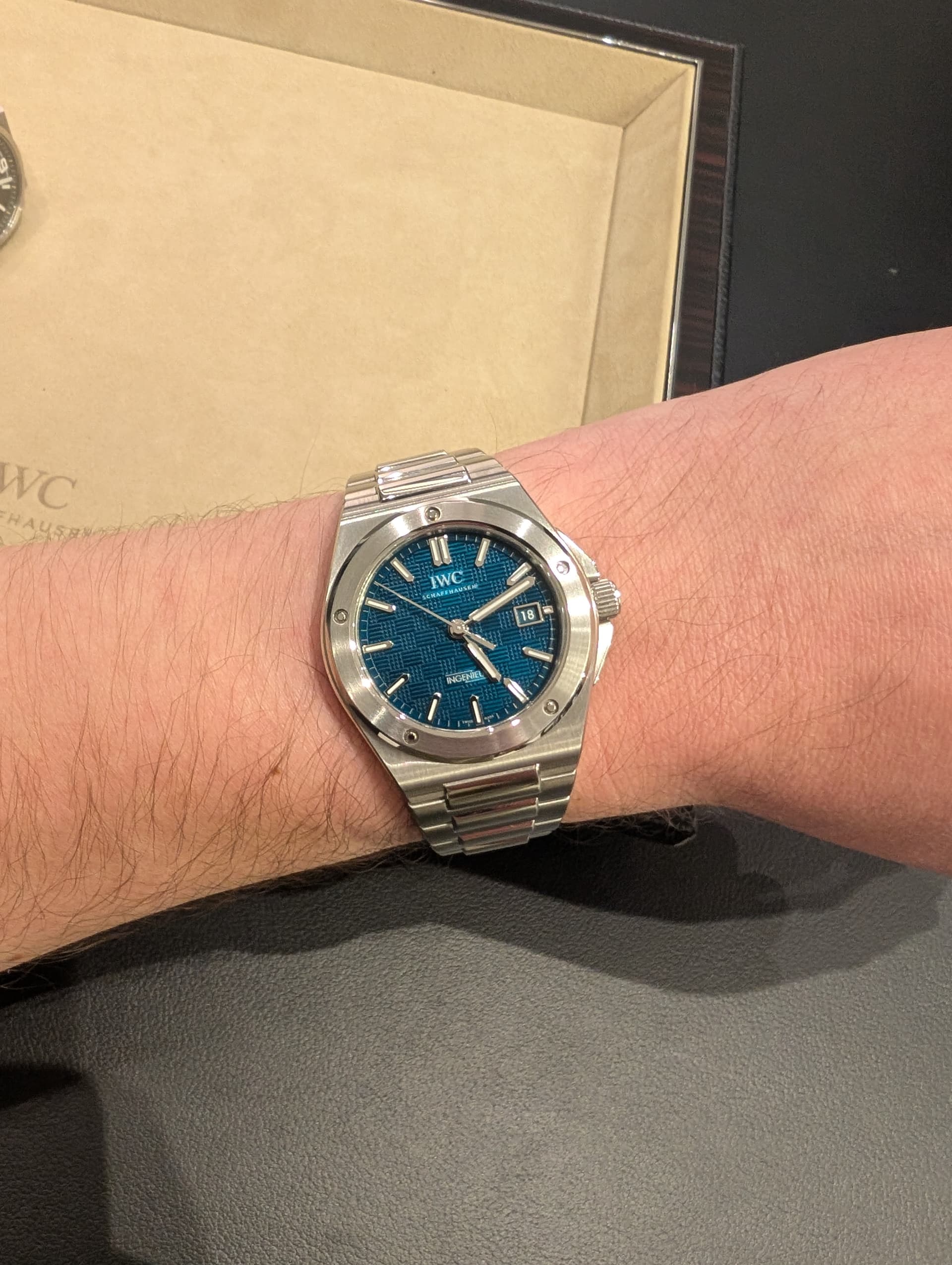 Ik heb de Ingenieur onlangs ook gepast en die zat echt erg prettig! Ook de titanium uitvoering geprobeerd, maar vergeten een foto te trekken. Hoewel ik eerder titanium horloges heb gedragen zoals de SMP300 en de Santos, voelde deze opvallend licht aan.