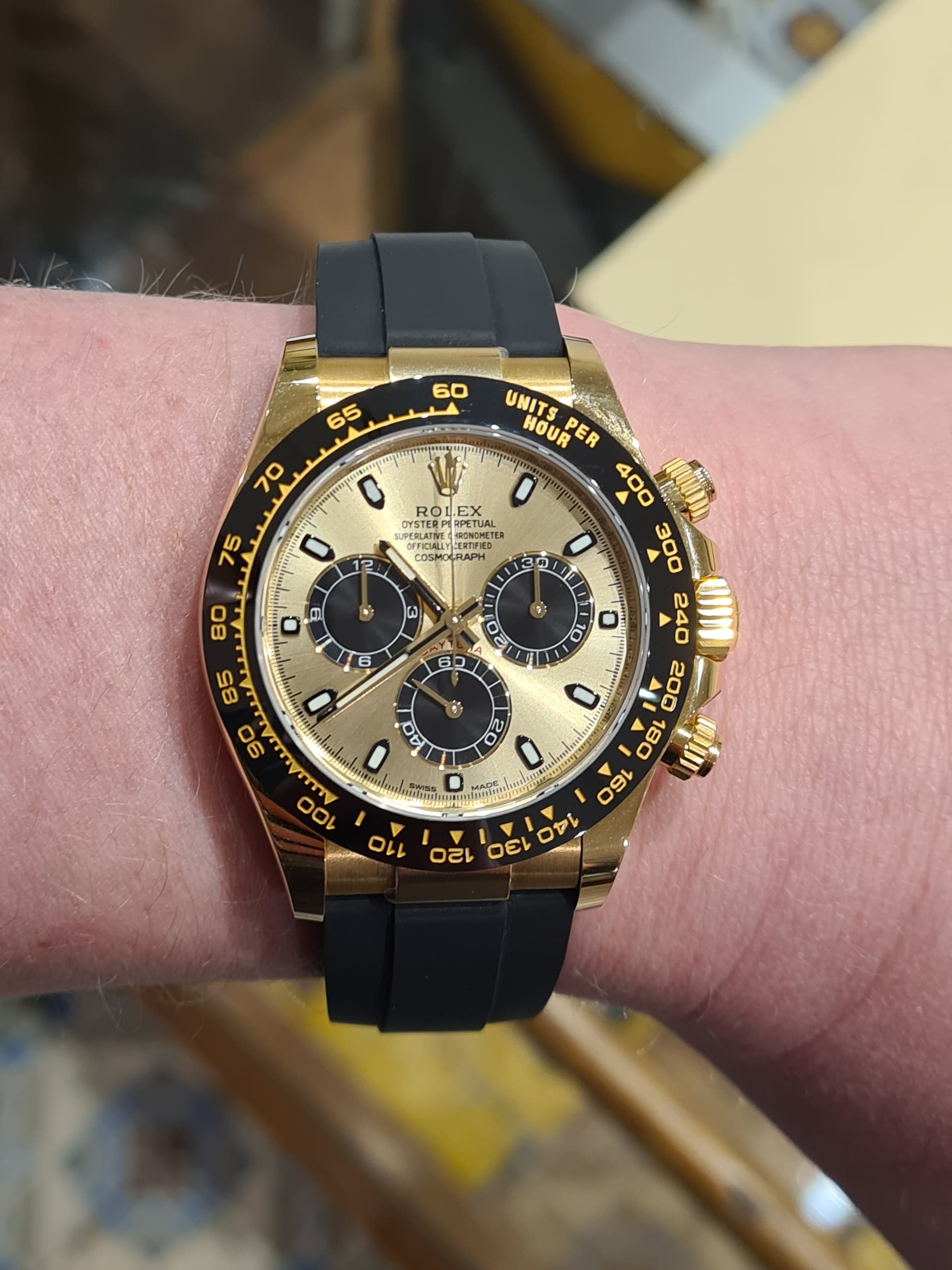 Gouden daytona op zwart rubber. Kon niet laten om te proberen. Heerlijk!