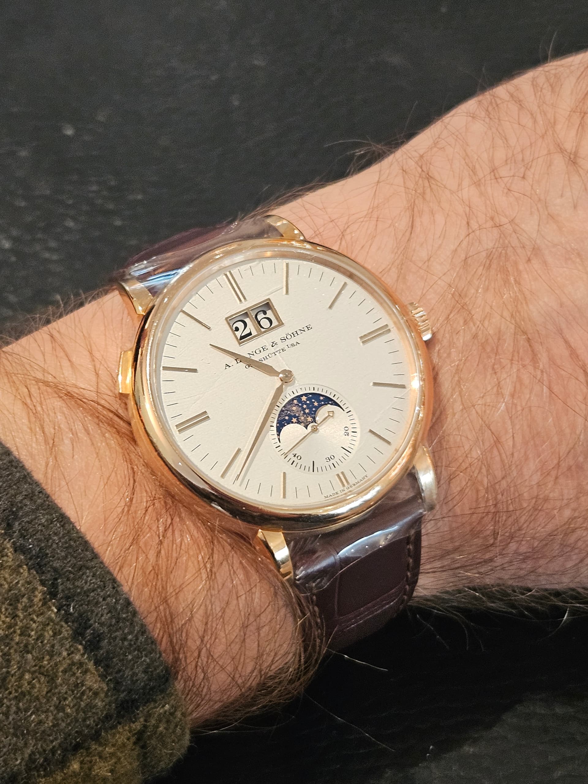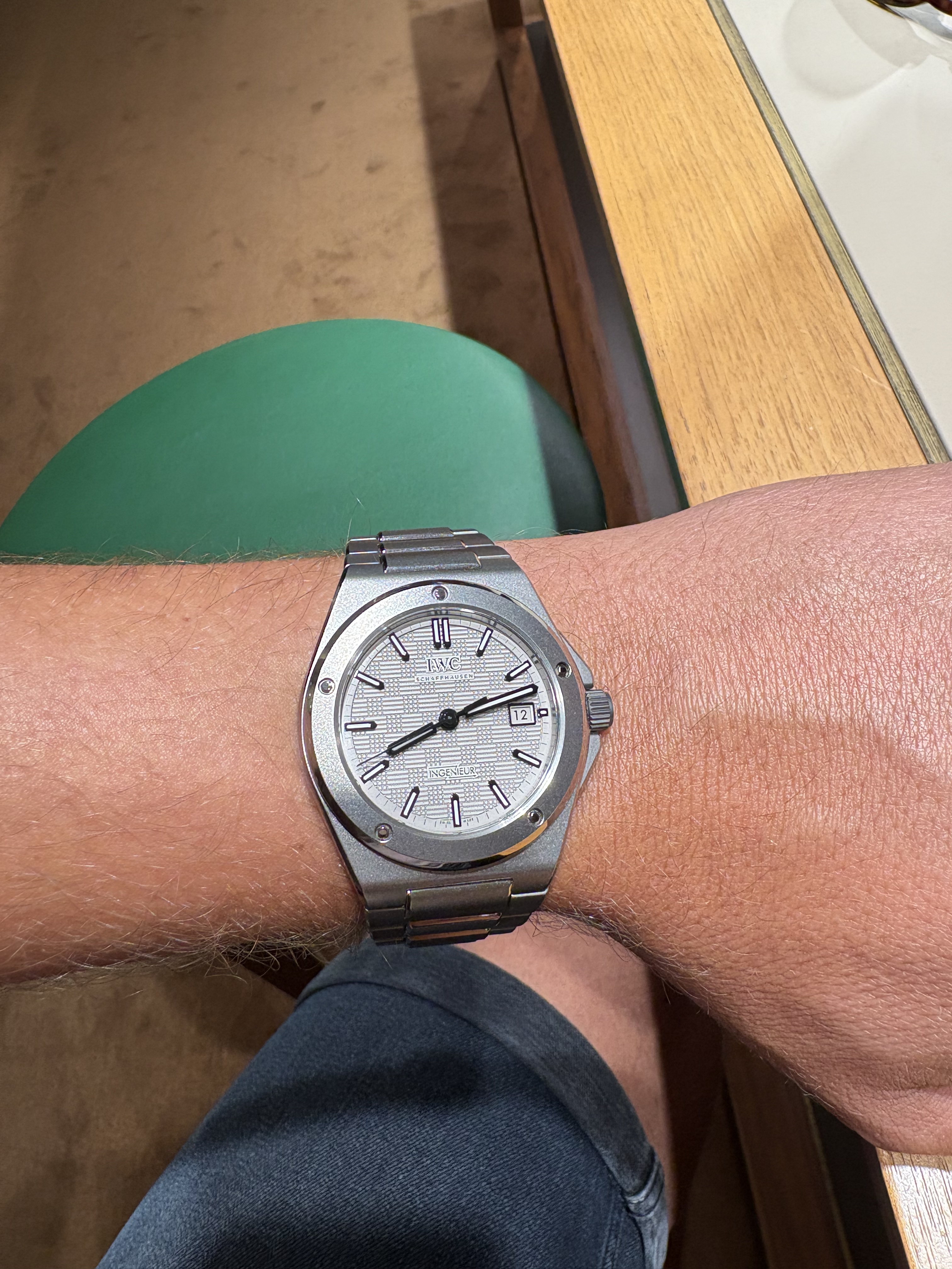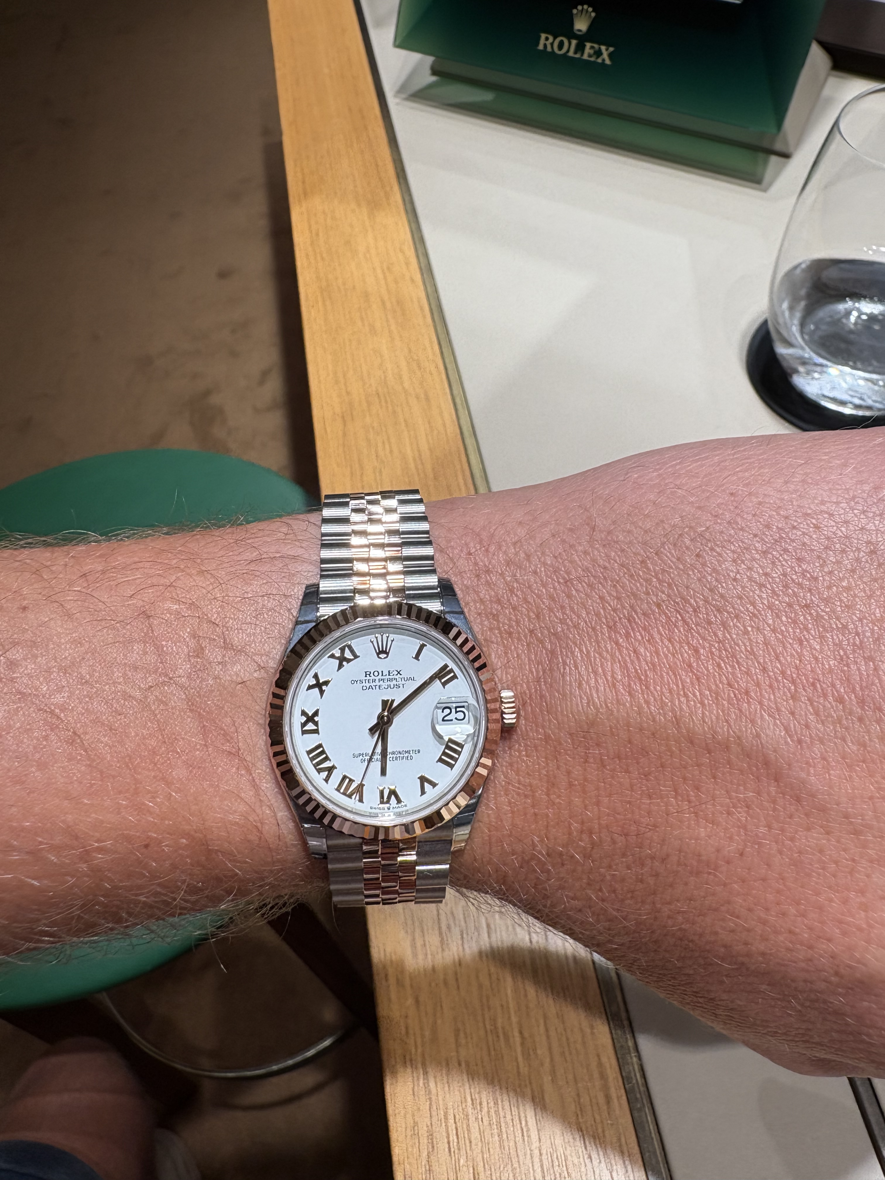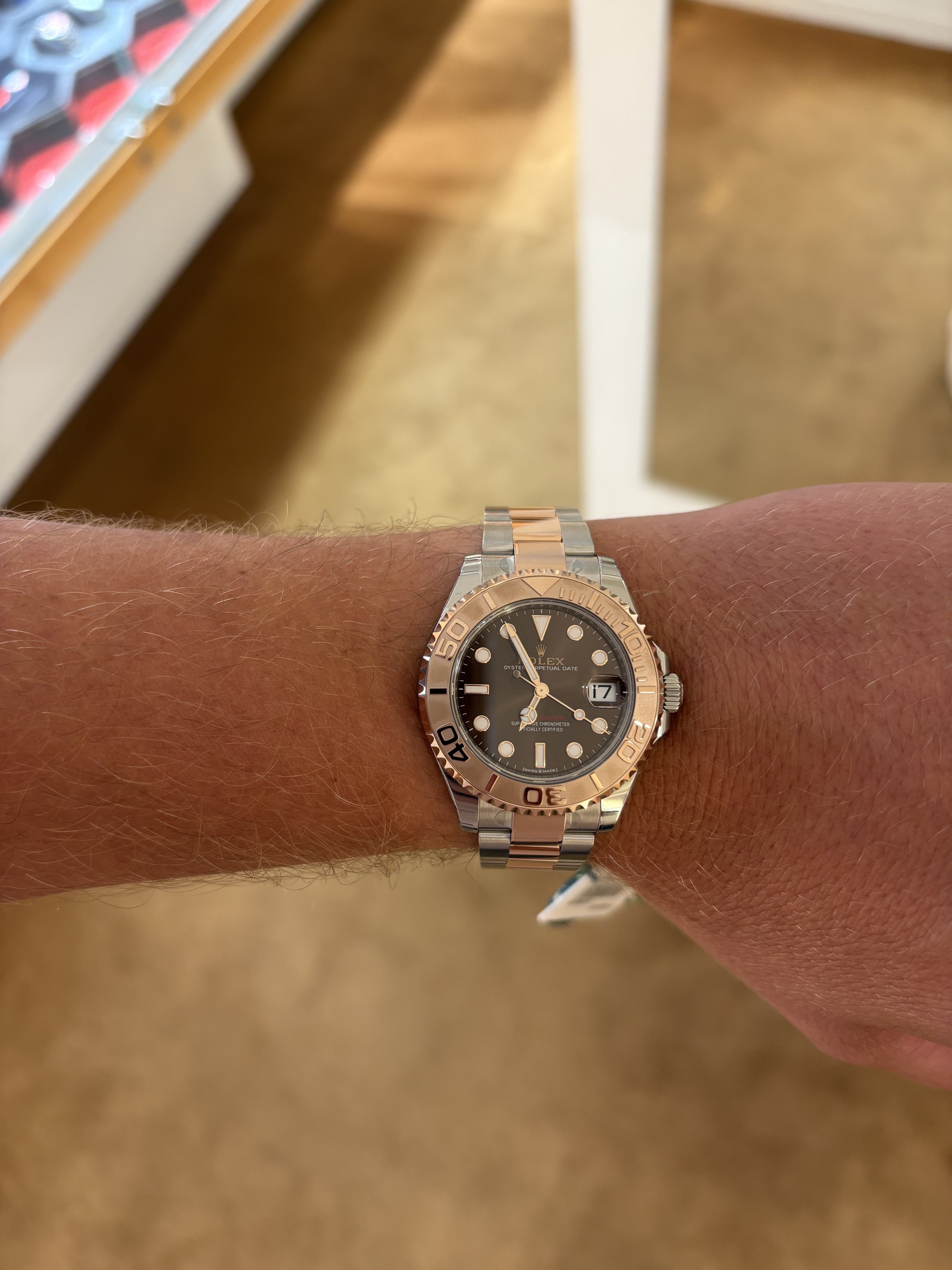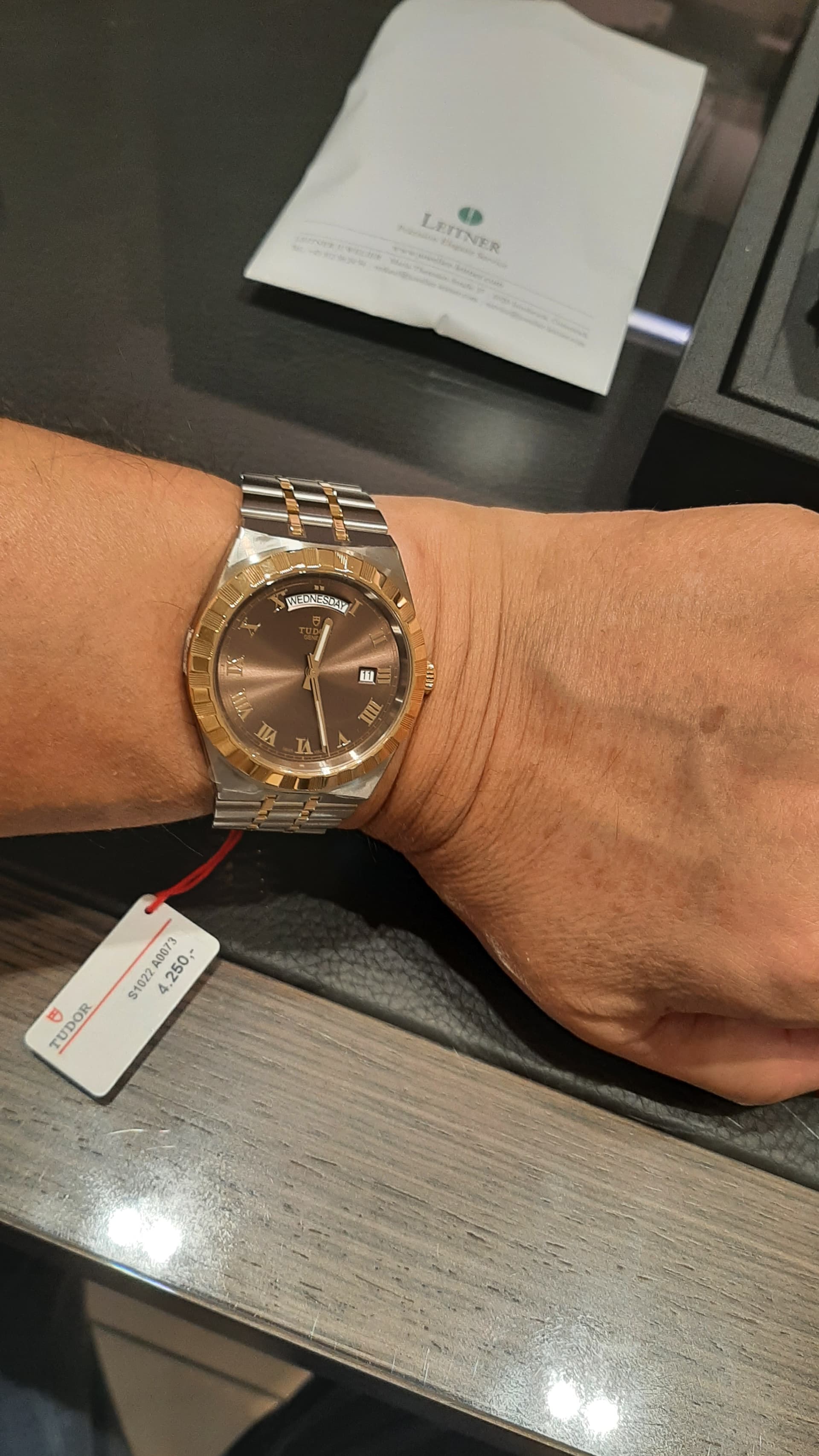 Gelijk maar wat horloges gepast. Uiteraard weer de beige Rolex OP omgehad, maar ook op aanraden van de verkoper een Tudor Royal 41 S&G met chocoladebruine wijzerplaat. Die heeft me eerlijk gezegd erg verrast; dun, draagt fantastisch en een hele mooie en klassieke combi.