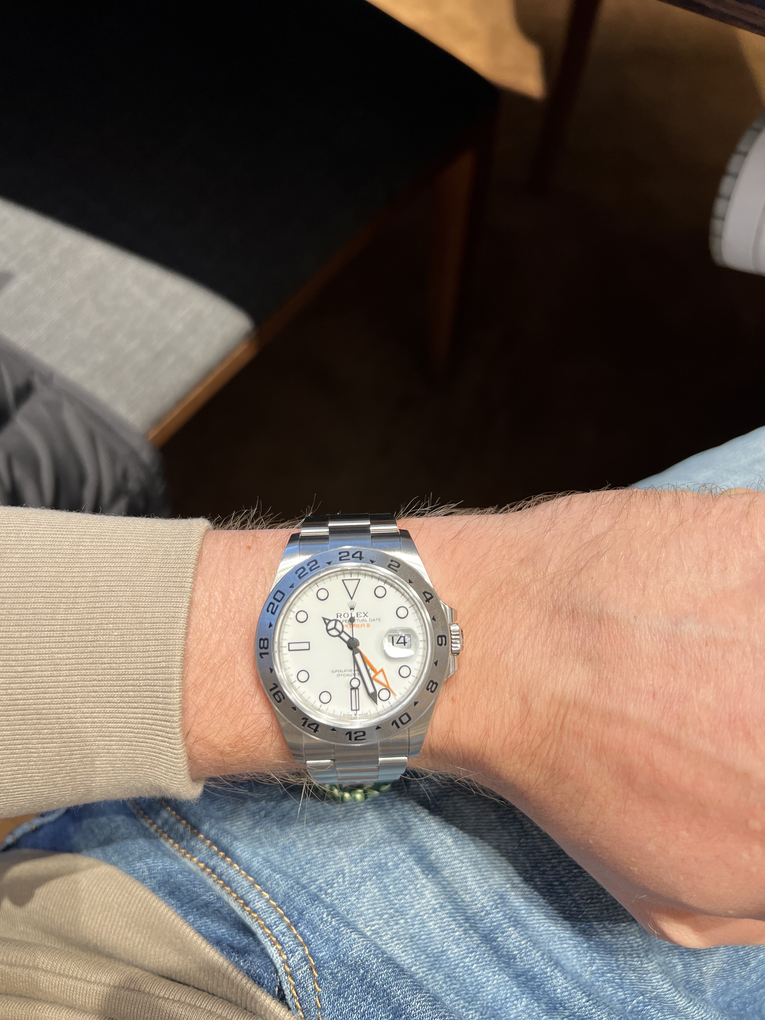 En daarna nog eens bij de Rolex AD langsgegaan omdat ik misschien op langere termijn een klassiekere professional overweeg. De explorer II met zwarte wijzerplaat was niet mijn ding, de gewone explorer in grotere uitvoering daarentegen vond ik wel heeel aangenaam dragen.