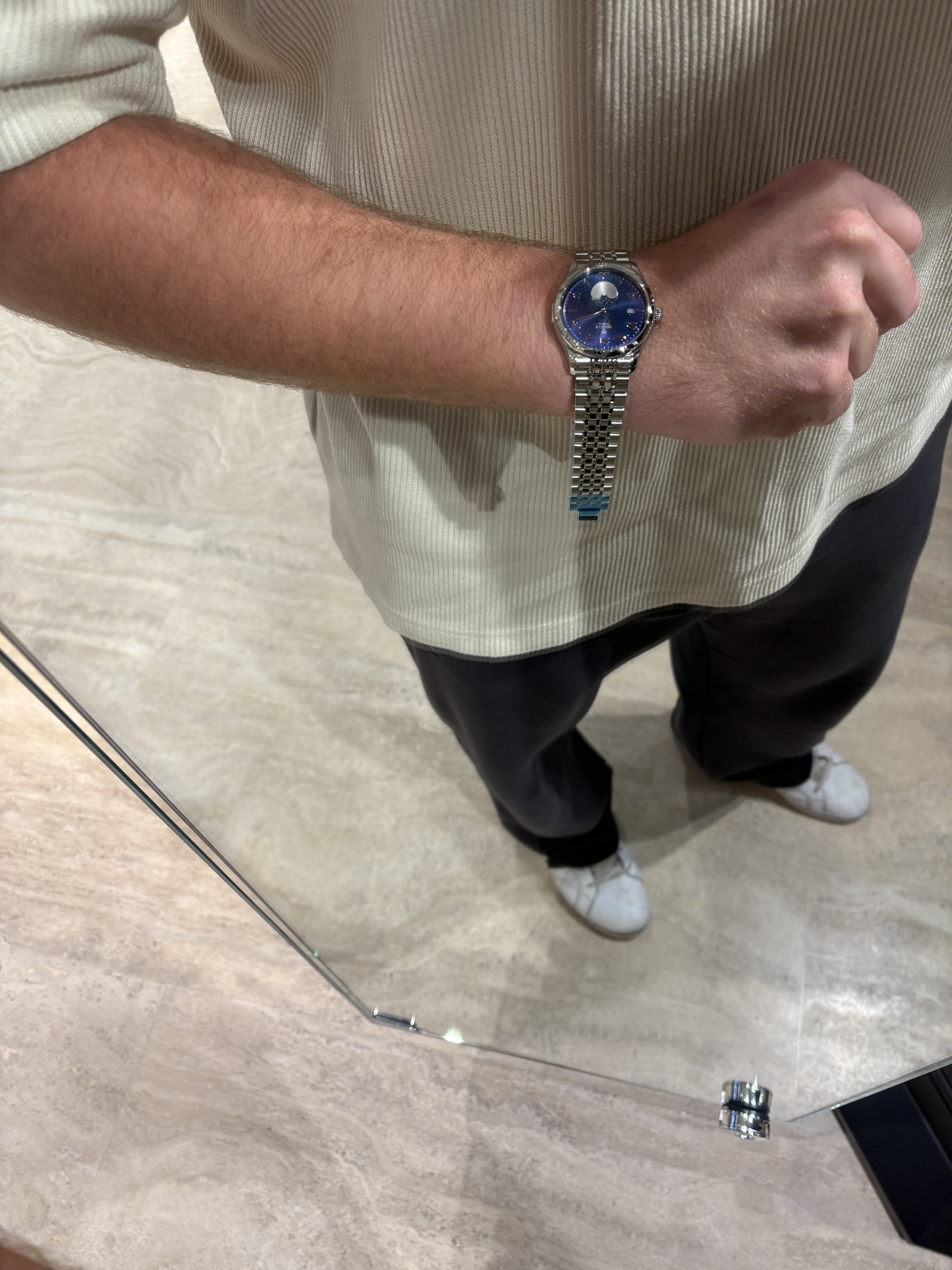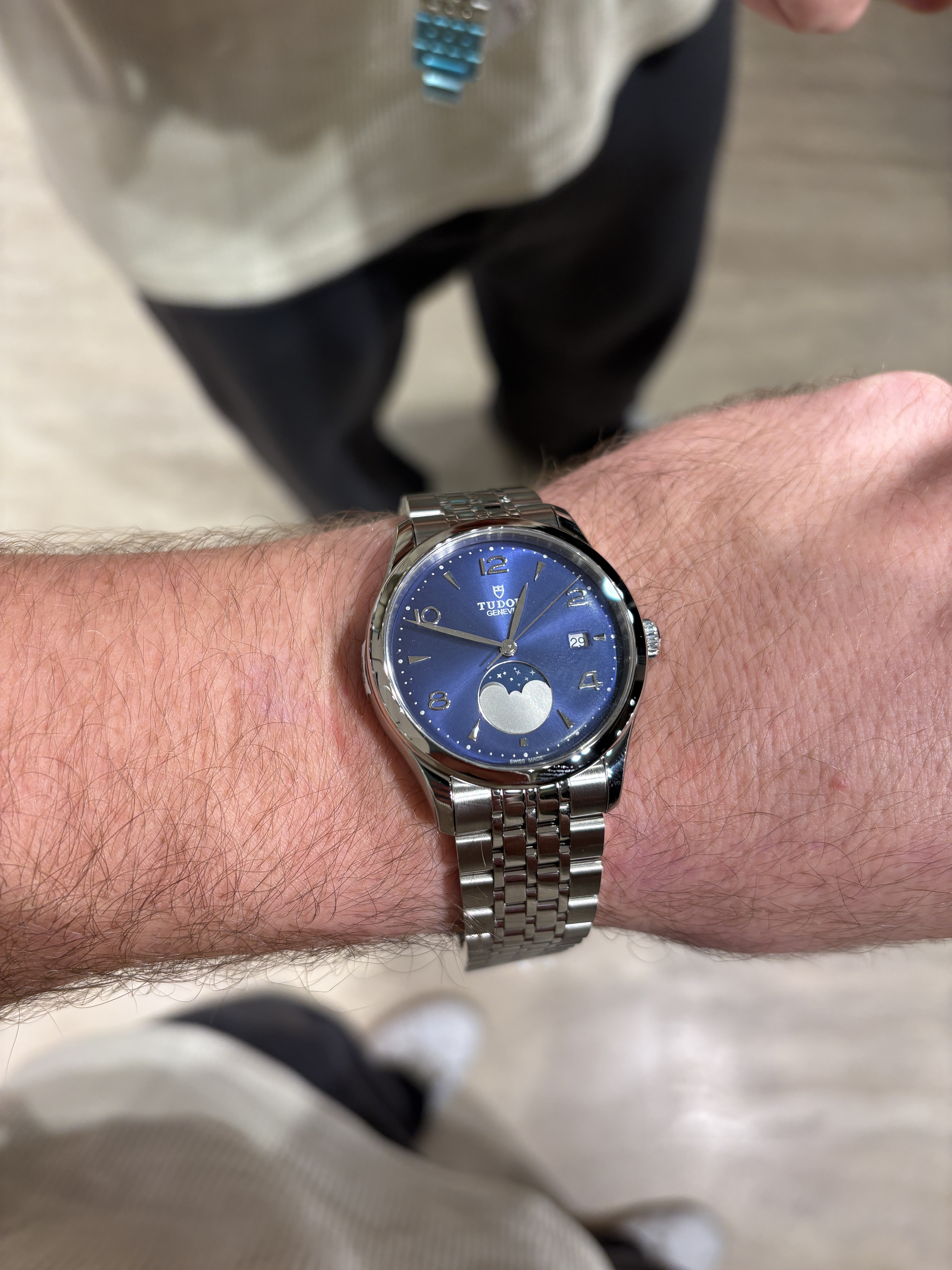 De nieuwe Tudor 1926 Luna gaan passen. Wou hem graag in goud passen omdat bij de andere kleuren het “niertje” in de moonphase dezelfde kleur heeft dan de maan, en dat vind ik er een beetje raar uitzien. De gouden variant komt veel mooier uit imo. Maar de band en de kast voelt wel heel degelijk en goed. Enkel het date window vond ik ook maar meh afgewerkt. Al bij al mooi, maar voor mij zeker niet in deze kleur.