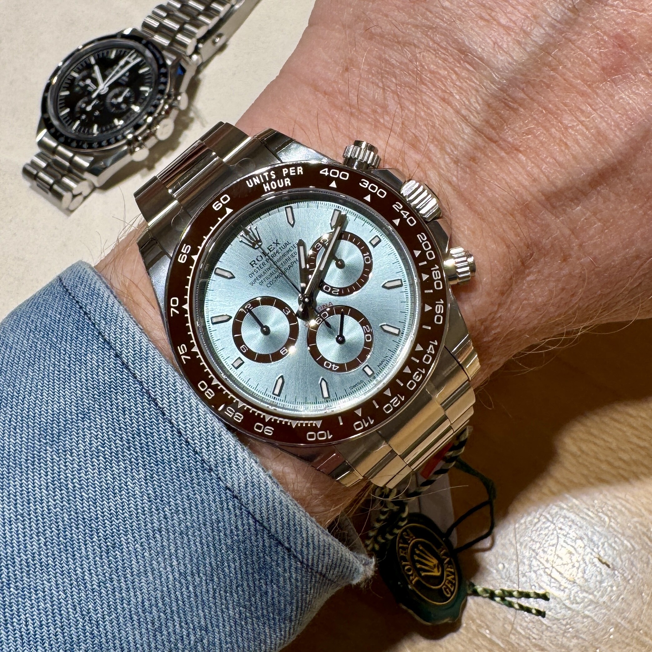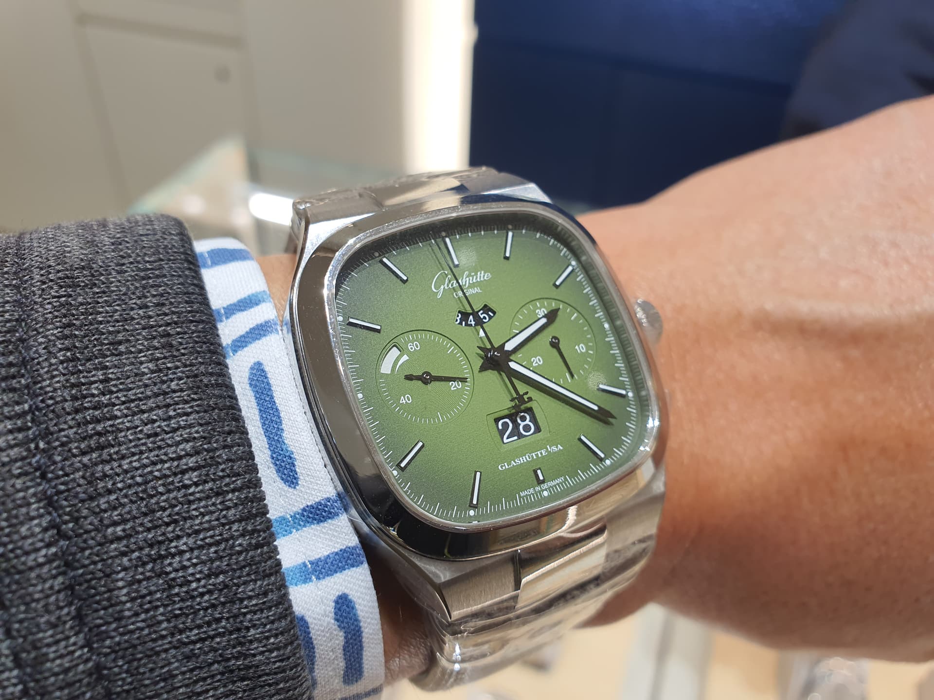 Ik was vorige week in Amerika voor werk en heb nog even snel wat dikke jongens om mn pols kunnen doen. Die Glashutte 70s chrono in het groen bleef het meest in mn gedachte hangen, het is echt wel een verschijning maar door de retro looks een beetje understated. De small seconds Omega doet me ook nog steeds goed. Altijd goed om weer even in de snoepwinkel te kijken ![]()