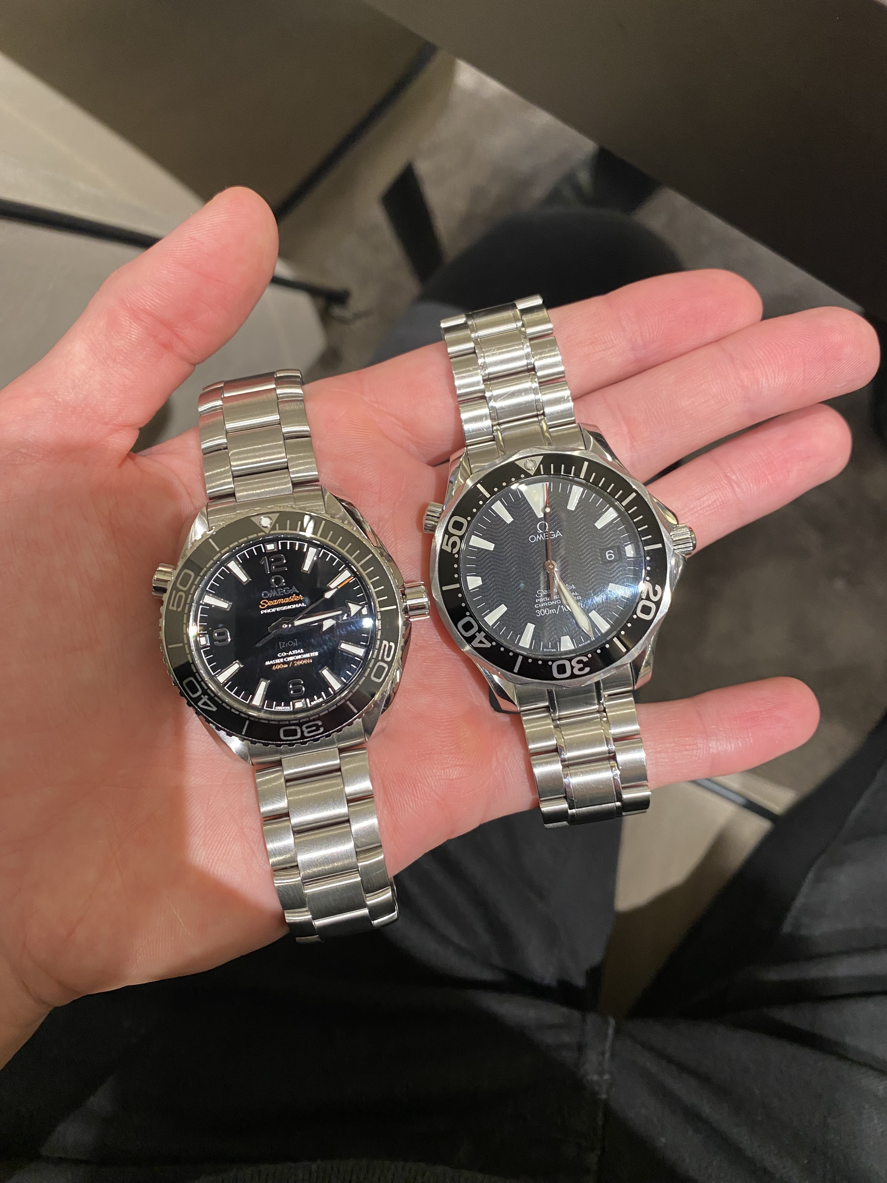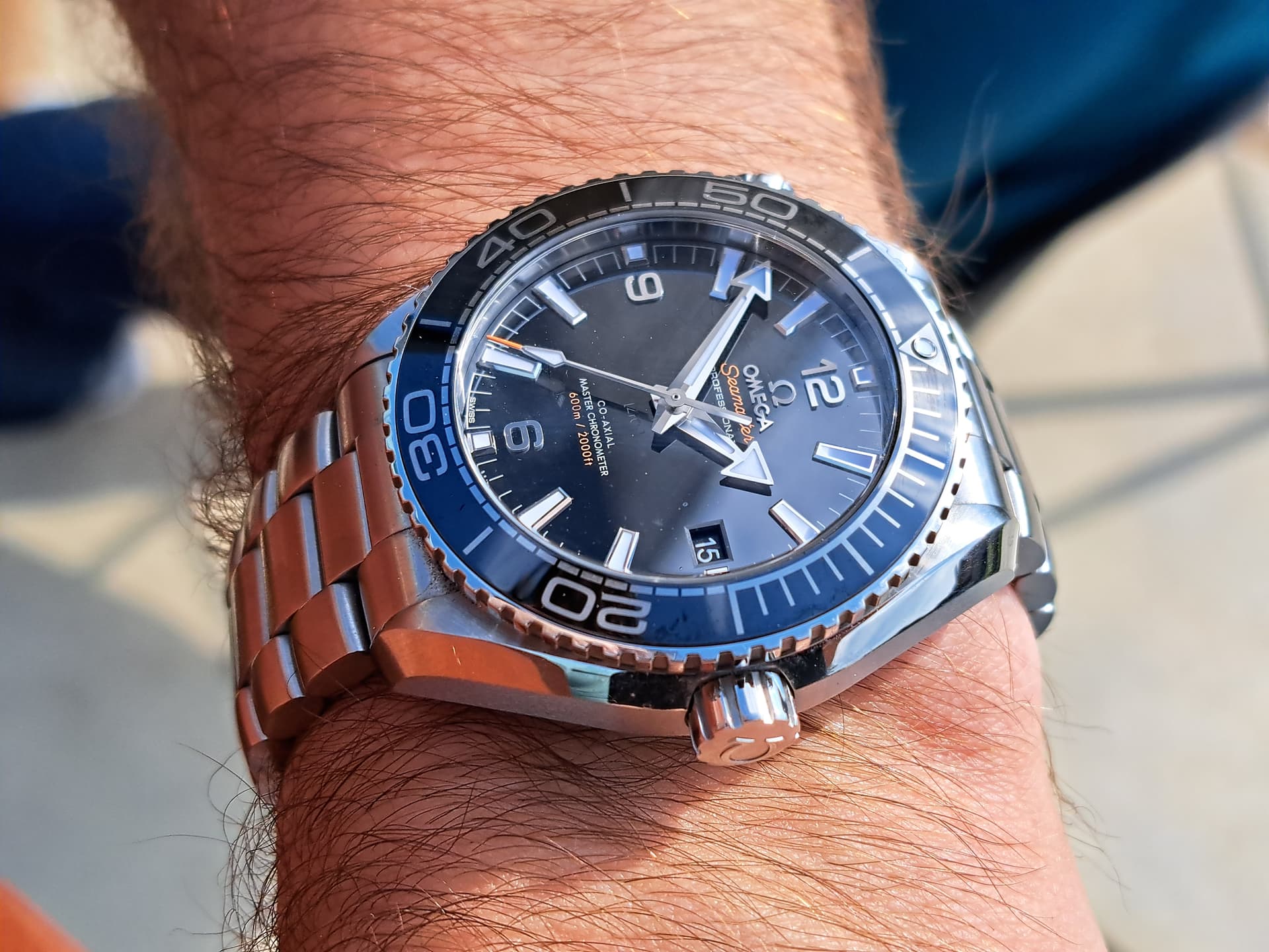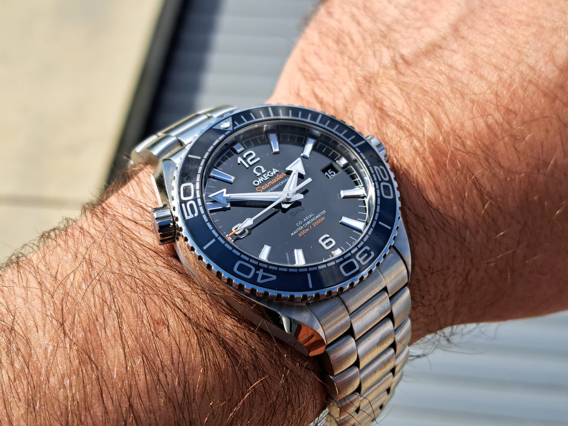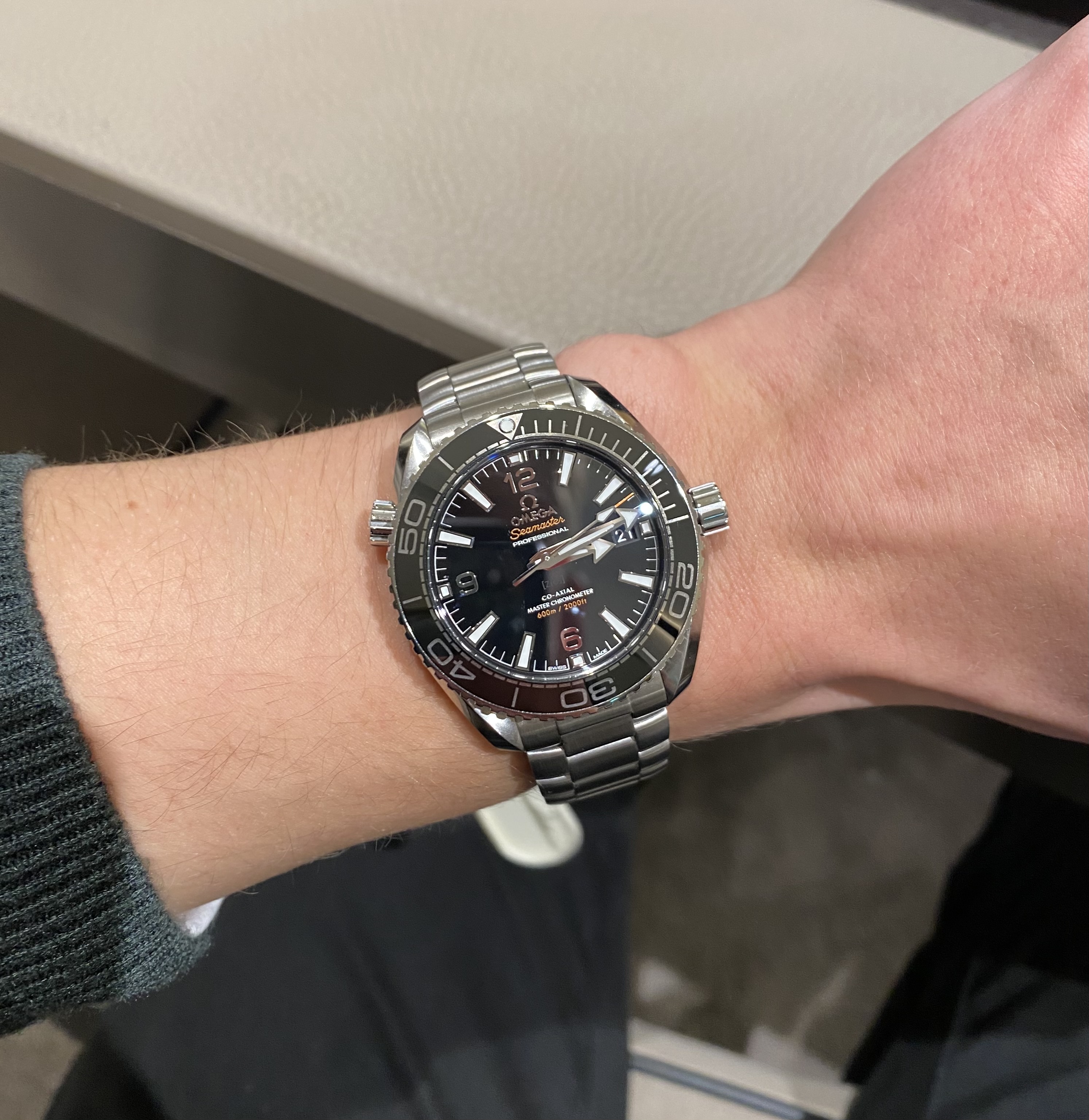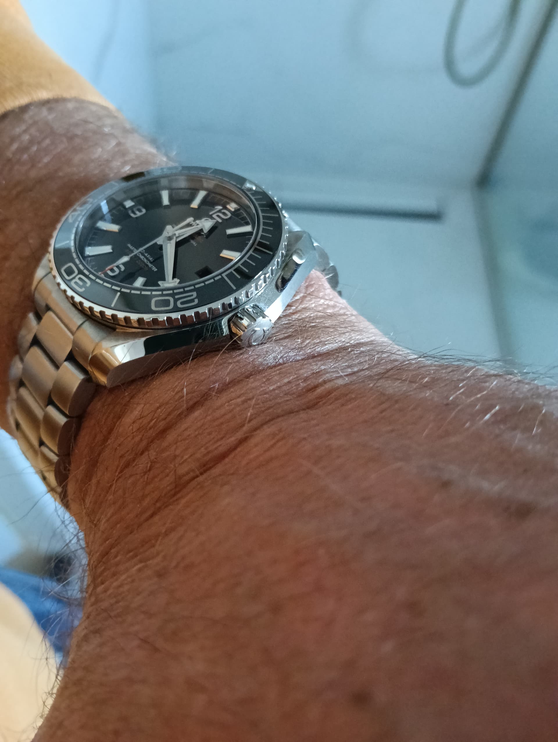 Gisteren de Omega PO 39,5 mm nog eens gepast, nadat de foto’s van @Pasd mij enthousiast hadden gemaakt voor dit model. Ik blijf het toch een vreemd ding vinden qua verhoudingen. De band is vrij smal (19 mm) en de kast vrij dik (14,2 mm). 14,2 mm hoeft zeker niet té dik te zijn voor een duiker, maar i.c.m. de korte lug to lug van 45 mm staat het wat vreemd. Een Rolex 16600 bijv is nog iets dikker, maar komt minder ‘chubby’ over door de langere lug to lug van 48mm. De wijzerplaat vond ik ook erg druk.