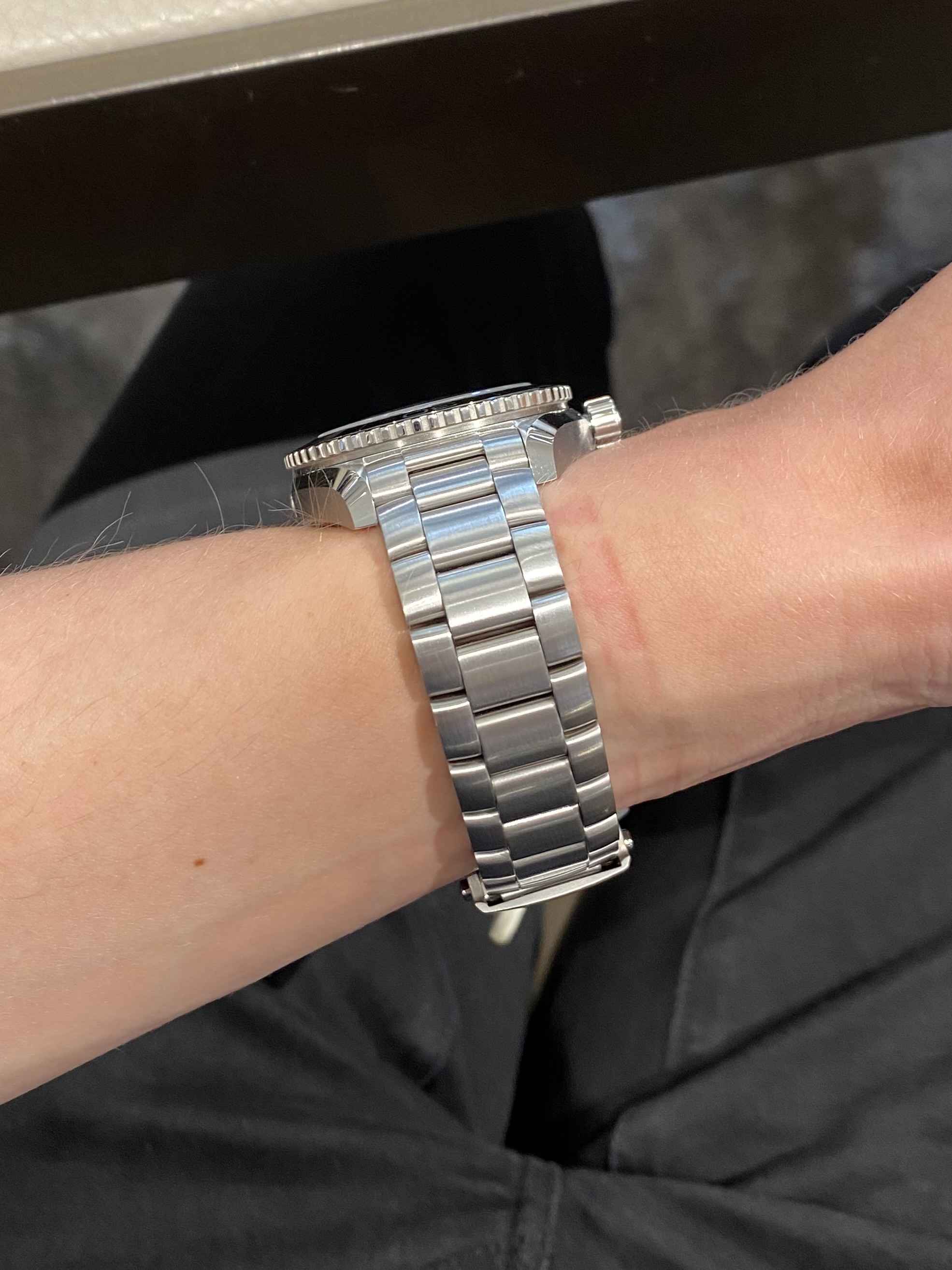 Hier een andere foto. Het horloge lag los op de pols en de belichting is een crime. Ga vooral passen zou ik zeggen.