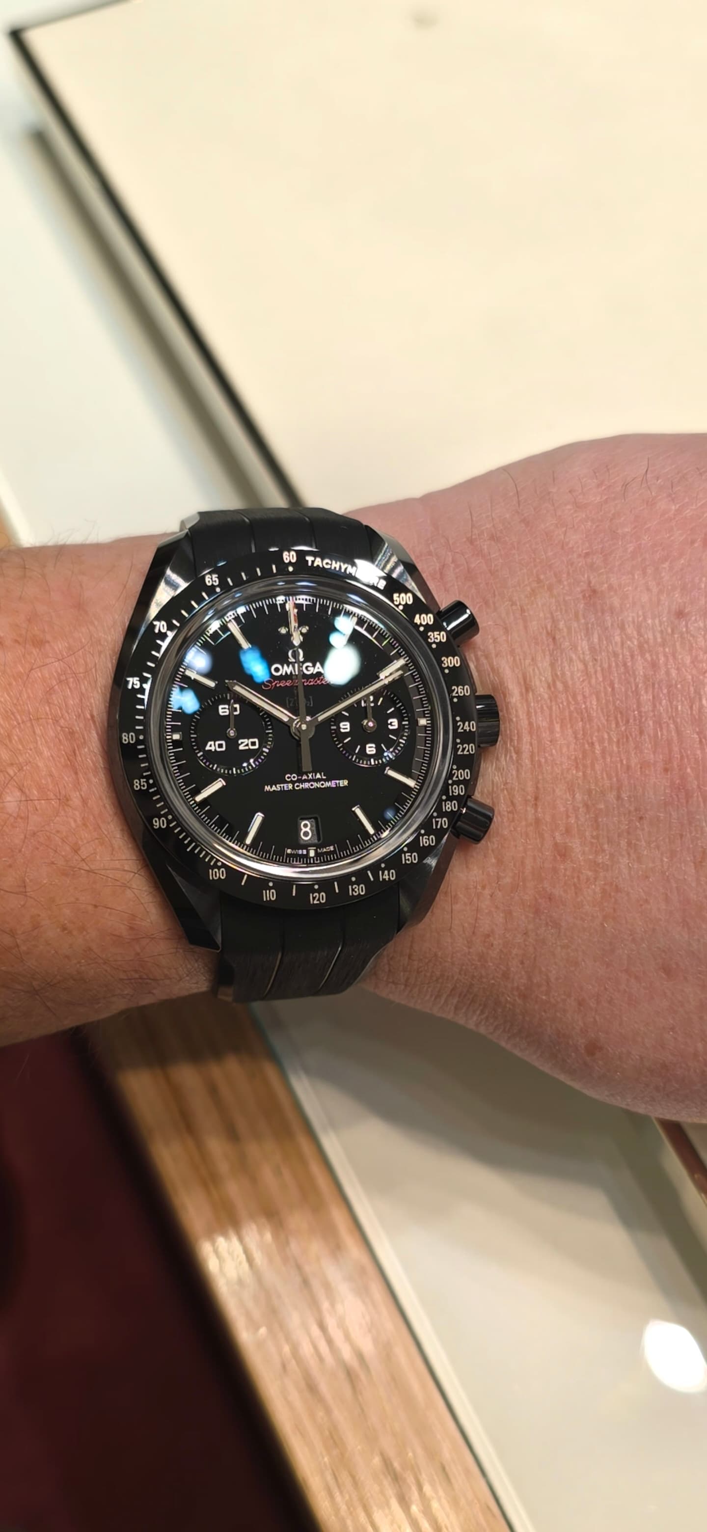 De Aquaracer 200 had ik al wel 'ns omgehad. Maar bij de AR300 hielden de maten, op papier, me altijd tegen. Omdat deze groene GMT zo mooi lag te glimmen, in de etalage, toch maar 'ns geprobeerd.