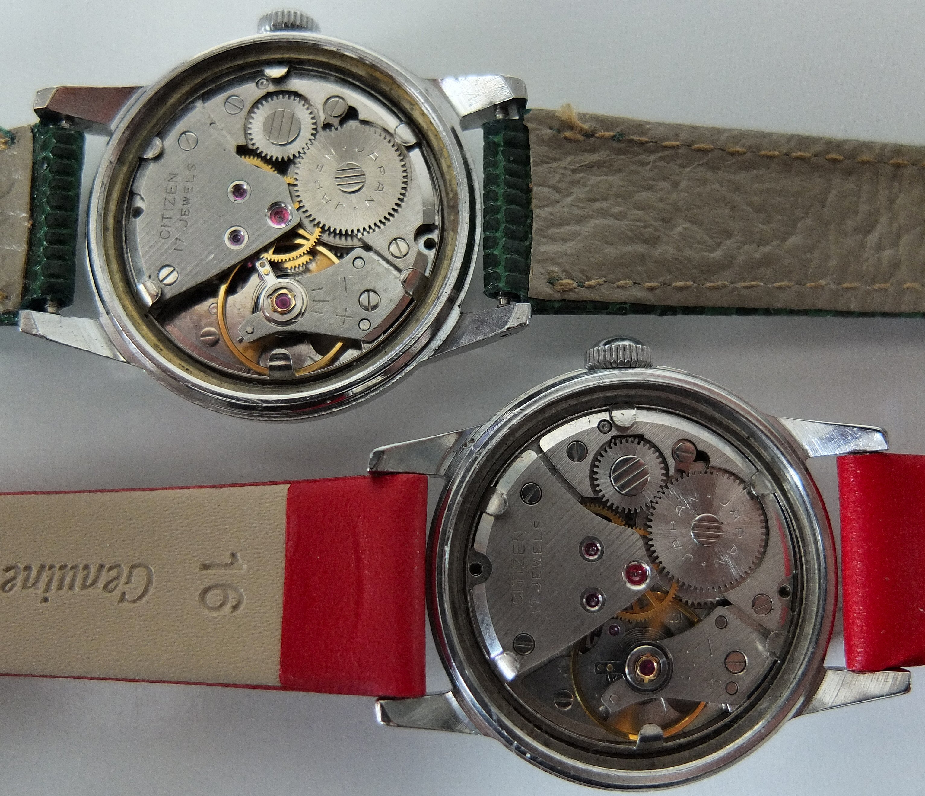 Geen twins, eerder vader-zoon met bijna 25 jaar verschil. Ook een verschil is het ETA 2401-2 28.800 bps vs H50 (Powermatic 80) 21.600 bps hart. De creme-kleurige wijzers van het eerste type zijn beduidend mooier.