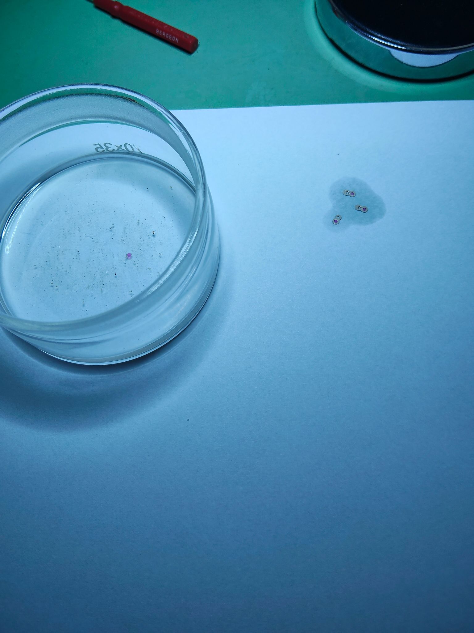 Ik gebruik een a4’tje voor de steentjes, ik zet een streep hexaan over het papier en een steentje onder mijn vinger en haal het over de hexaan. Het is heel makkelijk schoon te maken; hexaan vervliegt razendsnel.
