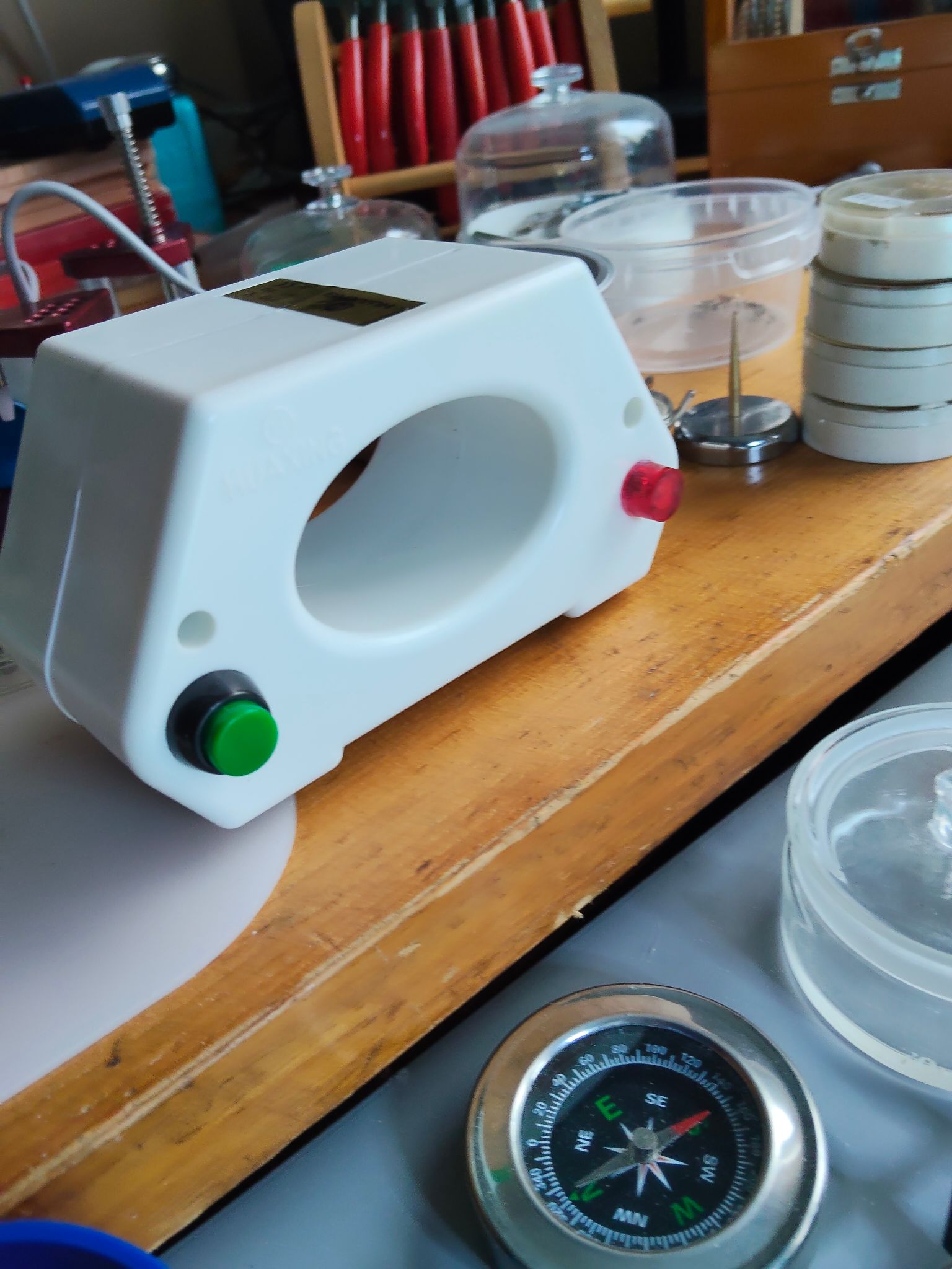 Dit is mijn nieuwe demagnetiseer-apparaatje. Ik was over die blauwe niet tevreden; ik kreeg mijn pincet van Dumond maar slecht gedemagnetiseerd. Nu werkt het wel en ben ik dan ook tevreden over deze uitvoering, van AliExpress voor 15 euro, dacht ik.