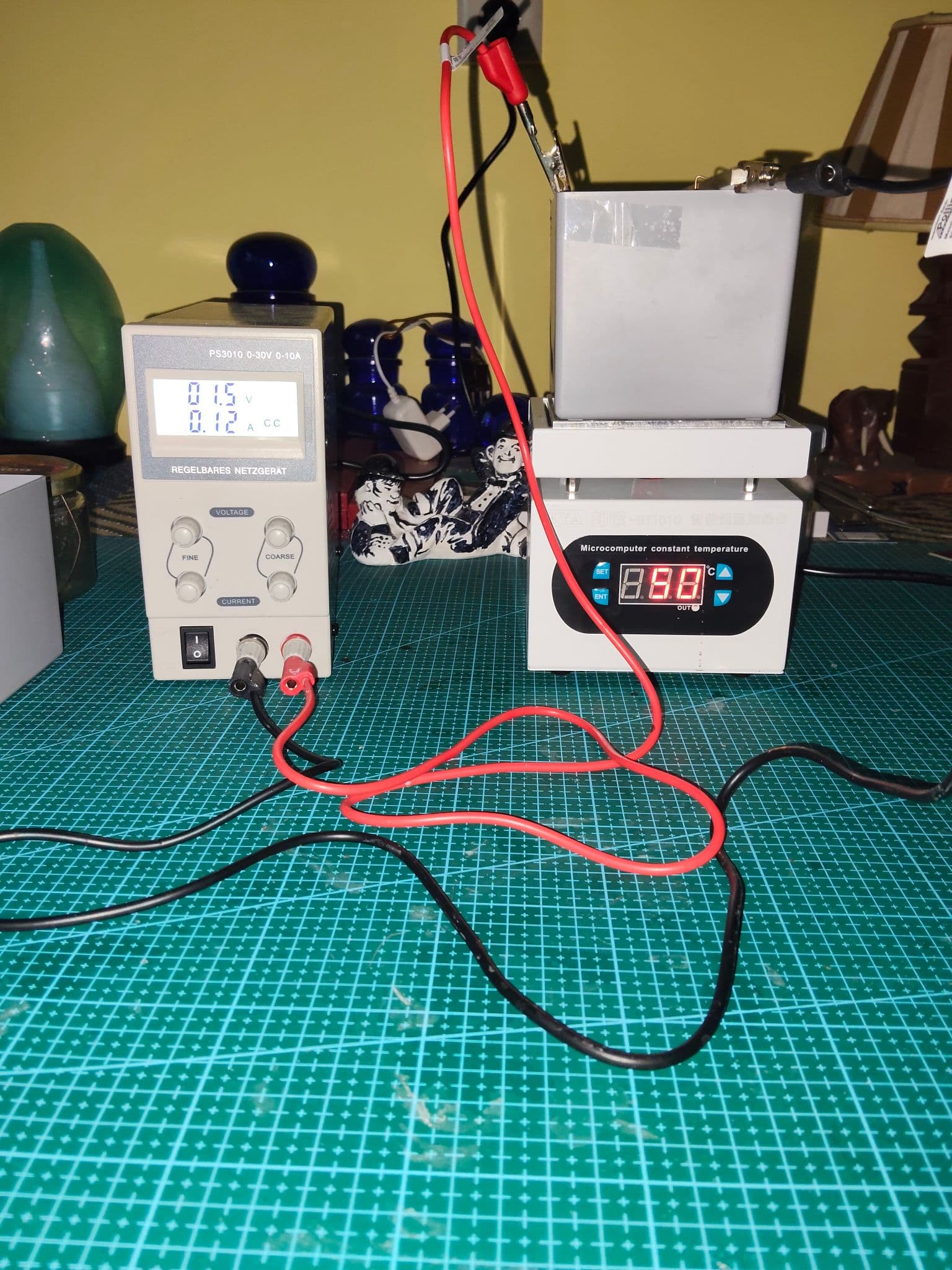 Volgens wat ik heb gelezen zou het tussen de 0.08 en 0.15 amp. goed zijn en daarbij 0.6 a 0.9 volt ideaal zijn. Ik kreeg het niet op 0.6 volt zonder dat de amp te hoog zou worden, dus heb ik het met deze afstelling gedaan. Omdat de ampère belangrijk is en voltage minder van belang is, heb ik het zo gedaan.