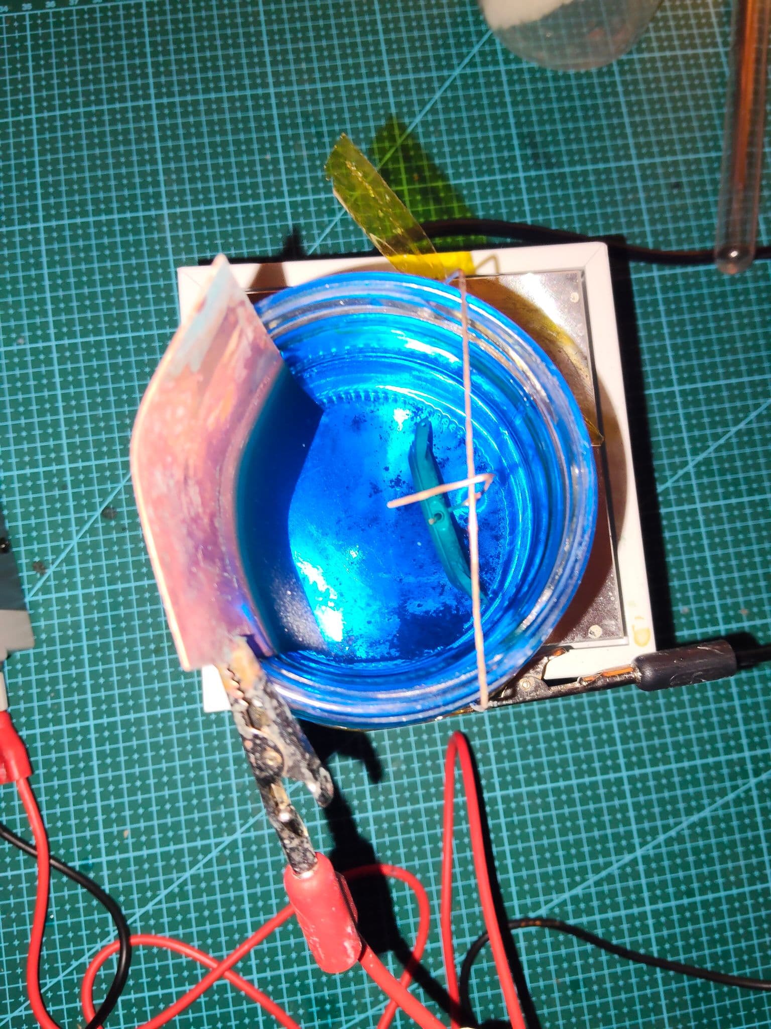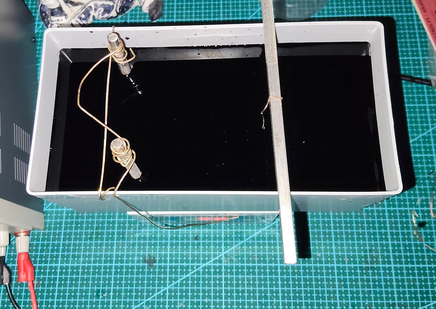 Chroombad is op temperatuur en alles is verder klaar voor het proces, alles aangesloten, dan langzaam de kast in het bad laten zakken, en direct de stroom goed afstellen. Hou het tussen 0.04 en 0.07 ampère; volt blijft op 0 is minder van belang. Het is erg belangrijk als je lagen gaat opbouwen de koperlaag niet te verbranden tijdens het proces, dus de ampère laag en constant houden.