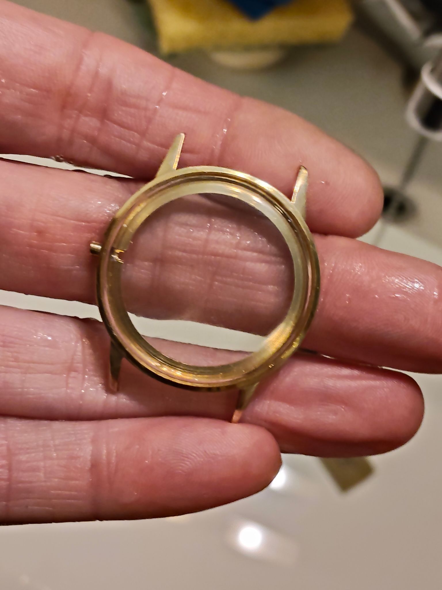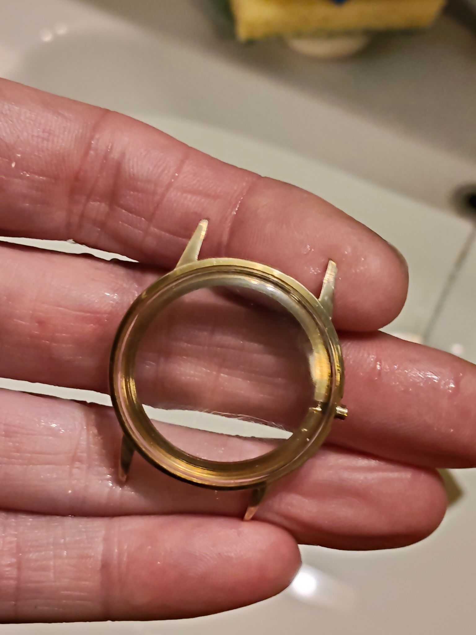 Ik heb de lugs geschuurd, zodat er een mooie, gladde overgang is naar het goud dat er nog opzit. Het hoeft niet per se helemaal eraf geschuurd te worden.