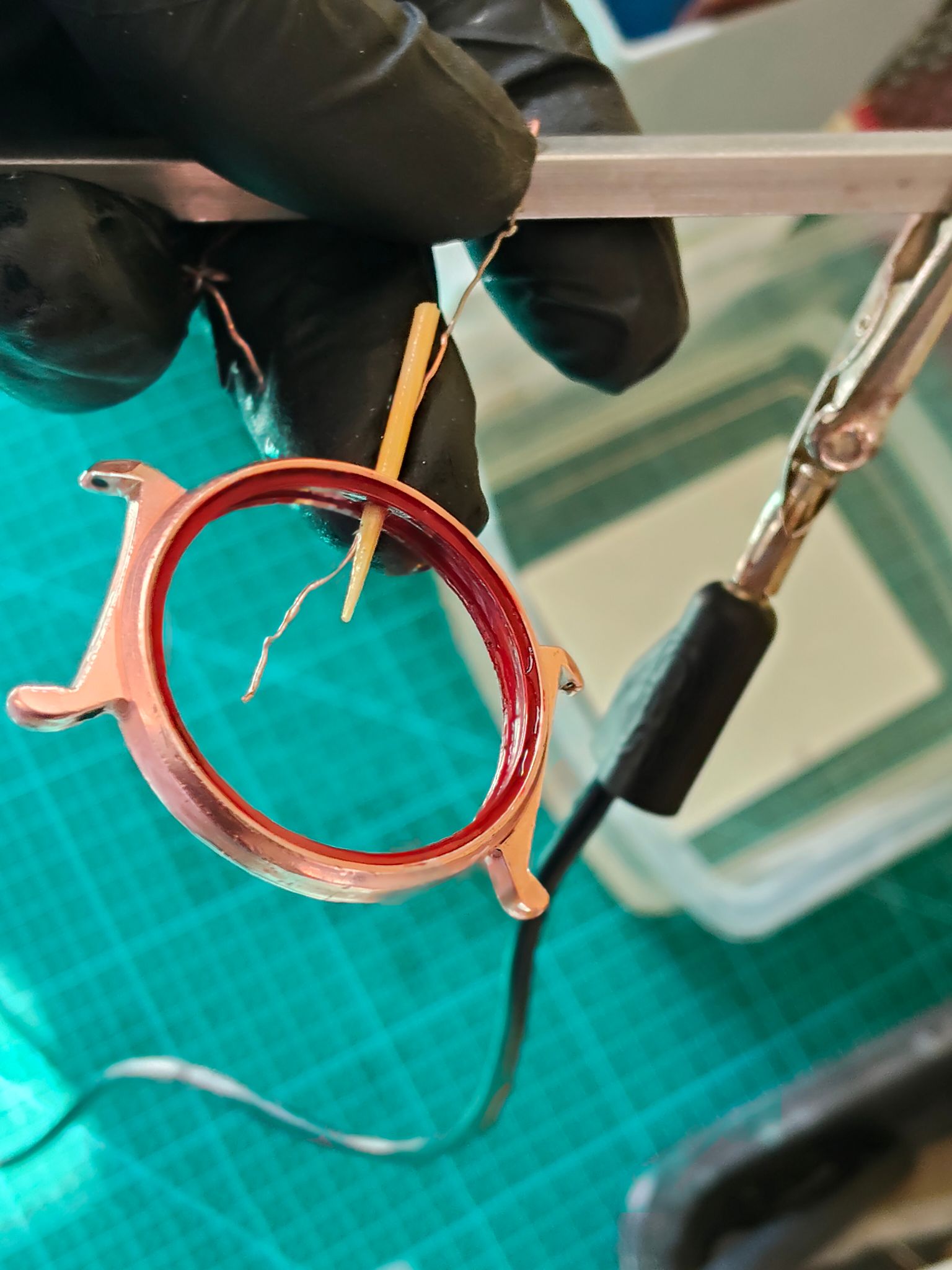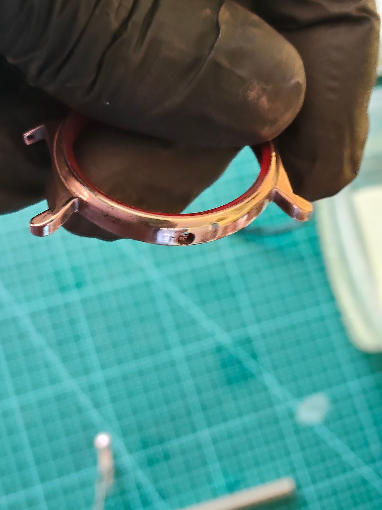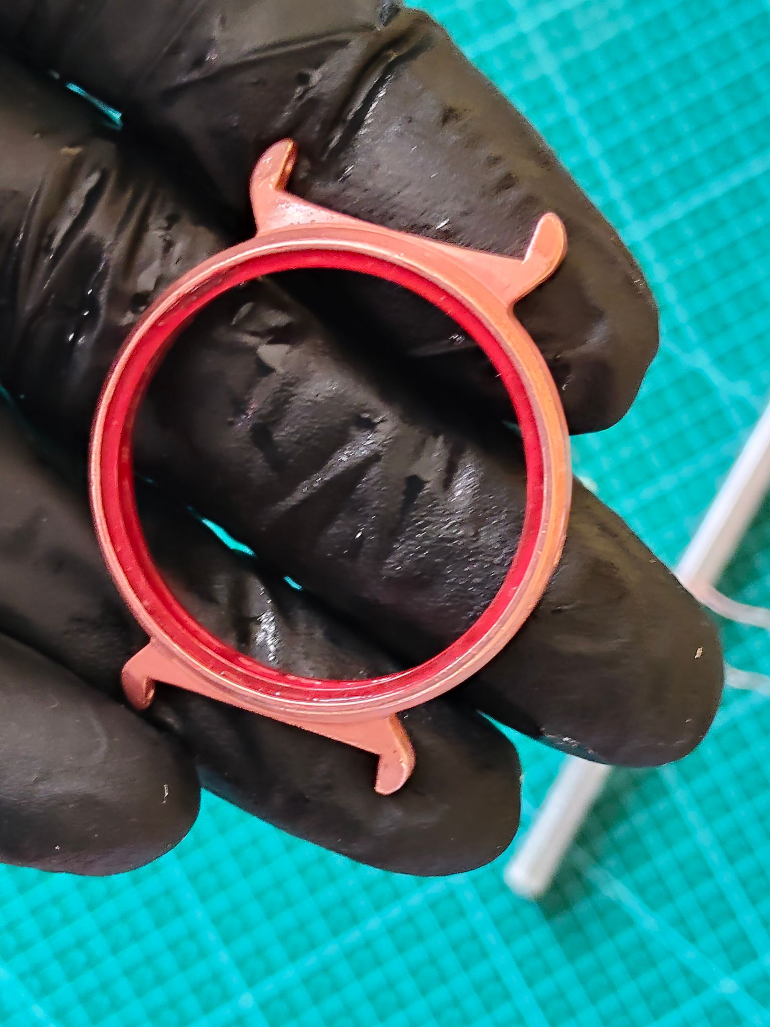 Dus ik heb toen gelijk het horloge weer uit elkaar gehaald en alle koperlagen van de ring rond het glas verwijderd,