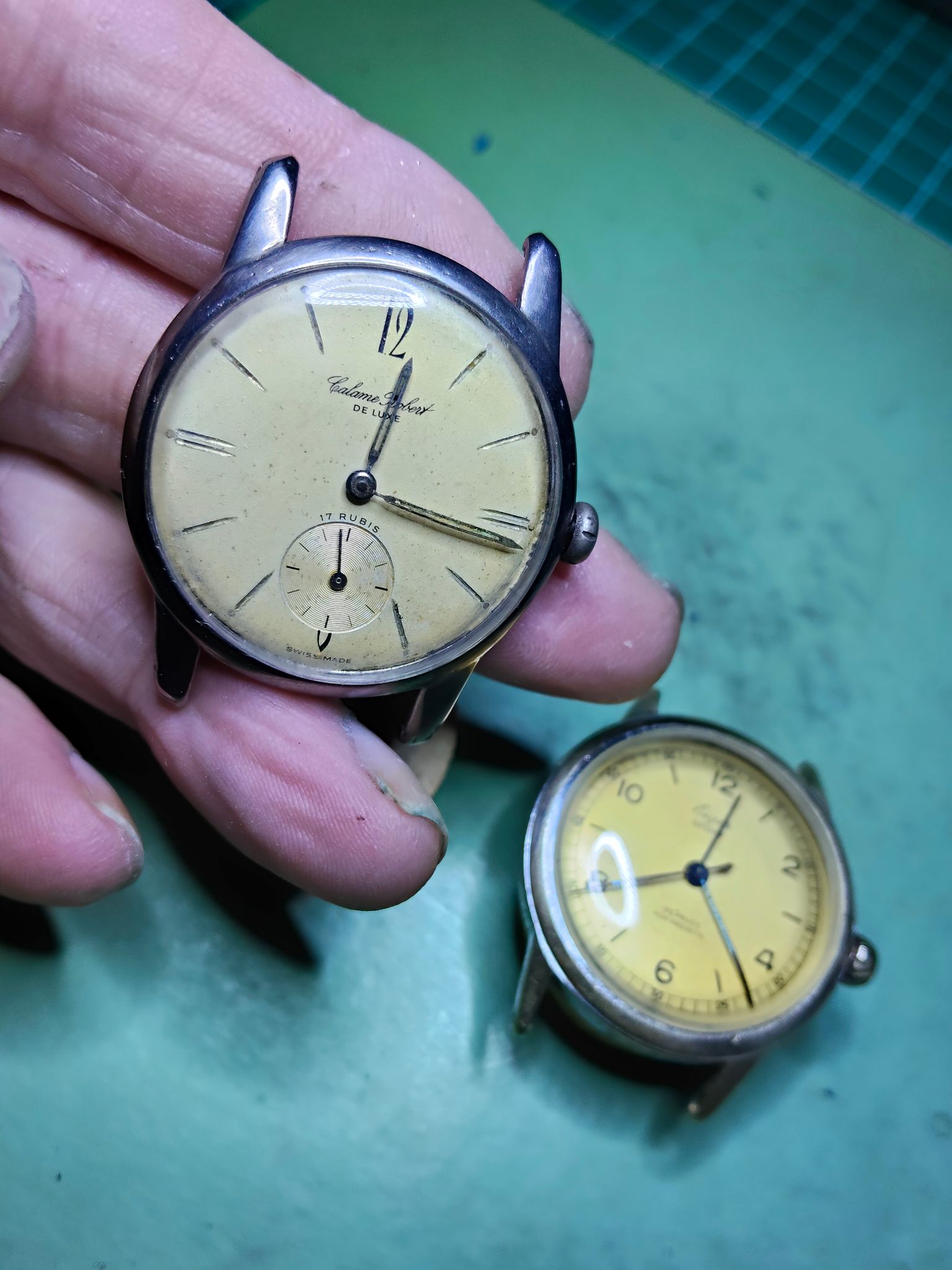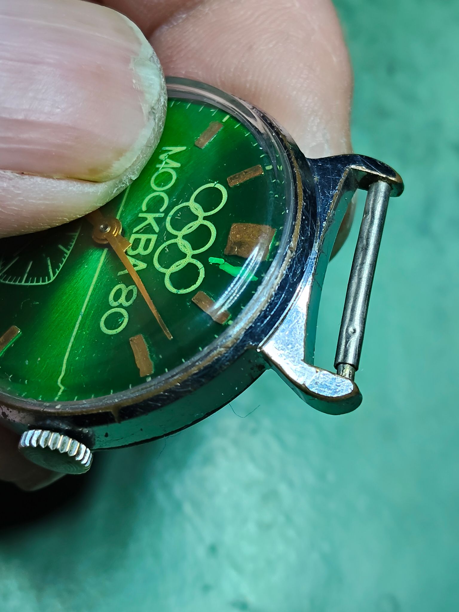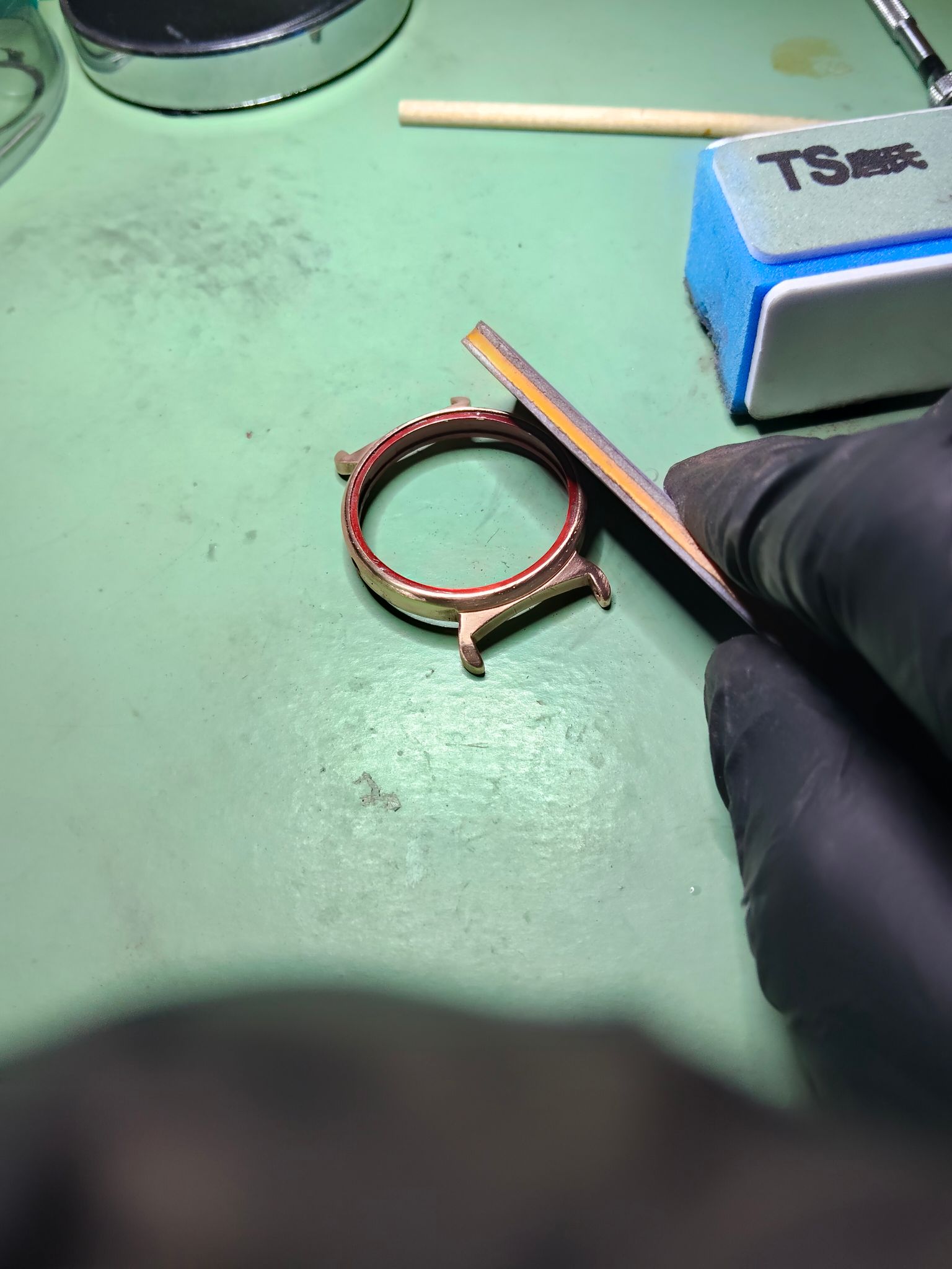 Dus ik heb toen gelijk het horloge weer uit elkaar gehaald en alle koperlagen van de ring rond het glas verwijderd,