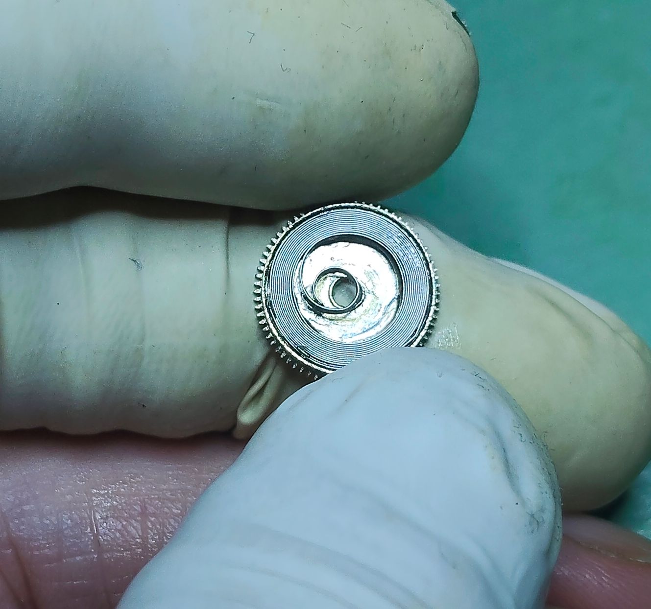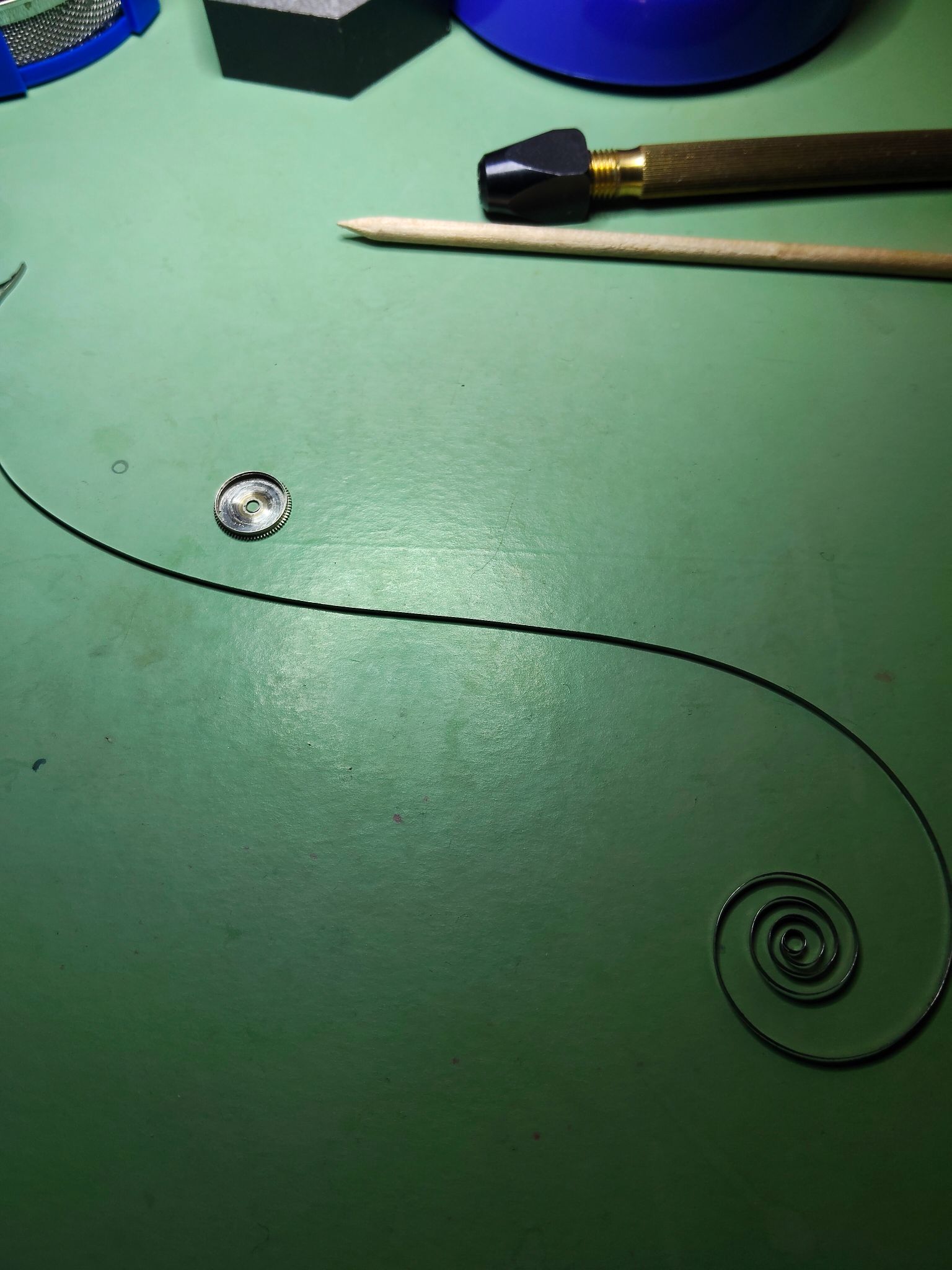Net klaar met de veerton. Het was een stuk moeilijker dan met die andere veer van Zim, dat was een slap veertje, dit was andere koek. Eerste poging mislukt, ik wist het al wel, maar ik heb doorgedraaid om te kijken waar dat T-stuk zich zou bevinden. Ik heb de veer er weer uitgehaald en opnieuw begonnen, in totaal bijna een uur mee bezig geweest. Het T-stuk lijkt smaller en de kracht van de veer zorgt ervoor dat het beginpunt telkens verschuift, maar eindelijk is het gelukt.