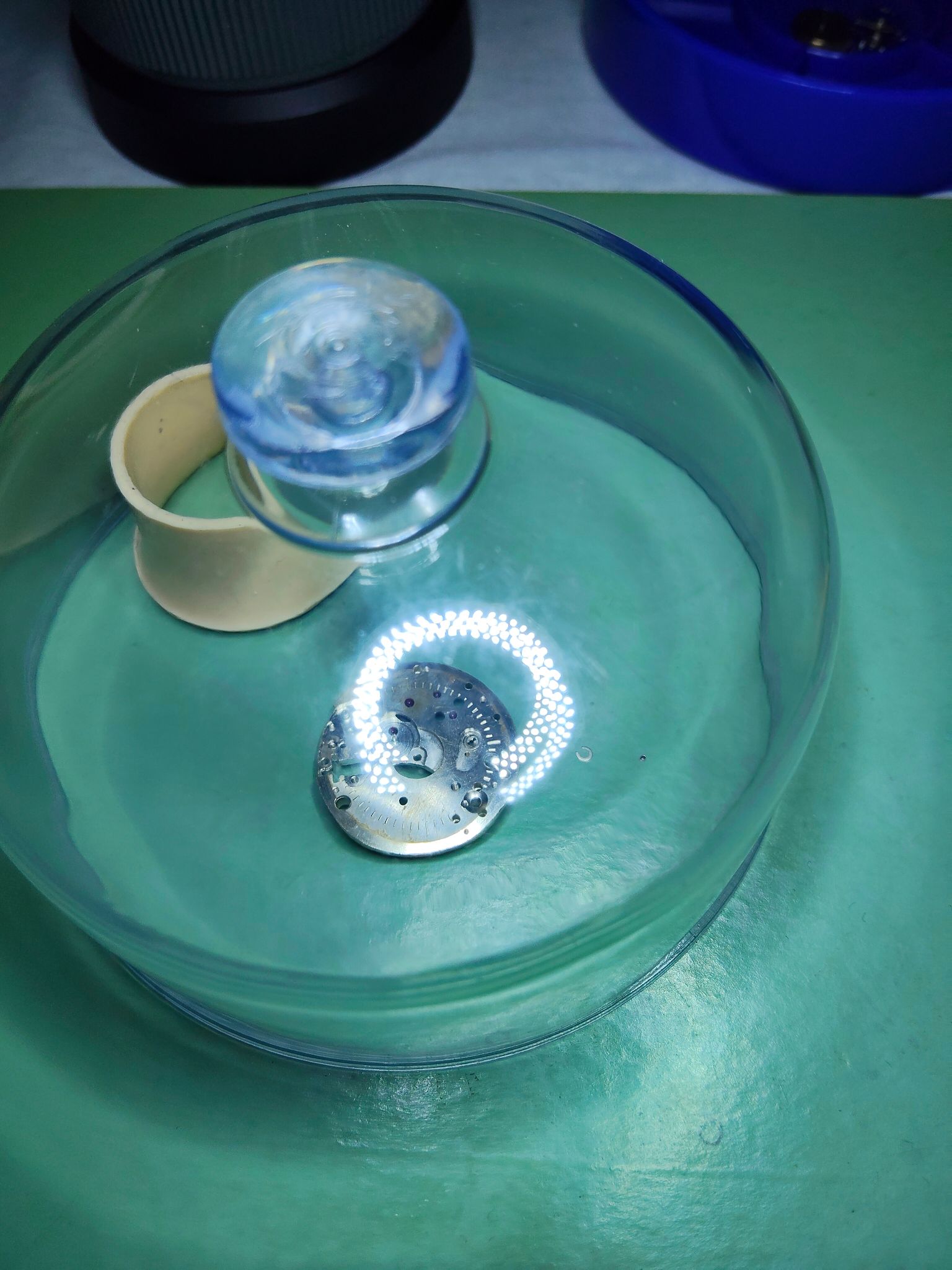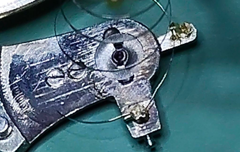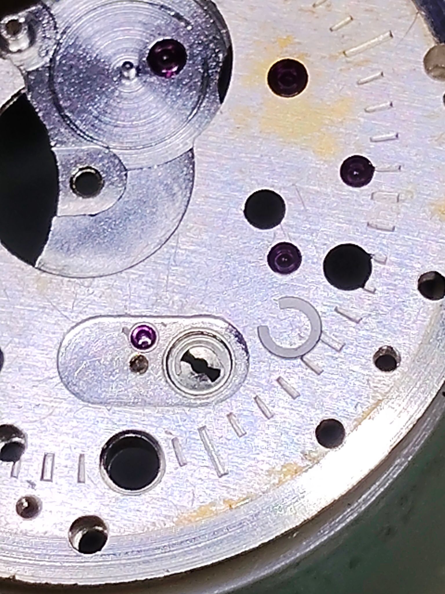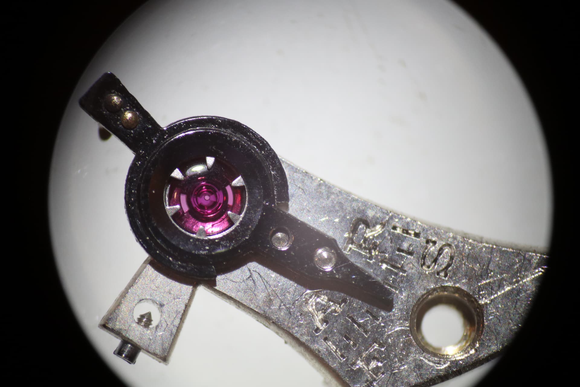 Je bedoelt de steentjes die in balanskloven zitten, maar dit is een steentje dat onder de balansas zit en ingedraaid in de chaton vastzit. Daarbovenop komt een afdekplaatje met een steentje. Normaal gesproken haal je zo’n steentje er niet uit; in dit geval is het misschien losgeraakt door de voorwas die ik heb uitgevoerd. Ik begon te twijfelen welke kant naar de plaatkant moet liggen, Eigenlijk was dat mijn vraag. Ik ben er intussen bijna zeker van dat de bolle kant naar de plaatkant moet en de andere kant, daar komt dan de balansas in te draaien. Dus ik denk bollekant naar de plaatkant.